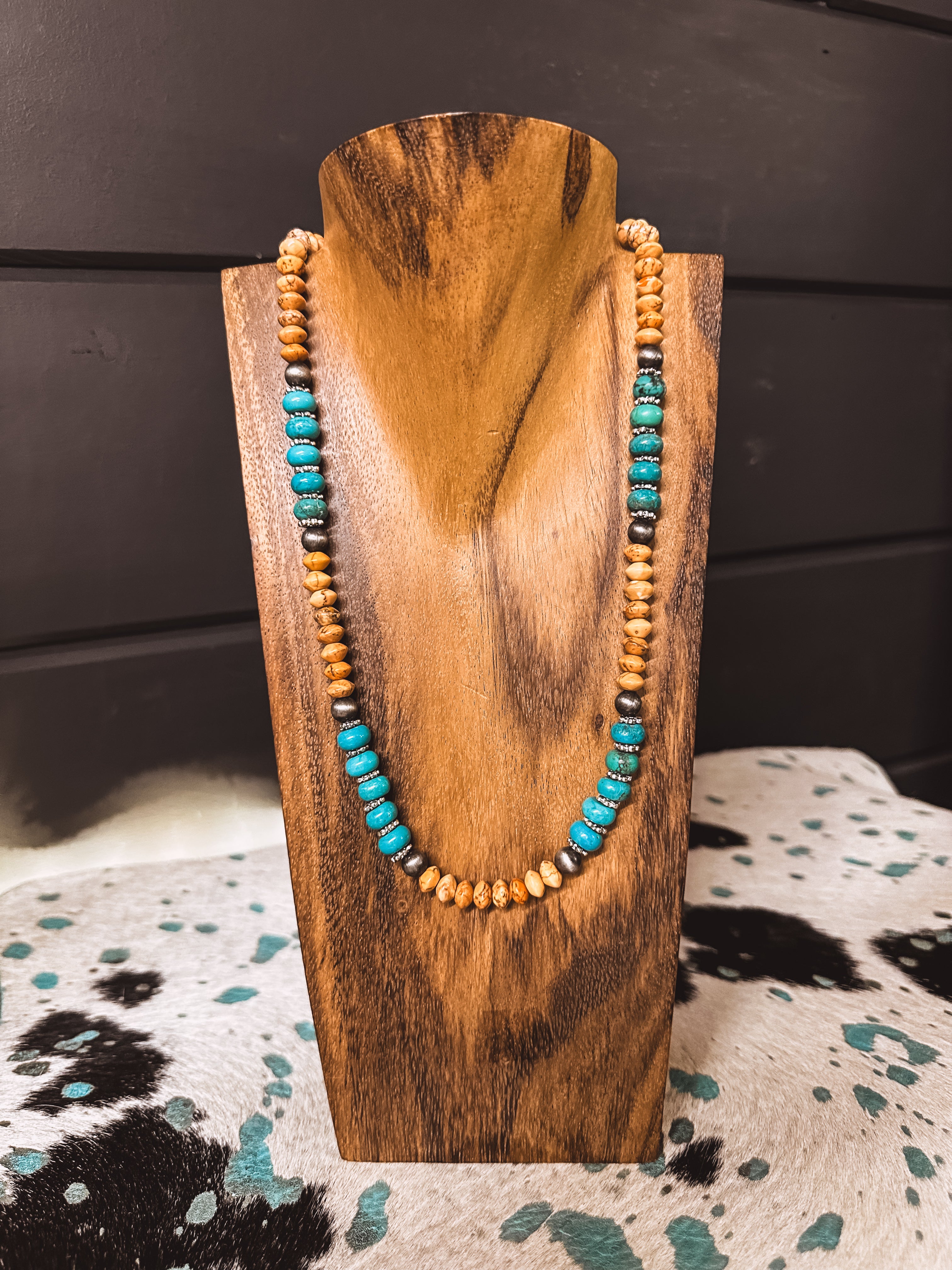 Elevate your layering game with this playful 8mm faux silver necklace, blending vibrant orange and turquoise hues inspired by the earth's treasures. Combining faux pearls, turquoise, and conch elements, it offers a bold yet affordable statement that’s perfect for mixing and matching. This necklace adds a pop of color to any outfit and brings a spirited, western vibe wherever you go. Get ready to turn heads and express your fun side with this unique, eye-catching accessory designed to brighten your day and wardrobe effortlessly.