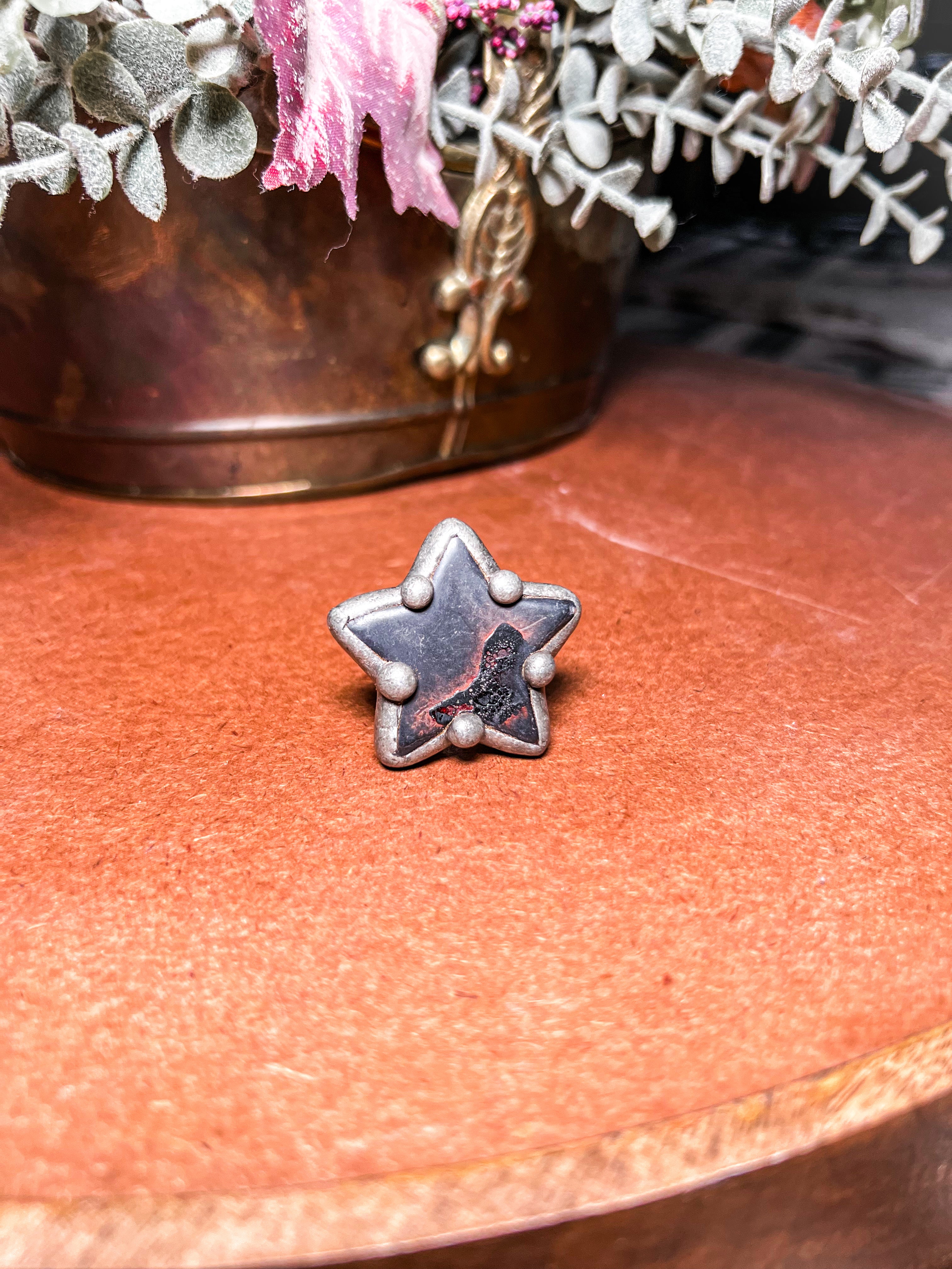 This Black Soldered Star Adjustable Ring stands out with its bold, chunky design and captivating faux silver finish. At its center, a black agate stone with delicate pink veining takes the spotlight, nestled within a star-shaped setting detailed with unique soldered accents. The adjustable band ensures a comfortable fit, making it a versatile accessory for any finger. Perfect for adding an edgy and fun touch to your look, this ring combines handcrafted charm with a rebellious spirit, ready to sparkle wherever your adventures take you.