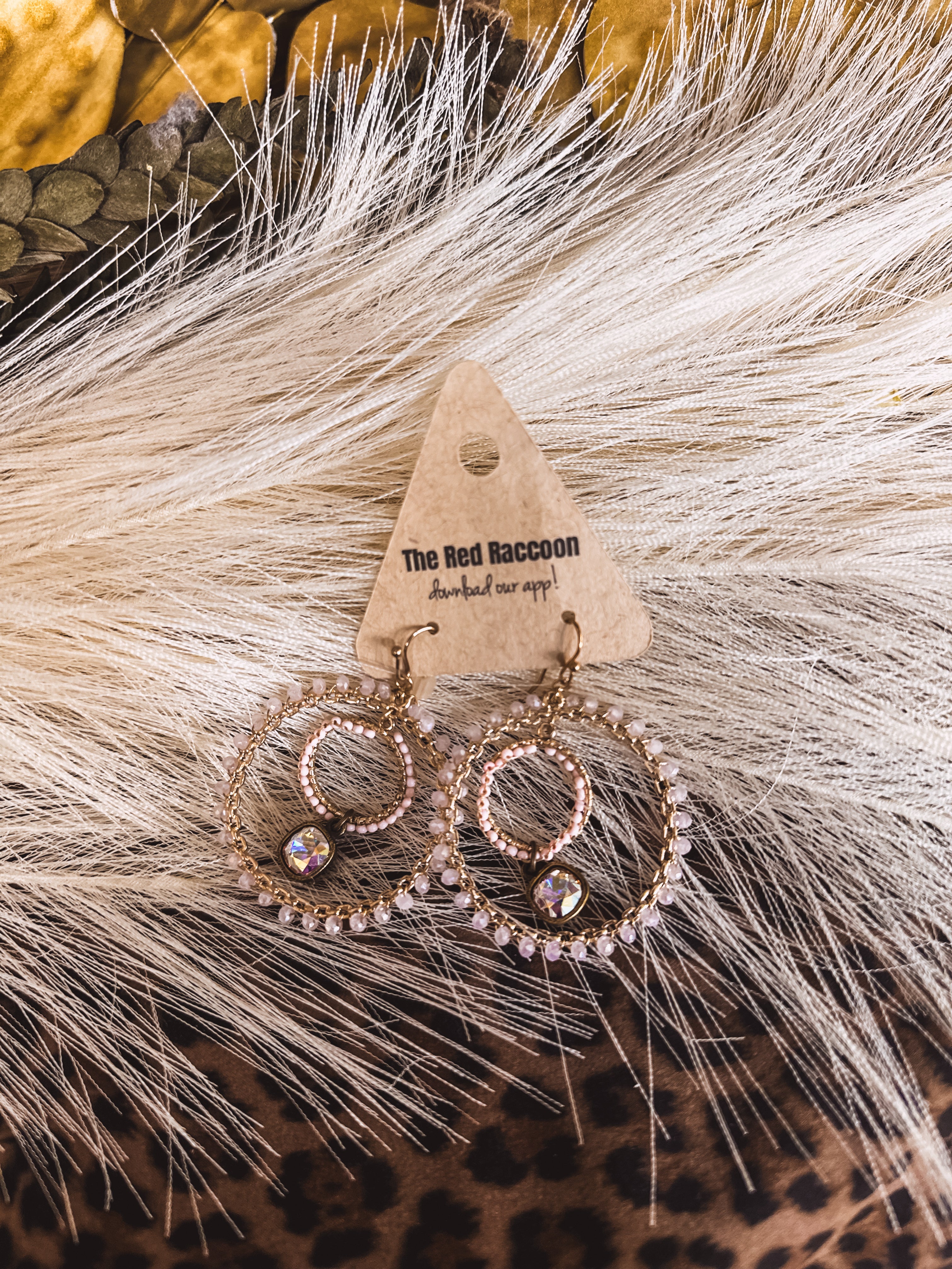 These Blush Double Circle Earrings bring a whimsical twist to your jewelry collection. Delicately crafted, they feature mini blush crystal beads woven along a gleaming gold wire that forms a graceful outer circle. Inside, a smaller hoop sparkles with matching blush beads, centered perfectly by a captivating pink iridescent stone that catches the light with every movement. Hanging from a classic shepherd's hook, these earrings add a playful pop of color and shimmer to any outfit, making them a fun and flirty choice for day or night.