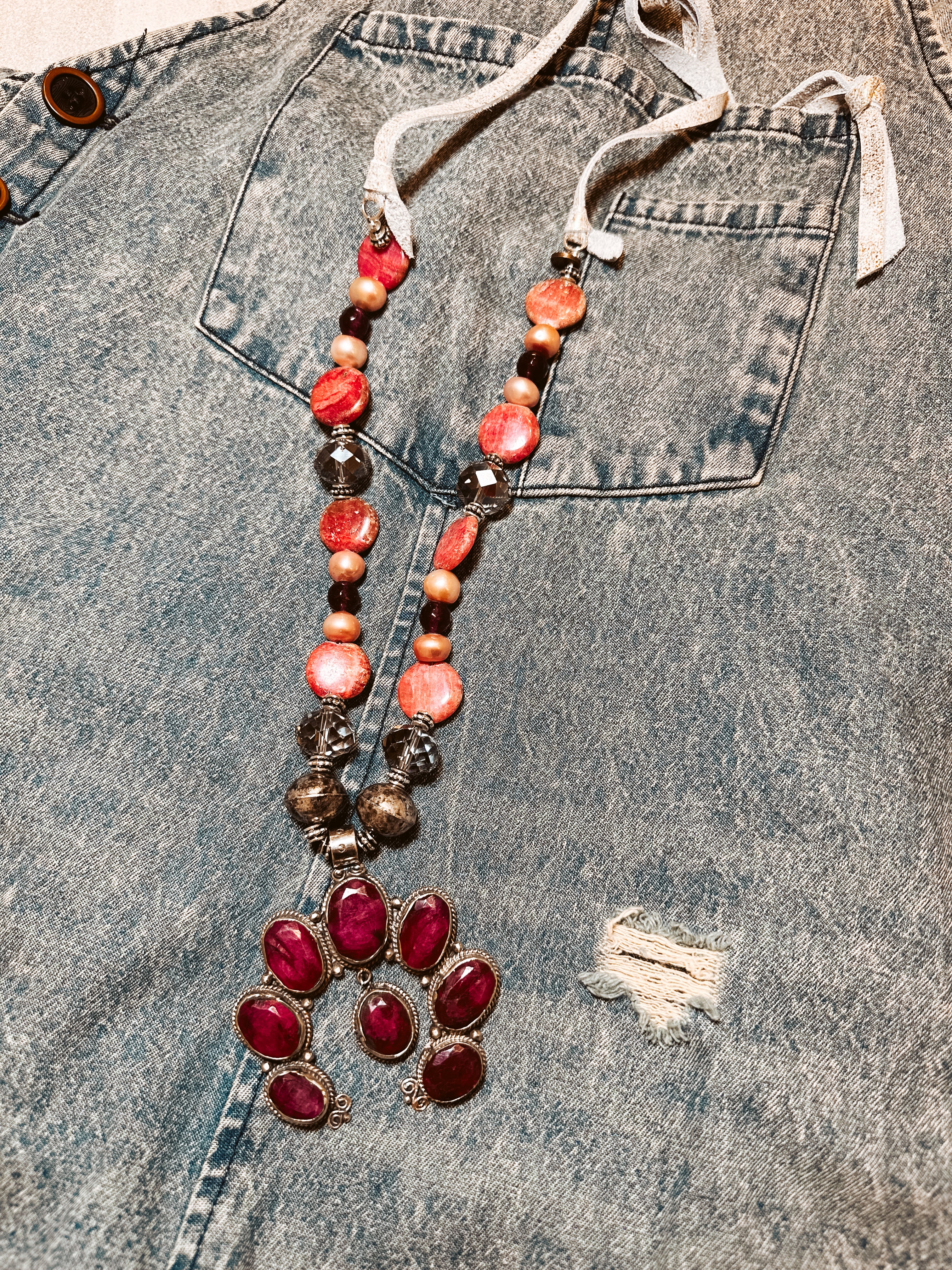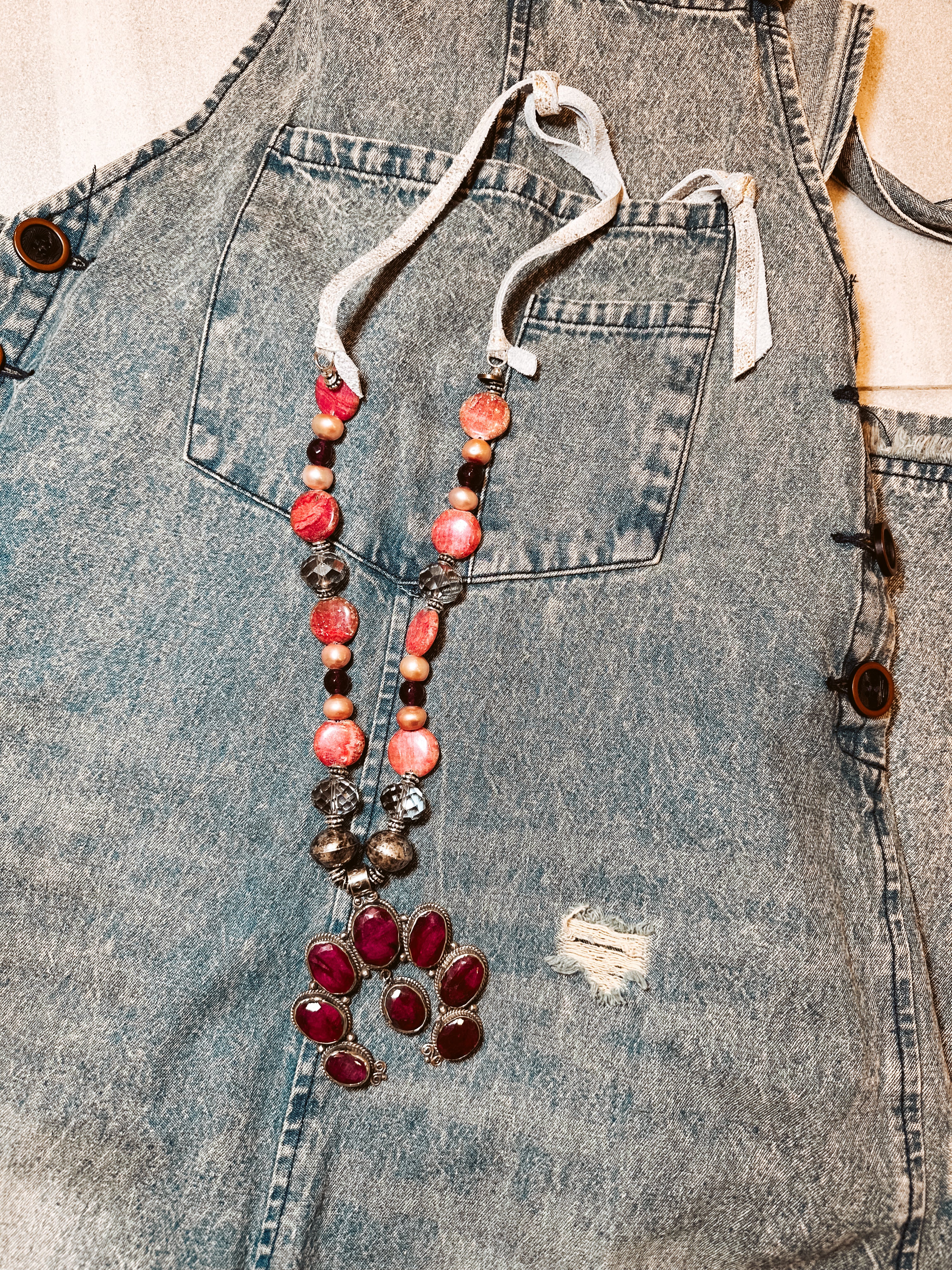 Elevate your style with the Garnet + Ruby Squash necklace, where playful glamour meets eye-catching charm. Faux garnet and ruby beads shimmer brightly, leading to a standout faux ruby squash pendant that adds a whimsical touch. Mounted on a sleek metallic leather strap, this piece balances boldness with fun, perfect for anyone ready to turn heads and spark conversations. Whether dressing up for a night out or adding sparkle to your everyday look, this necklace brings vibrant energy and personality to your outfit.