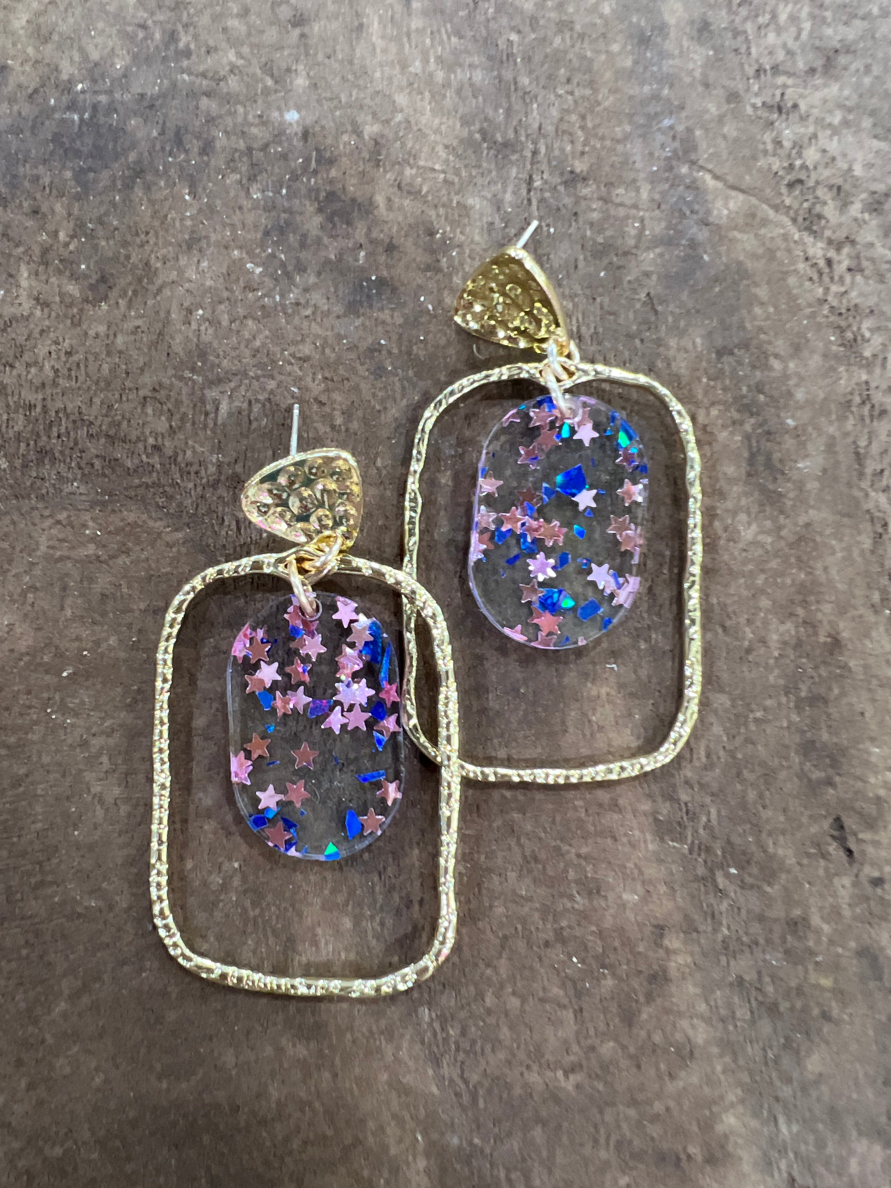 Add a splash of charm to your look with these Pink + Blue Confetti Oval Hoops. Crafted from gold-plated wire, the rectangular hoops offer a modern twist, while the pink and blue confetti oval dangles playfully from a stamped gold post back. Lightweight and eye-catching, these earrings bring a fun pop of color and shine, perfect for turning everyday outfits into something extraordinary. Whether dressing up for a night out or adding flair to casual wear, these hoops make a bold yet whimsical statement.