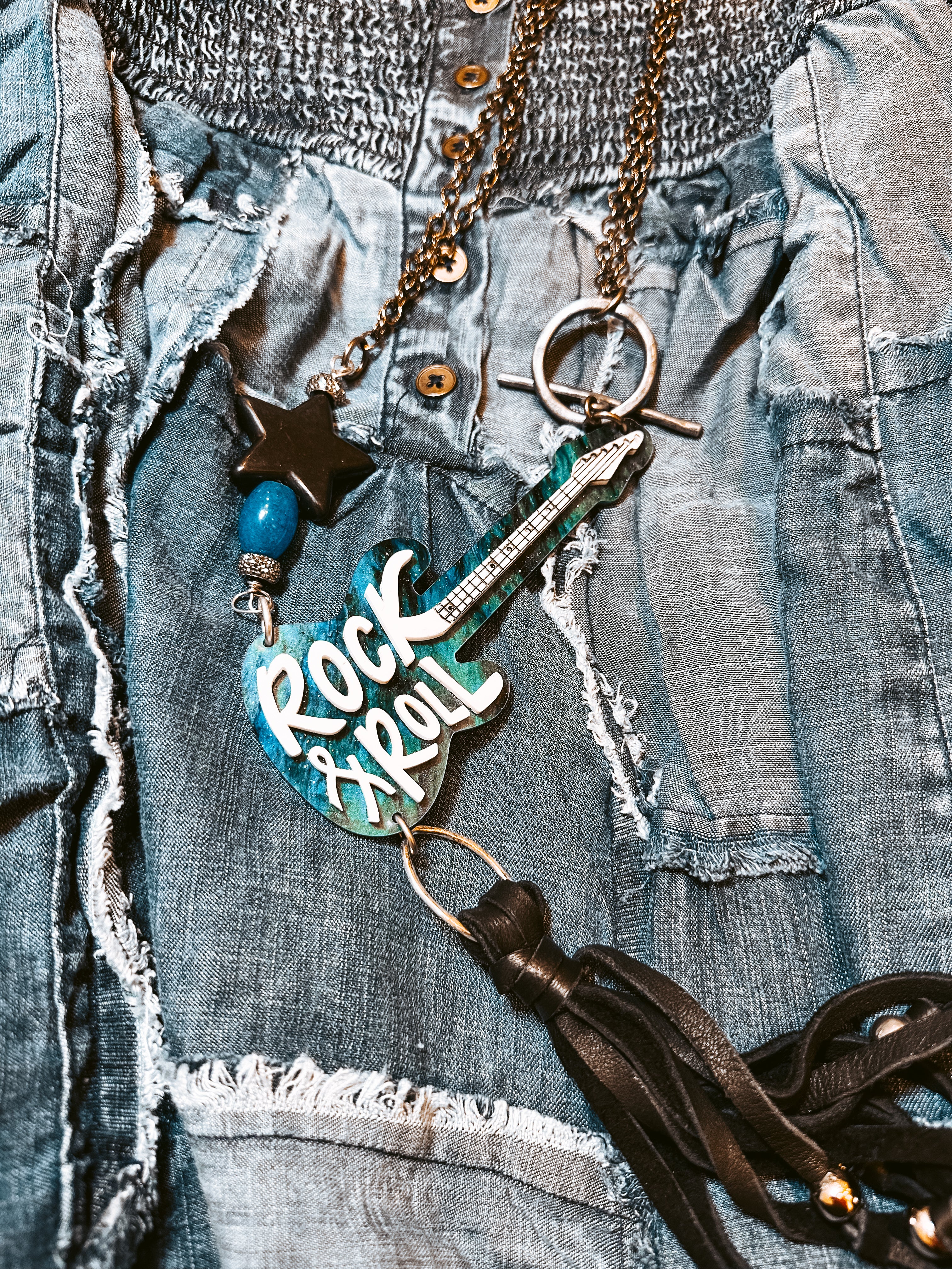 Add a bold, rock-inspired edge to your style with the Rock On Necklace. This necklace features a long faux bronze chain with chunky Rock & Roll guitar charms, beads, and a star accent that bring a playful energy to your look. A leather tassel adds an extra touch of funk, making it perfect for anyone who loves to stand out. Whether you’re dressing up jeans or adding flair to a simple outfit, this necklace is guaranteed to catch the eye and turn heads with its unique, vibrant design. Rock your vibe and let your personality shine!