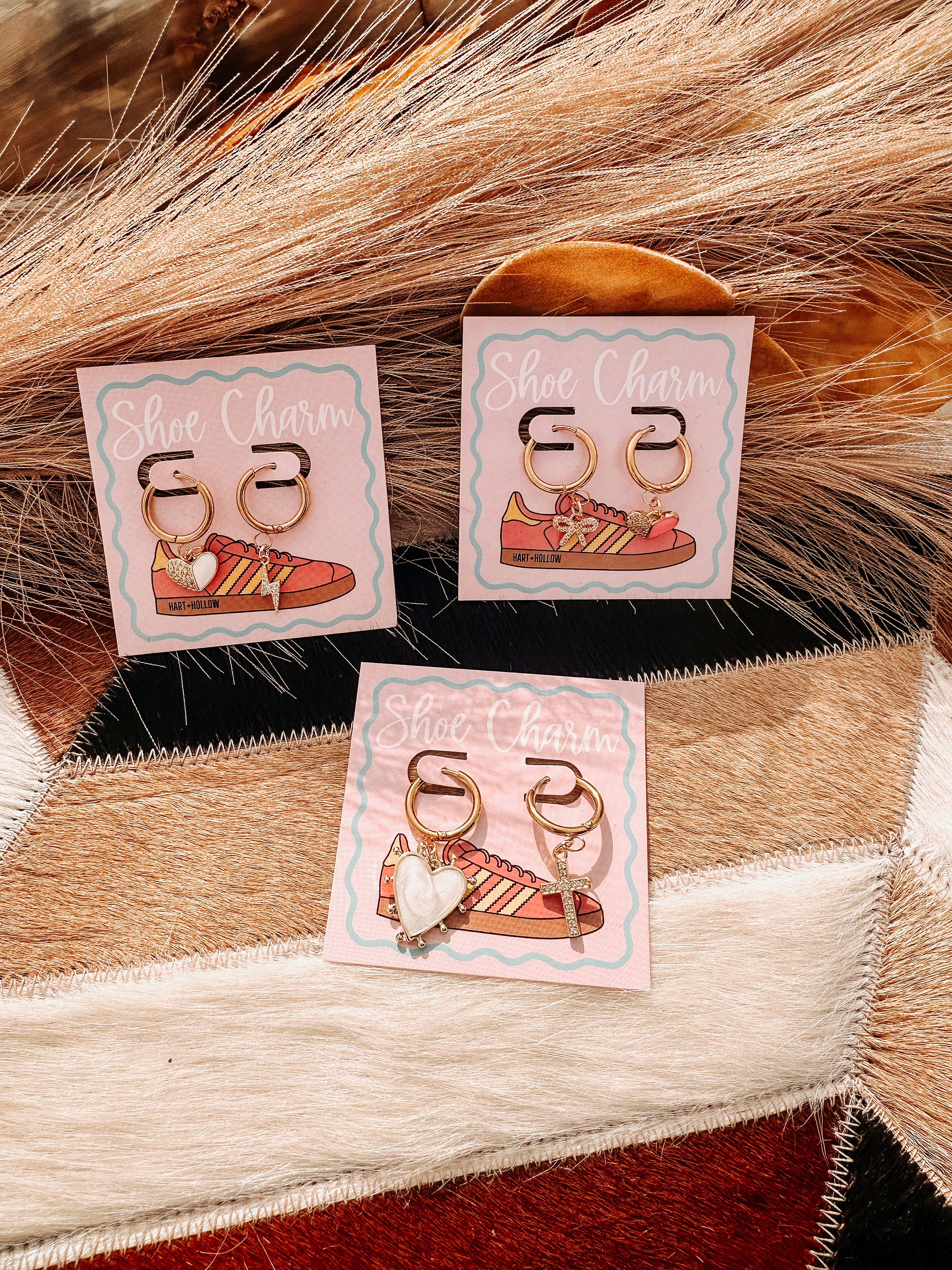 The most delightful addition to your 'fit that you never knew you needed: Shoe Charms! these faux gold hoop charms feature heart and bow, cross and heart or heart and lightning bolt charms that you can add to your shoelaces to add some bling and express yourself to your heart's content! Grab them in every combo for lots of options!