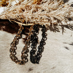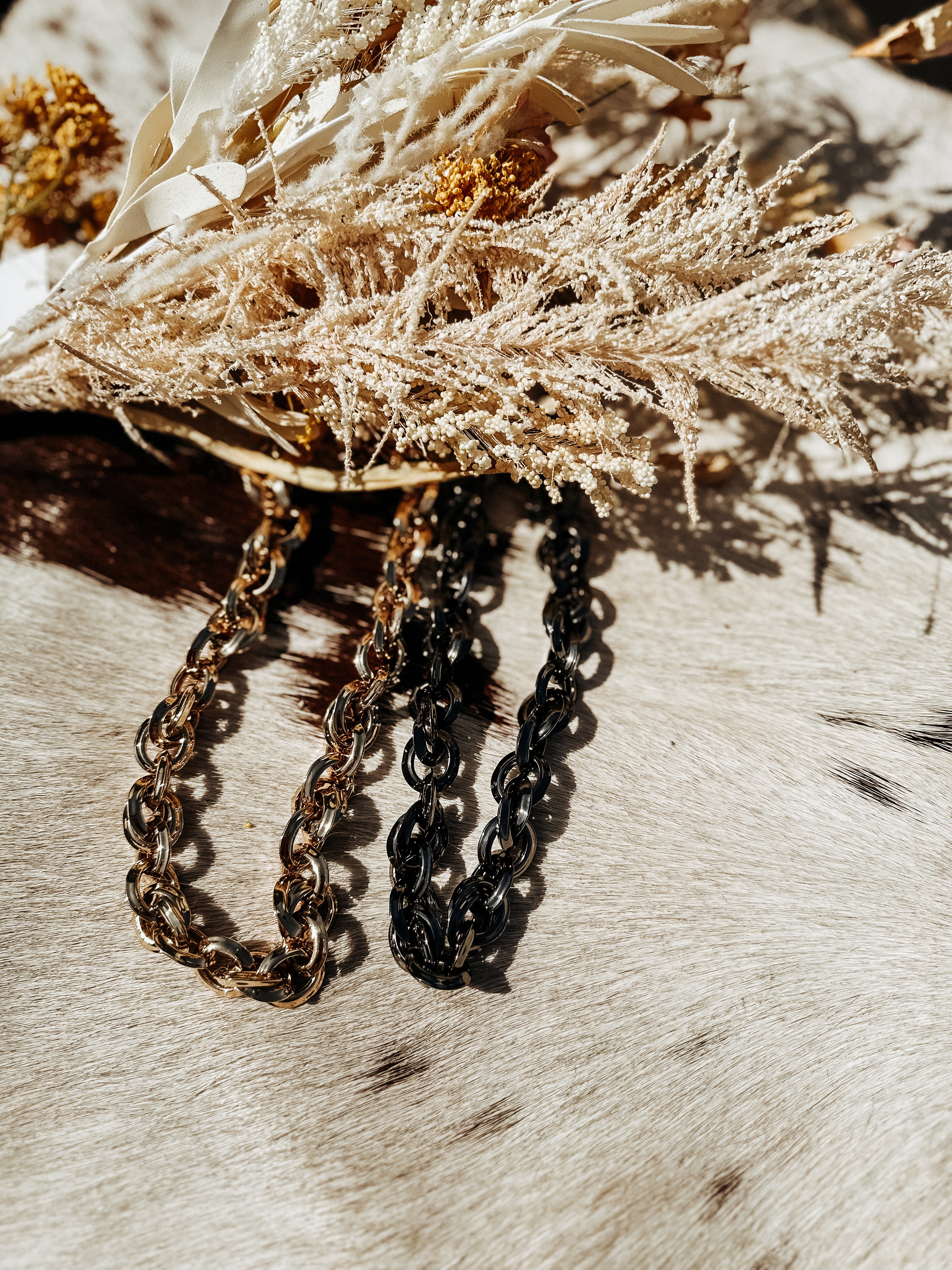 Elevate your style with the Double Link Rockin Necklace, featuring a bold double chain link design that brings playful edge to any outfit. Available in faux gold for a vibrant shine or dark gunmetal for a sleek, daring vibe, this chunky necklace is perfect for layering or wearing solo to make a confident statement. Its sturdy links add texture and dimension, turning simple looks into eye-catching ensembles. Add some rock 'n' roll flair to your jewelry collection with this versatile, attention-grabbing accessory.