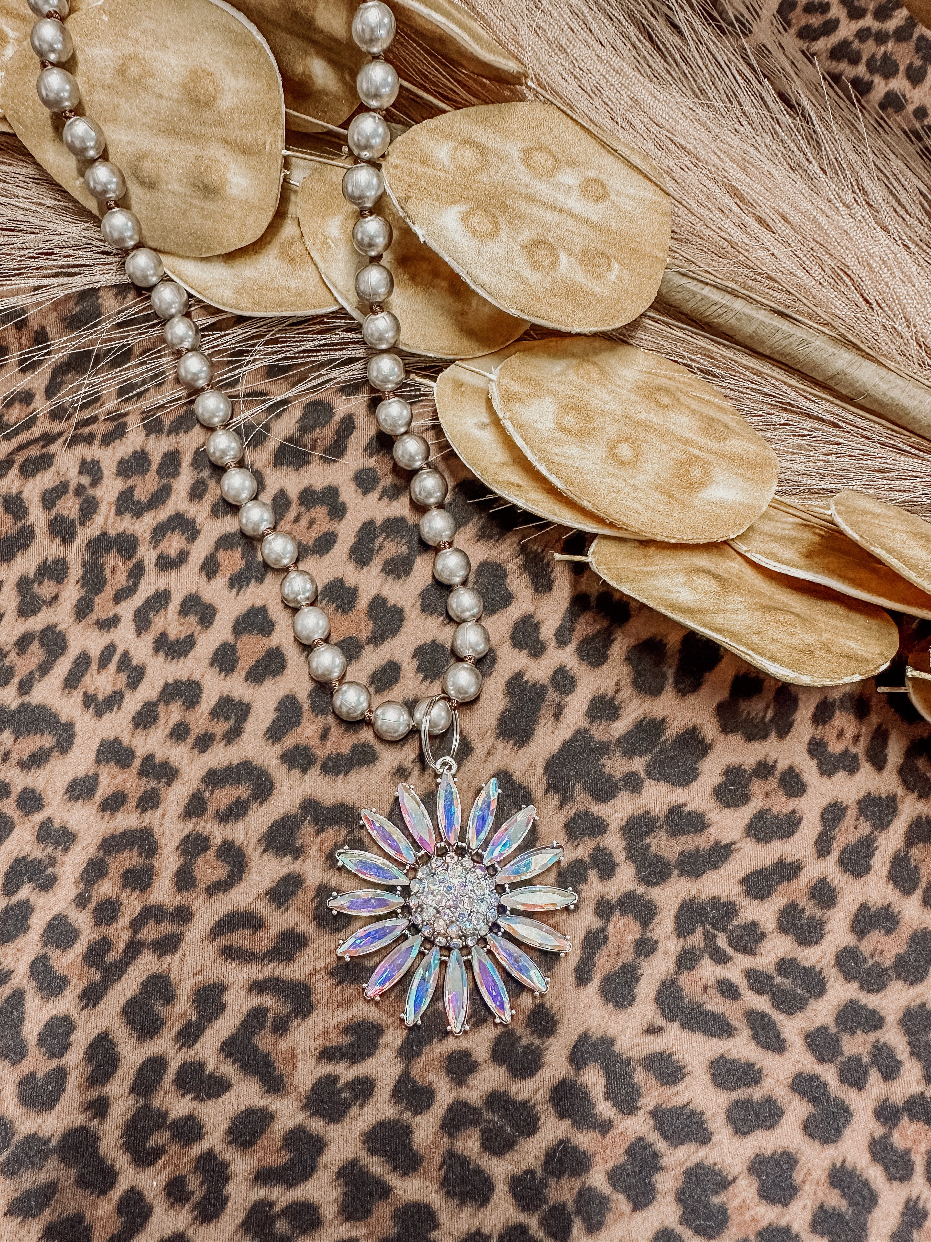 Brighten your look with the Sunflower Glam Glitzy Necklace! This eye-catching accessory pairs a soft, muted faux silver pearl chain with a dazzling sunflower charm adorned in iridescent sparkling stones. Its bold yet playful sparkle adds a whimsical touch to any outfit, making it perfect for turning heads wherever you go. Whether dressing up or adding a bit of sunshine to your everyday style, this necklace is your go-to for a fun, radiant statement. Let your style bloom with a piece that’s as vibrant and unique as you are!