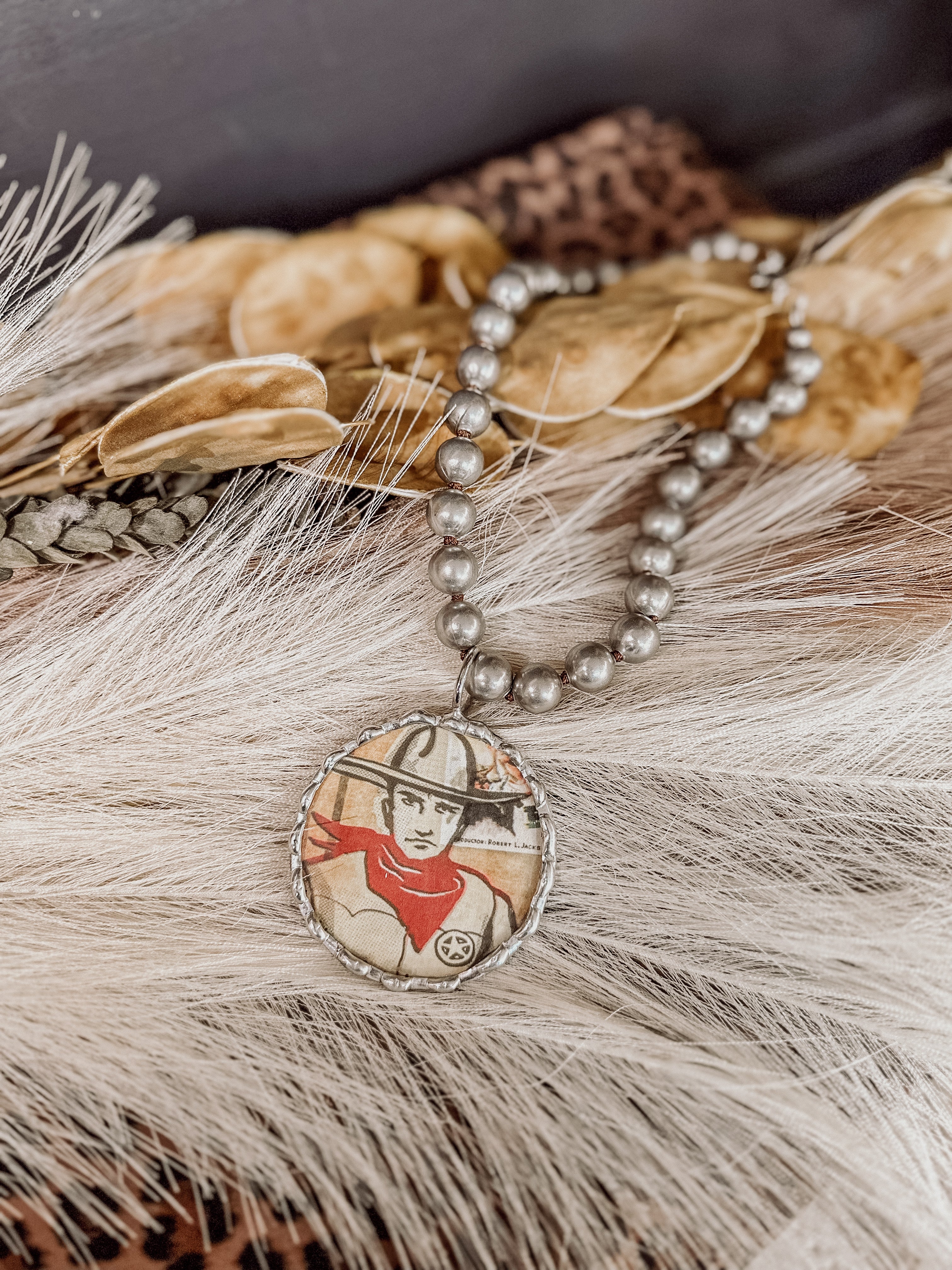 The Cowboy Way Ball Necklace combines classic western charm with a playful twist. This muted, faux silver pearl chain showcases a retro cowboy design that sparks the spirit of the open range. Wrapped in hammered faux silver, the necklace delivers a bold texture and eye-catching flair that complements any outfit. Whether you’re heading to a casual gathering or looking to add a unique touch to your everyday style, this necklace brings a fun, adventurous vibe that celebrates the cowboy way with a modern edge. Perfect for those who like a little wild west whimsy in their jewelry box.