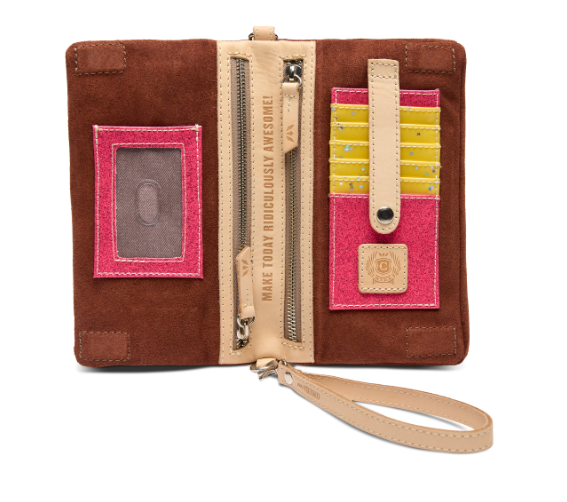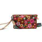 Meet the Uptown Crossbody, designed to keep your essentials stylishly within reach. This charming bag boasts three zippered compartments, six card slots, and a handy wristlet strap for versatility. Wrapped in soft Sienna suede with playful, bold floral embroidery, it snaps shut with double magnets and adjusts comfortably with a woven strap. Perfect for carrying your favorite things with a splash of fun flair!