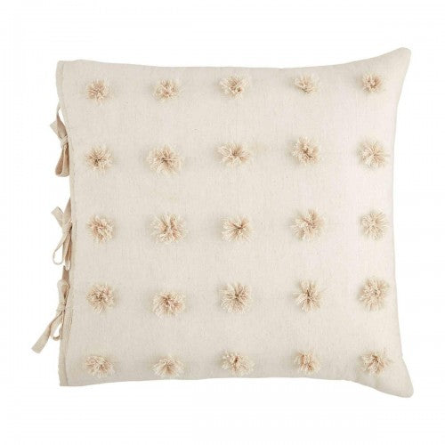 Cotton pillow features tufted yarn dots, side ties and zipper closure