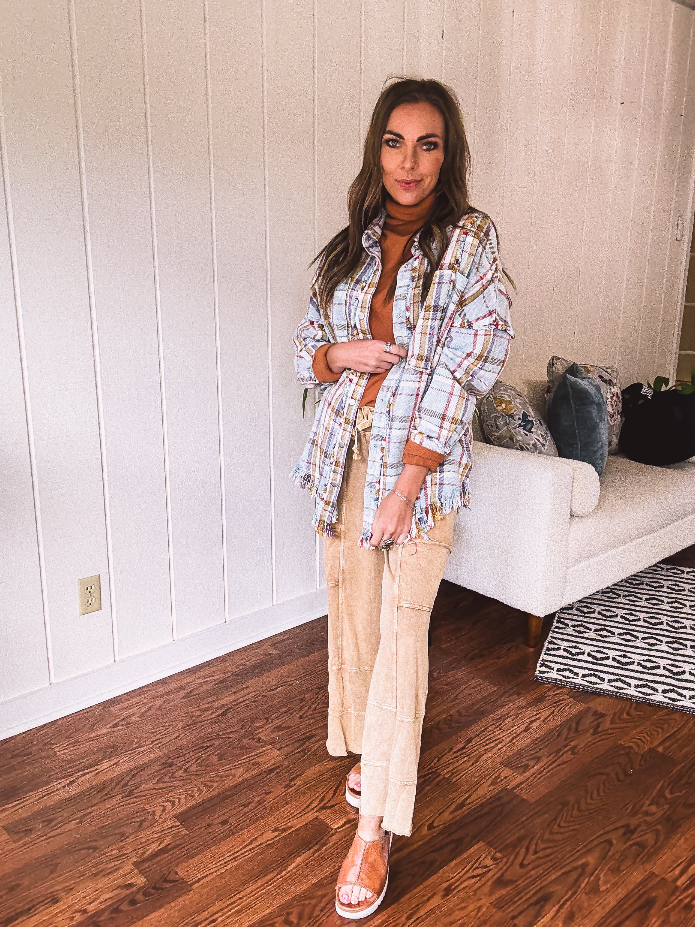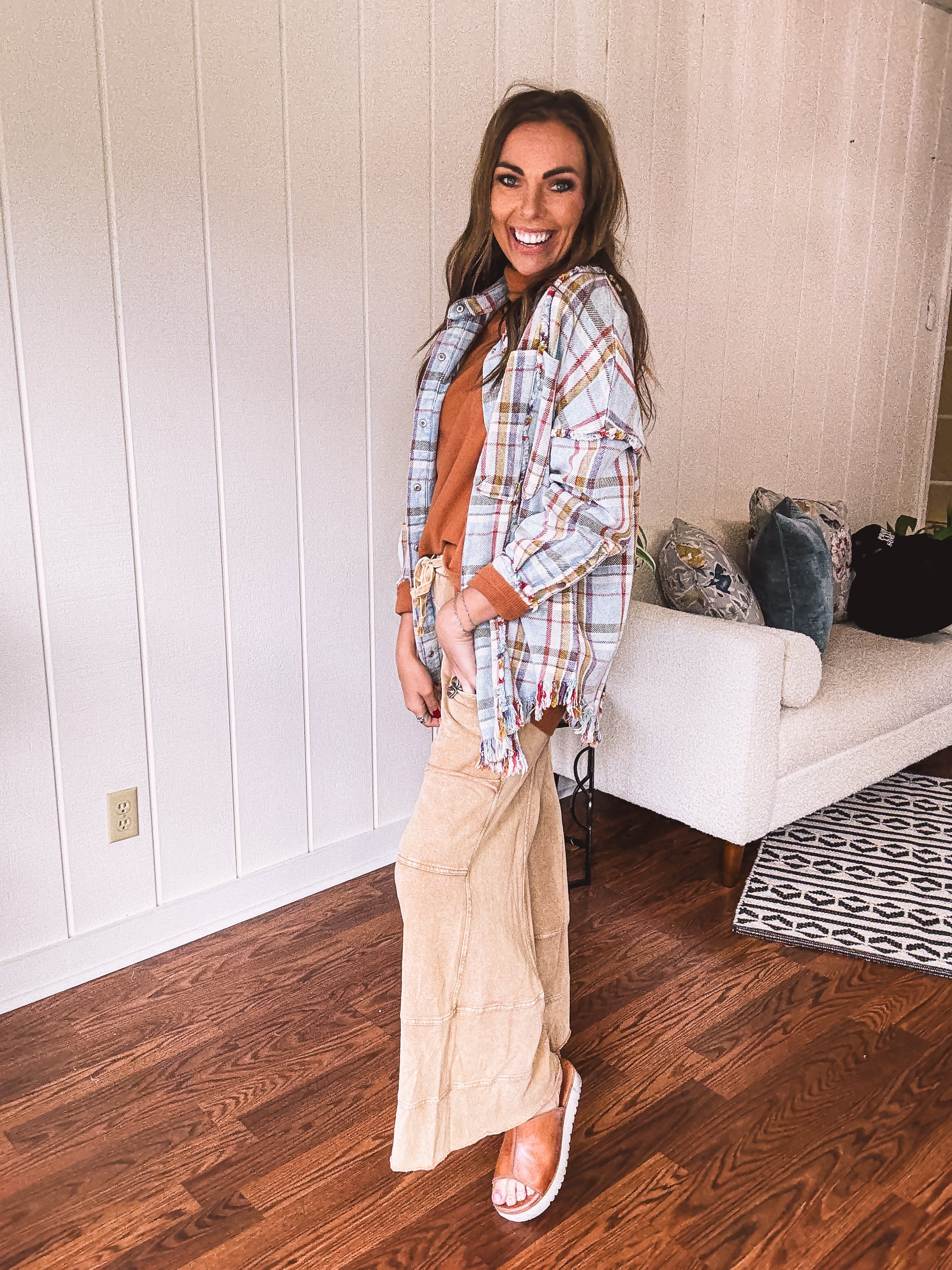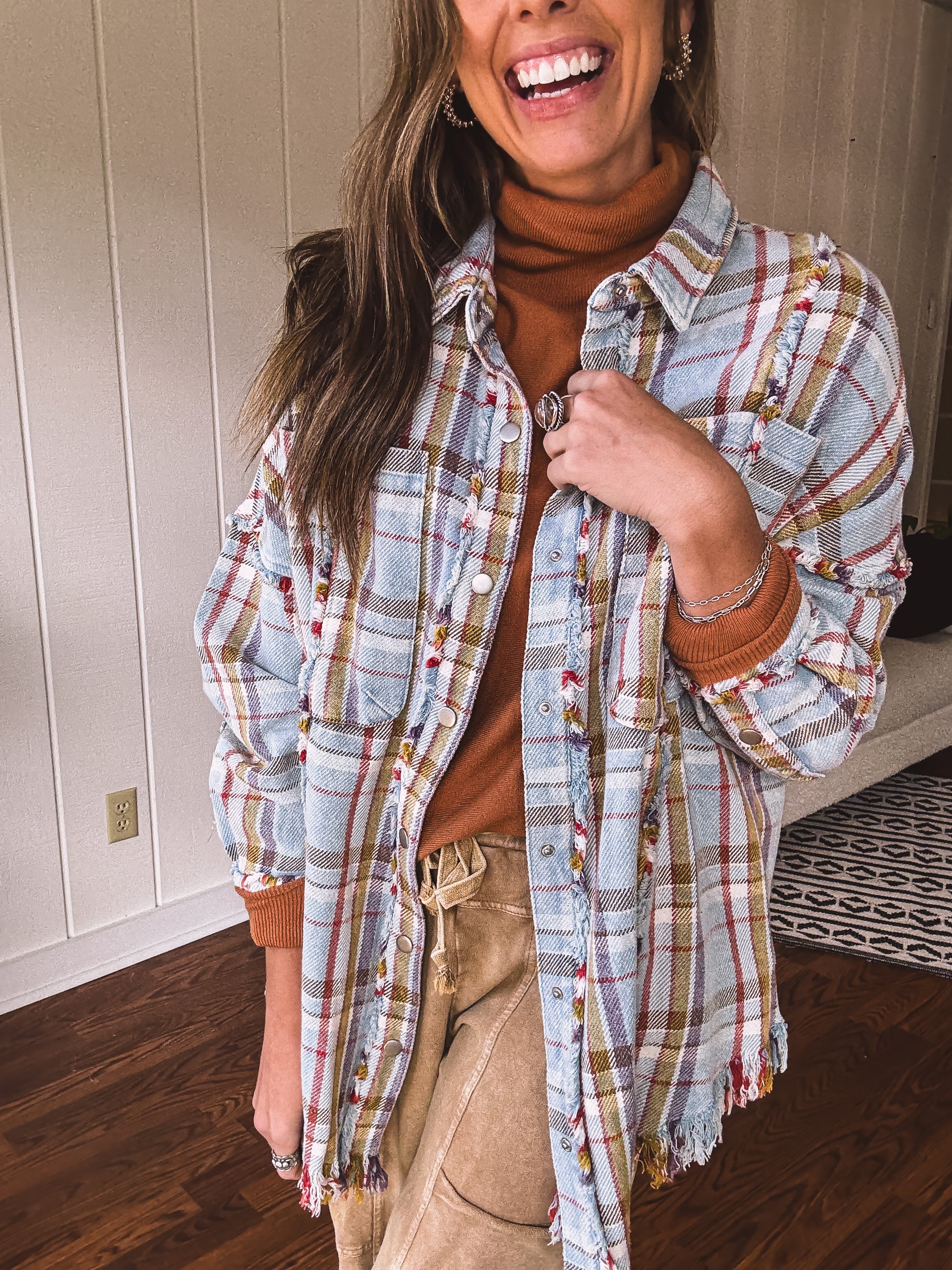 Embrace the cozy vibes of fall with the Bloom Dust Blue Plaid Shacket—a layering essential in cool, soothing tones. Its flowy, oversized fit makes it perfect for cool nights, effortlessly combining comfort and style. Dress it up or down as the season calls for warmth and a playful touch to your autumn wardrobe.