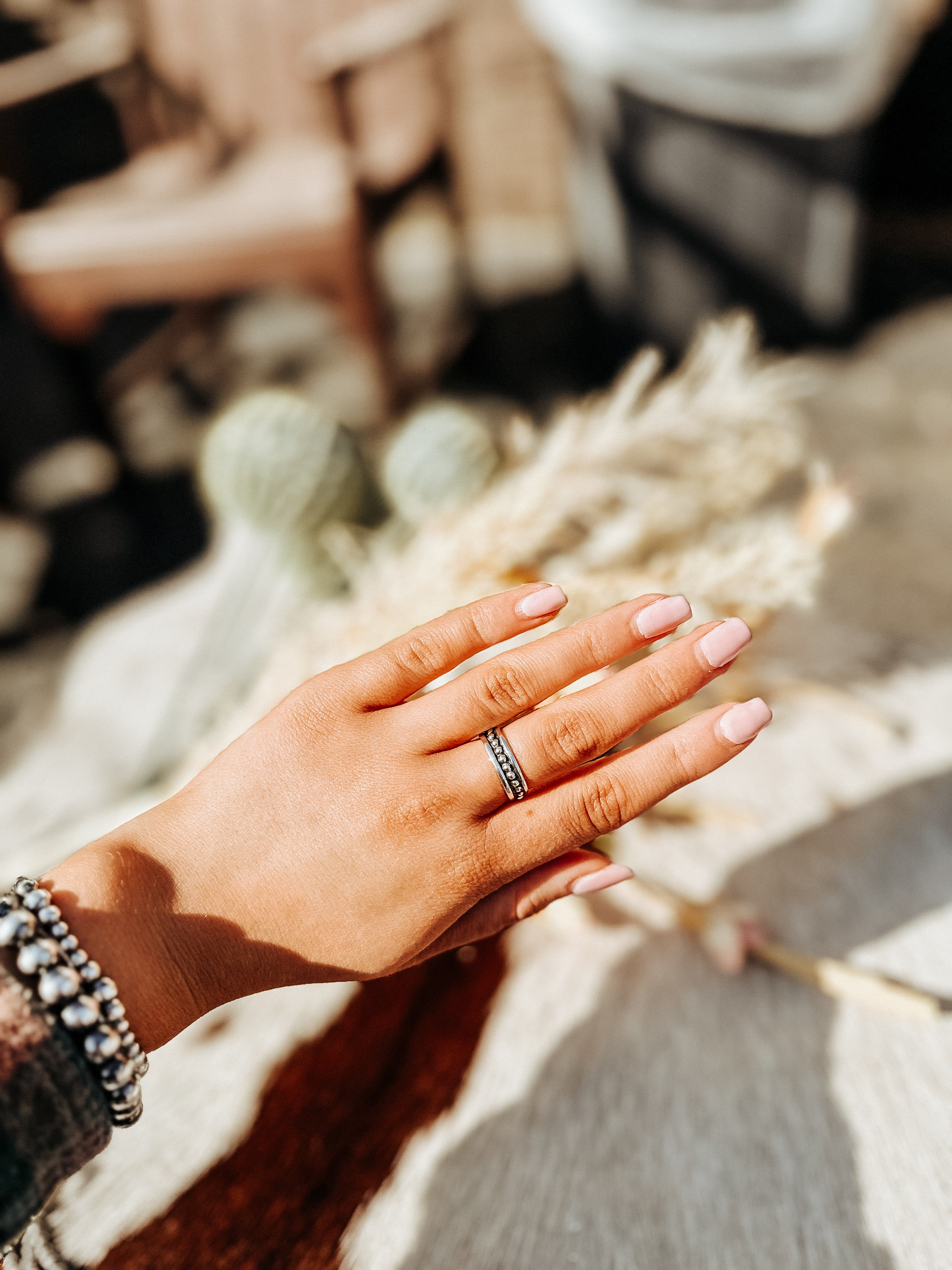 This genuine sterling silver ring features a center of oxidized balls framed by a sleek border. Its unique contrast and stackable design make it a fun essential—wear it solo or mix with your favorite stackers to show off your style!