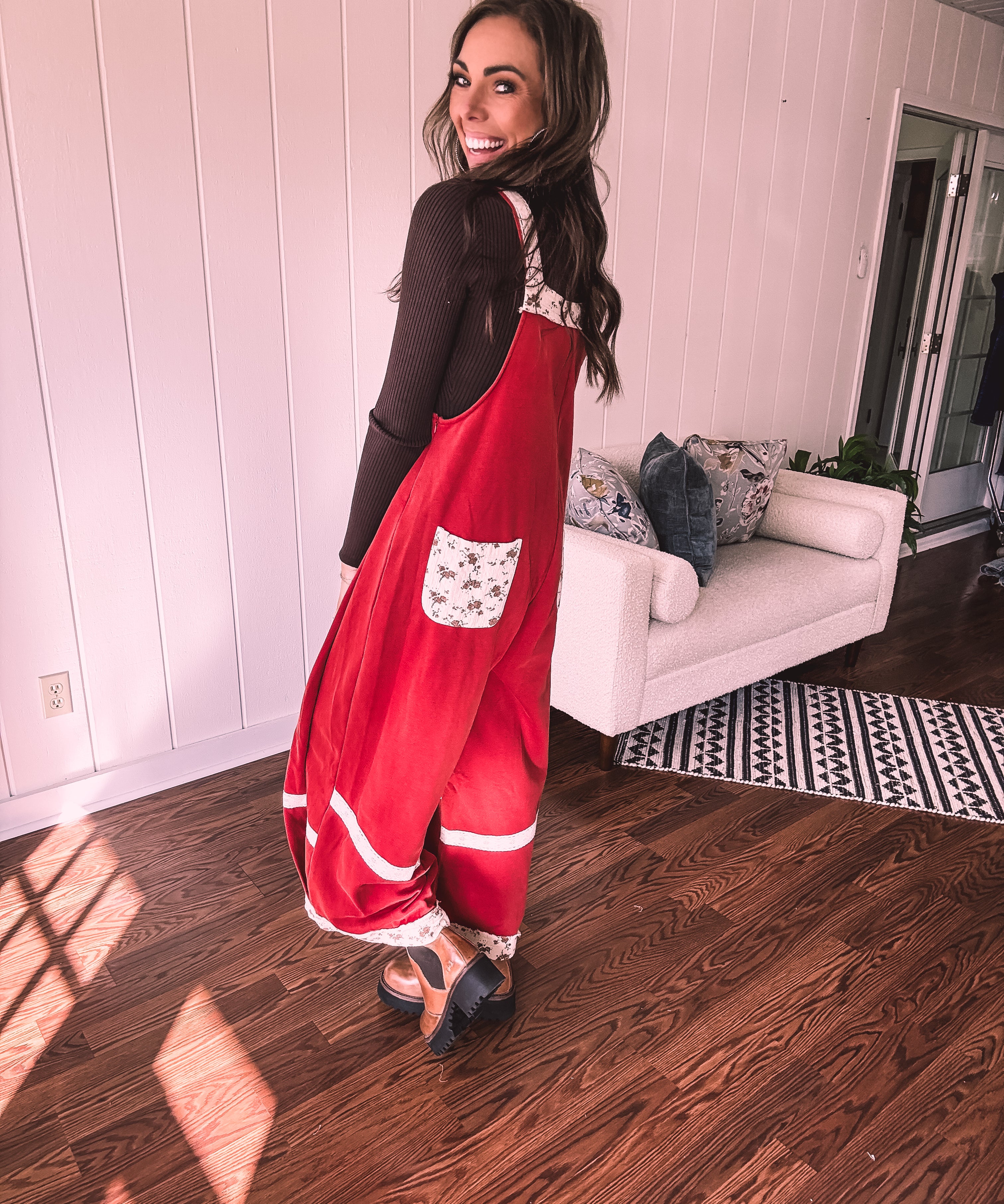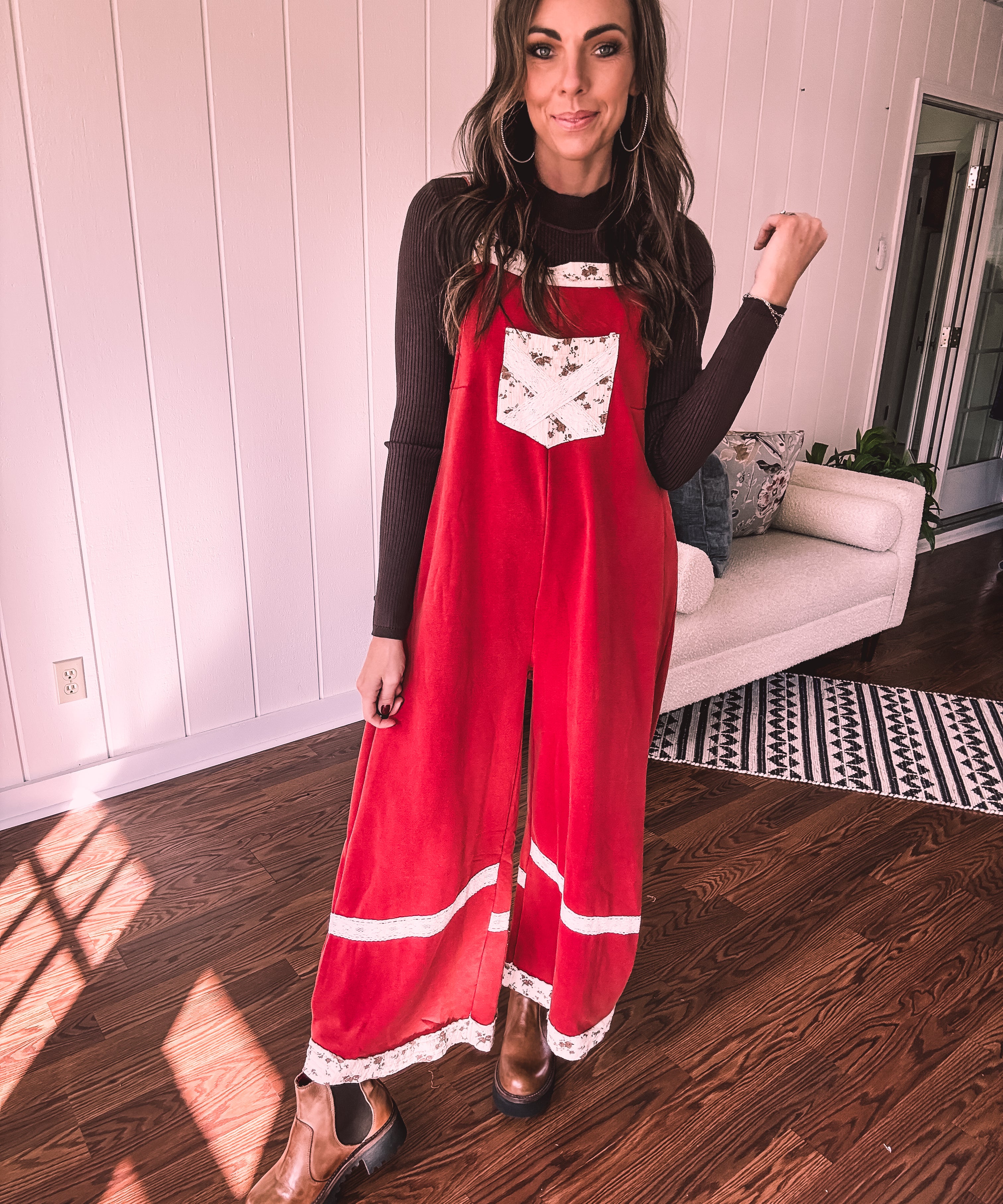 Red Terry Knit Patchwork Overalls