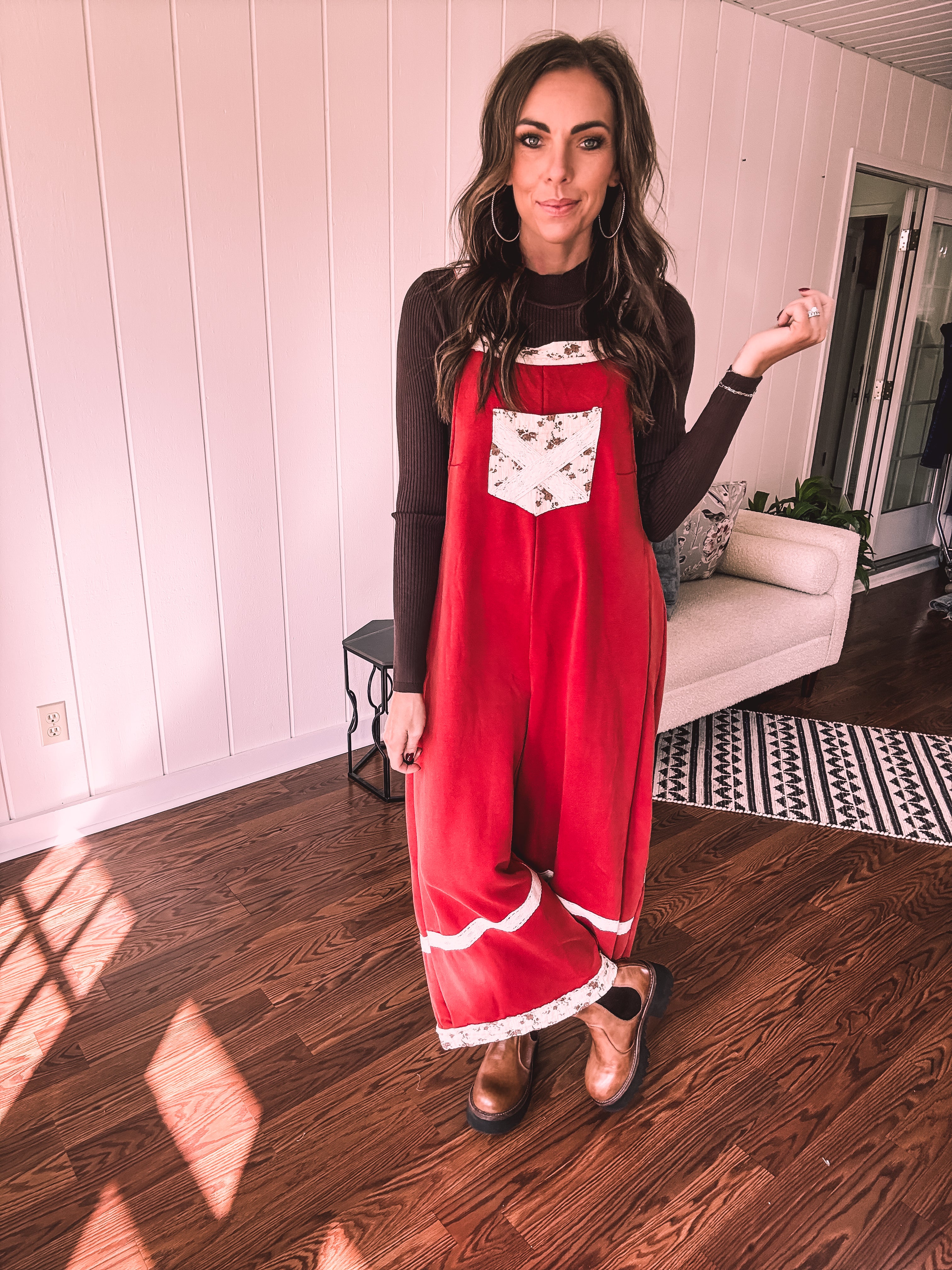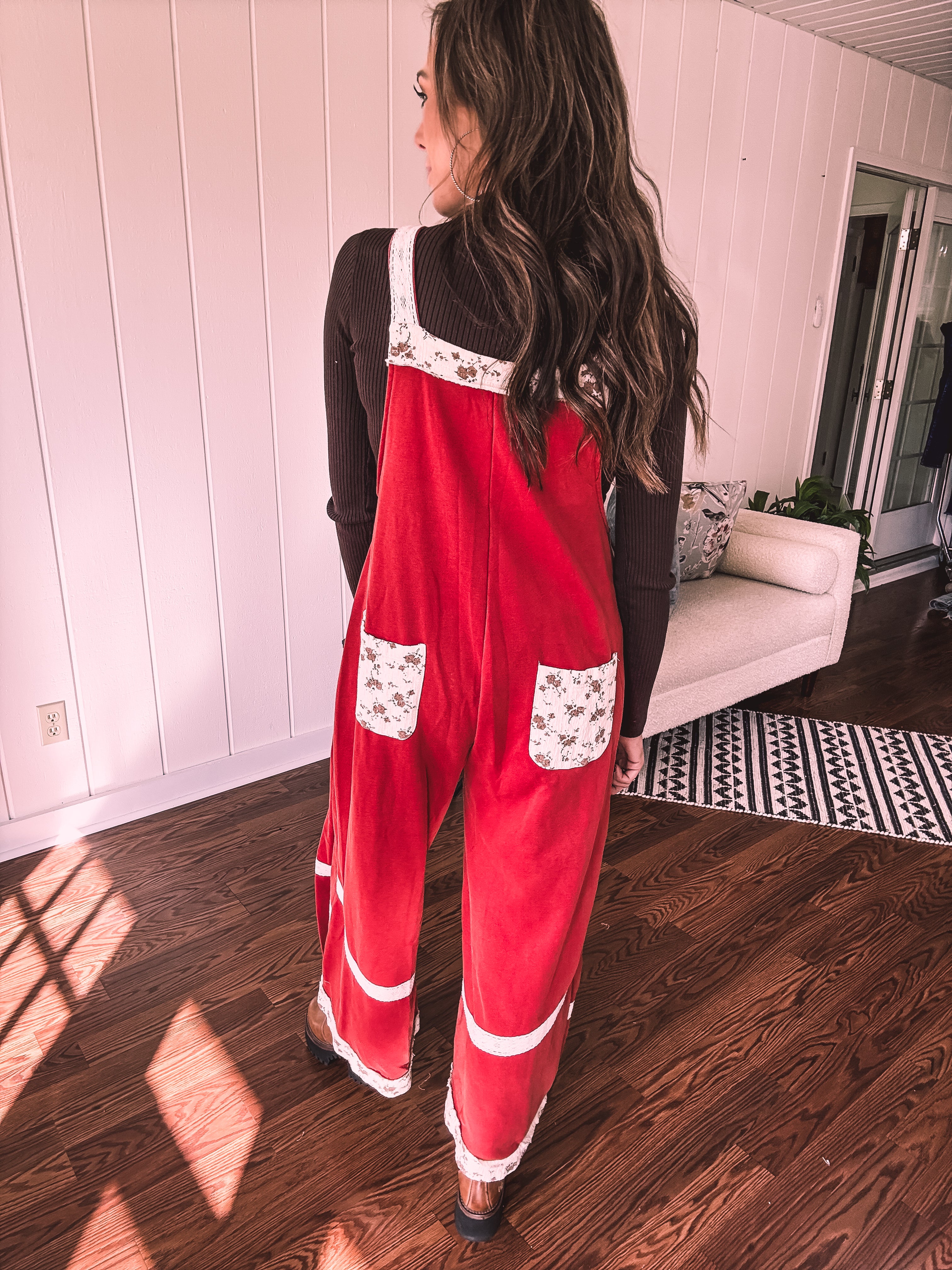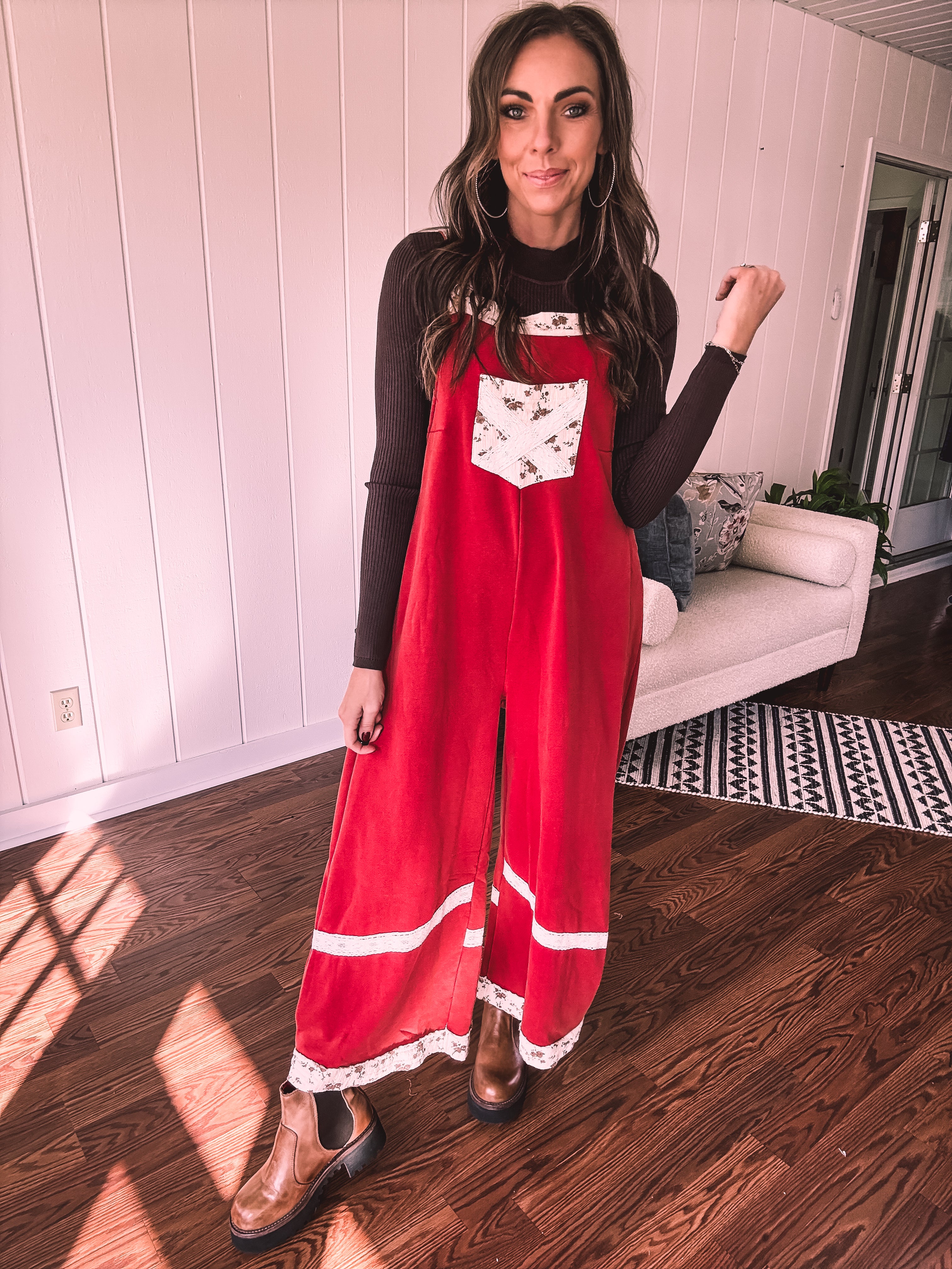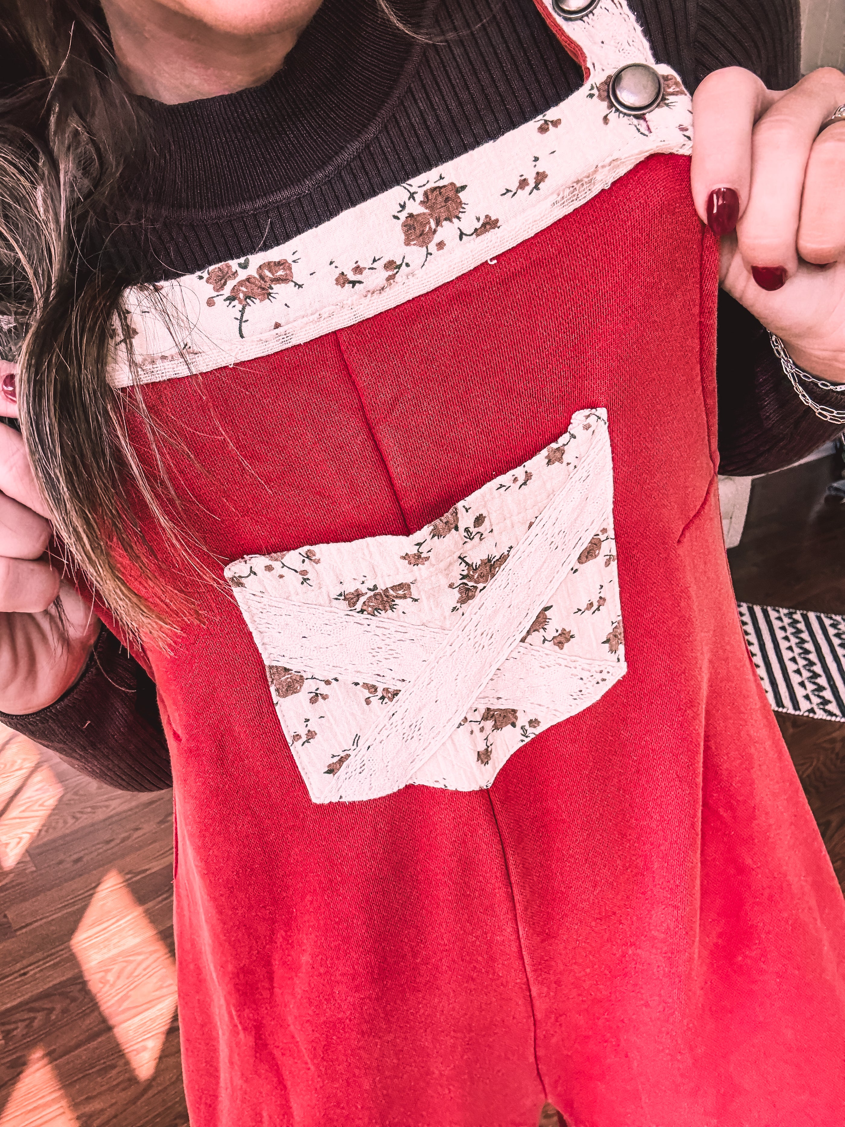 Step into boho bliss with these terra cotta red terry knit overalls from POL. Delicate lace crochet adorns the straps and hem, while charming floral patchwork decorates the pockets and trim for that effortless vintage vibe. The convenient side zip keeps you comfy all day long, and adjustable metal buttons let you customize the fit just right. Cozy, whimsical, and undeniably cool—the perfect piece for anyone who loves laid-back style with personality.