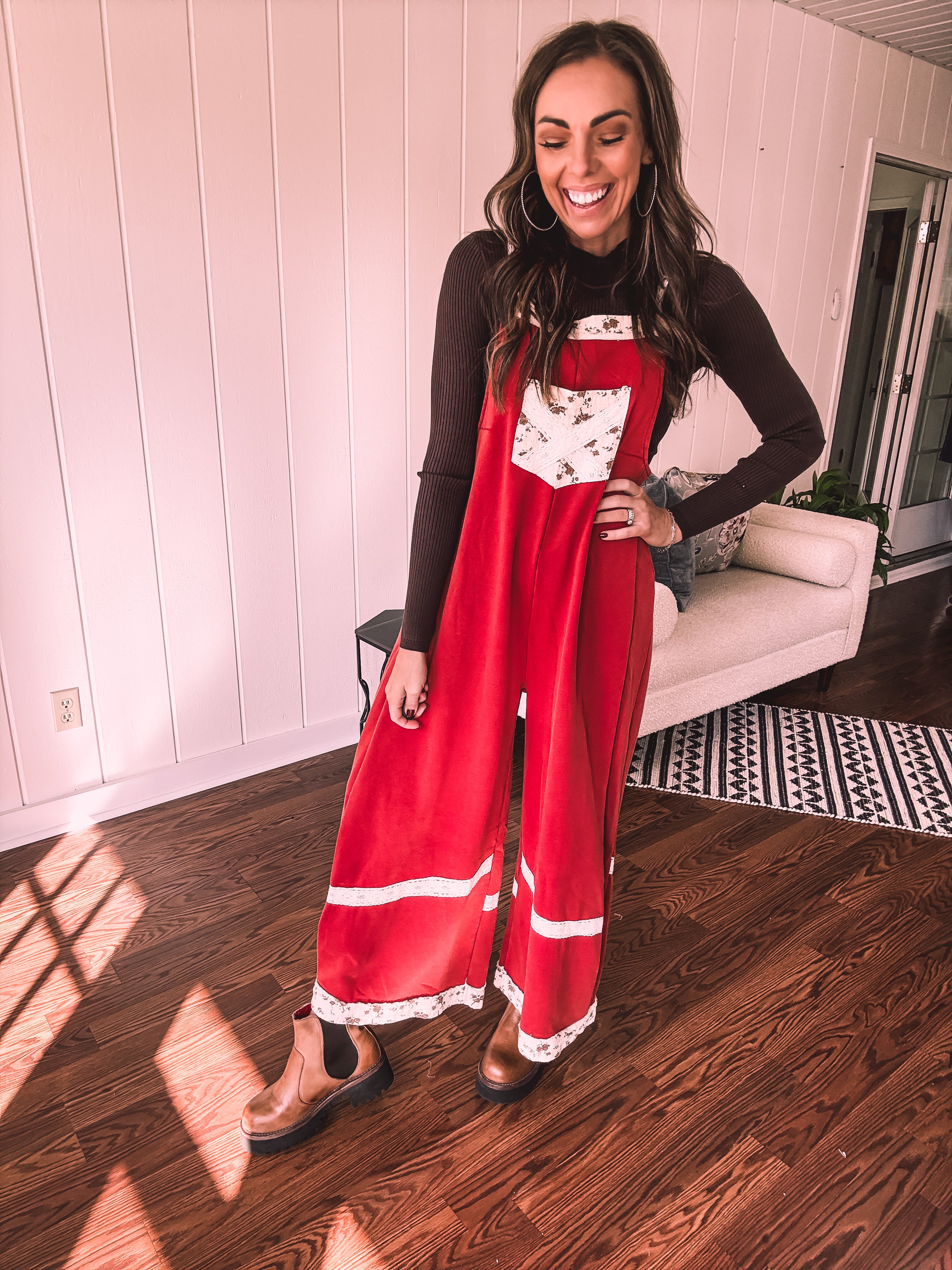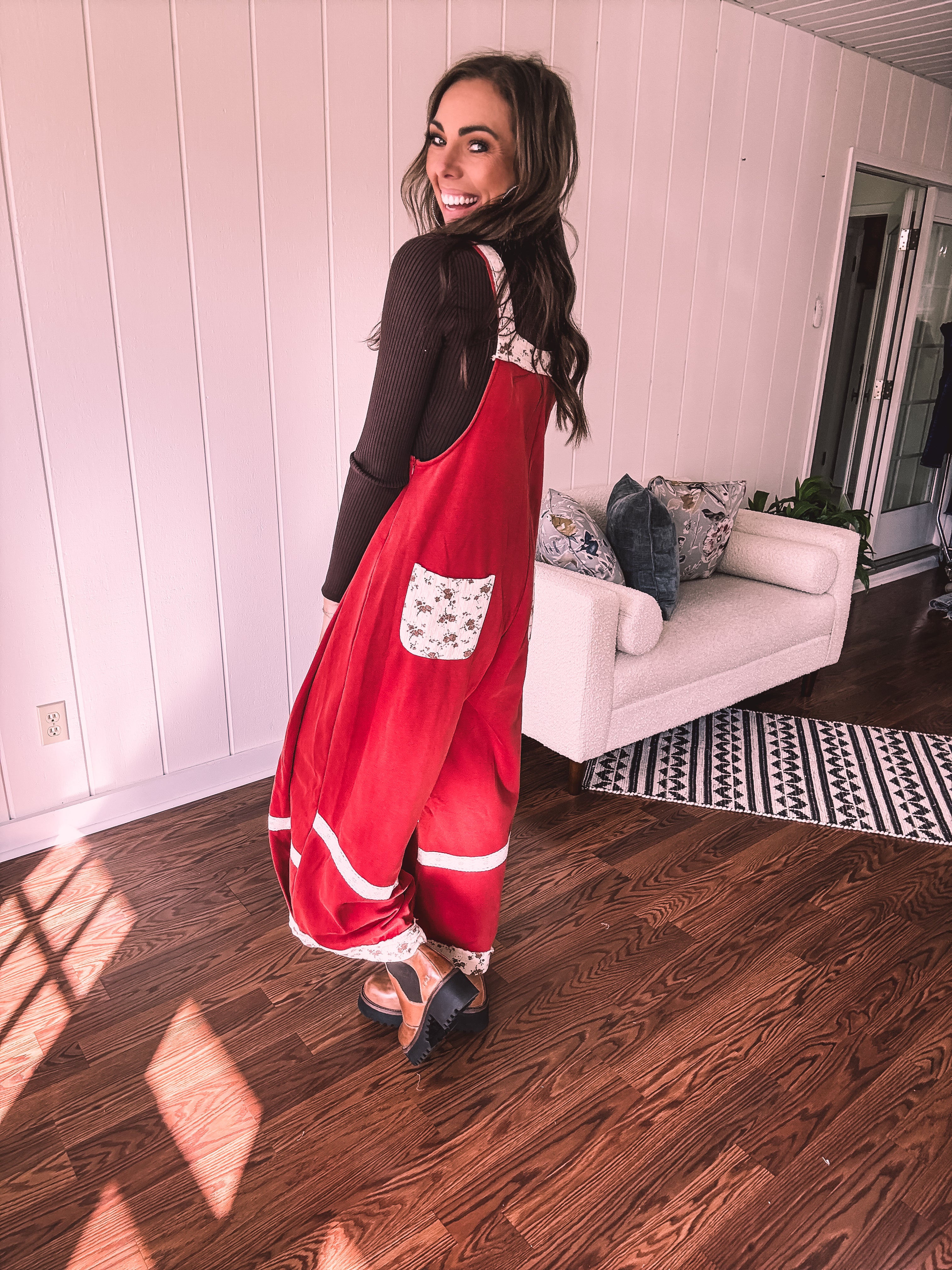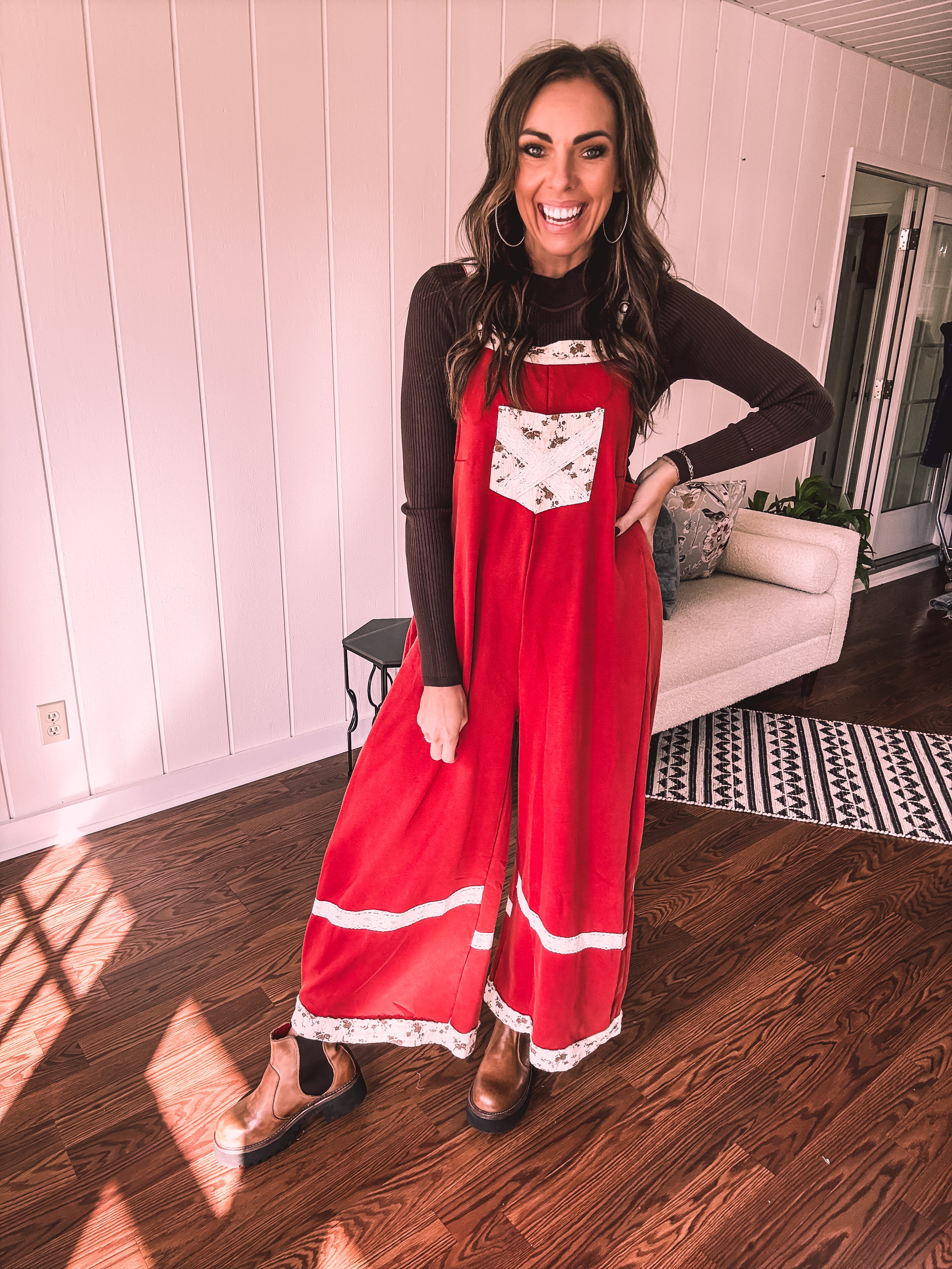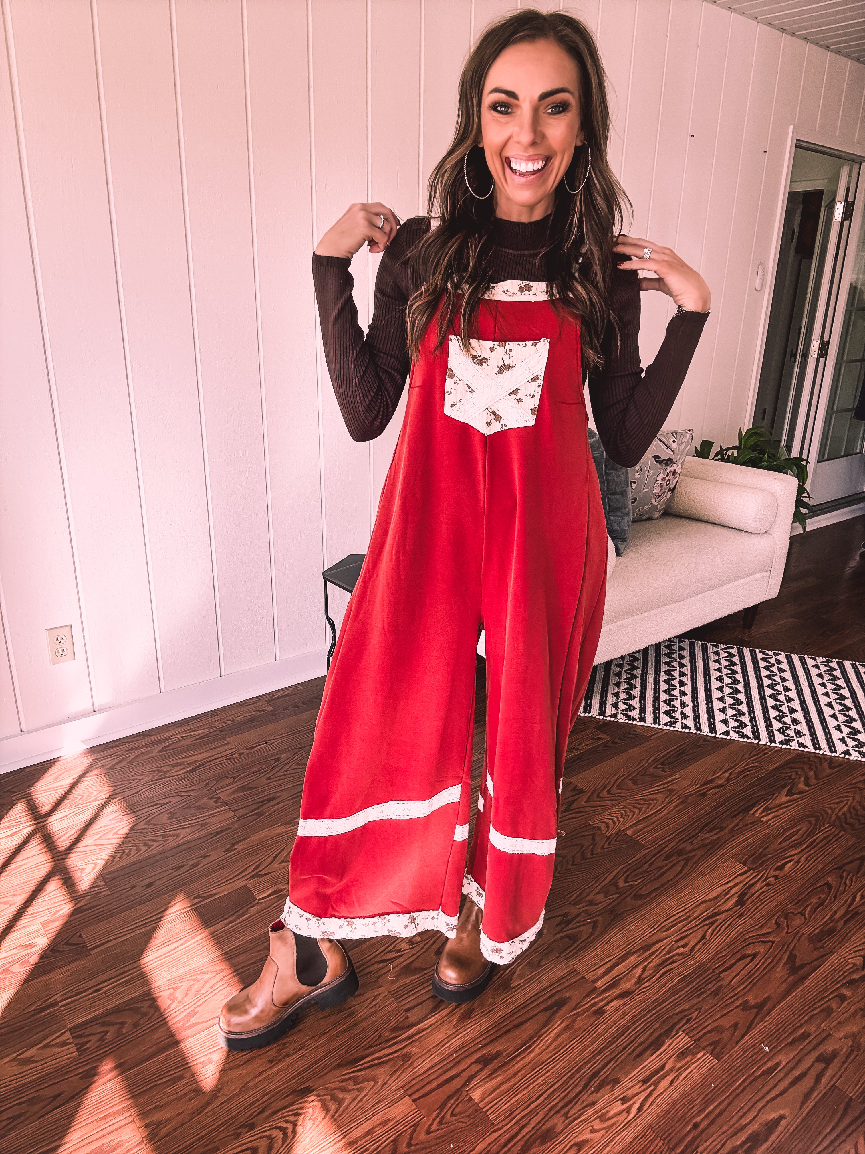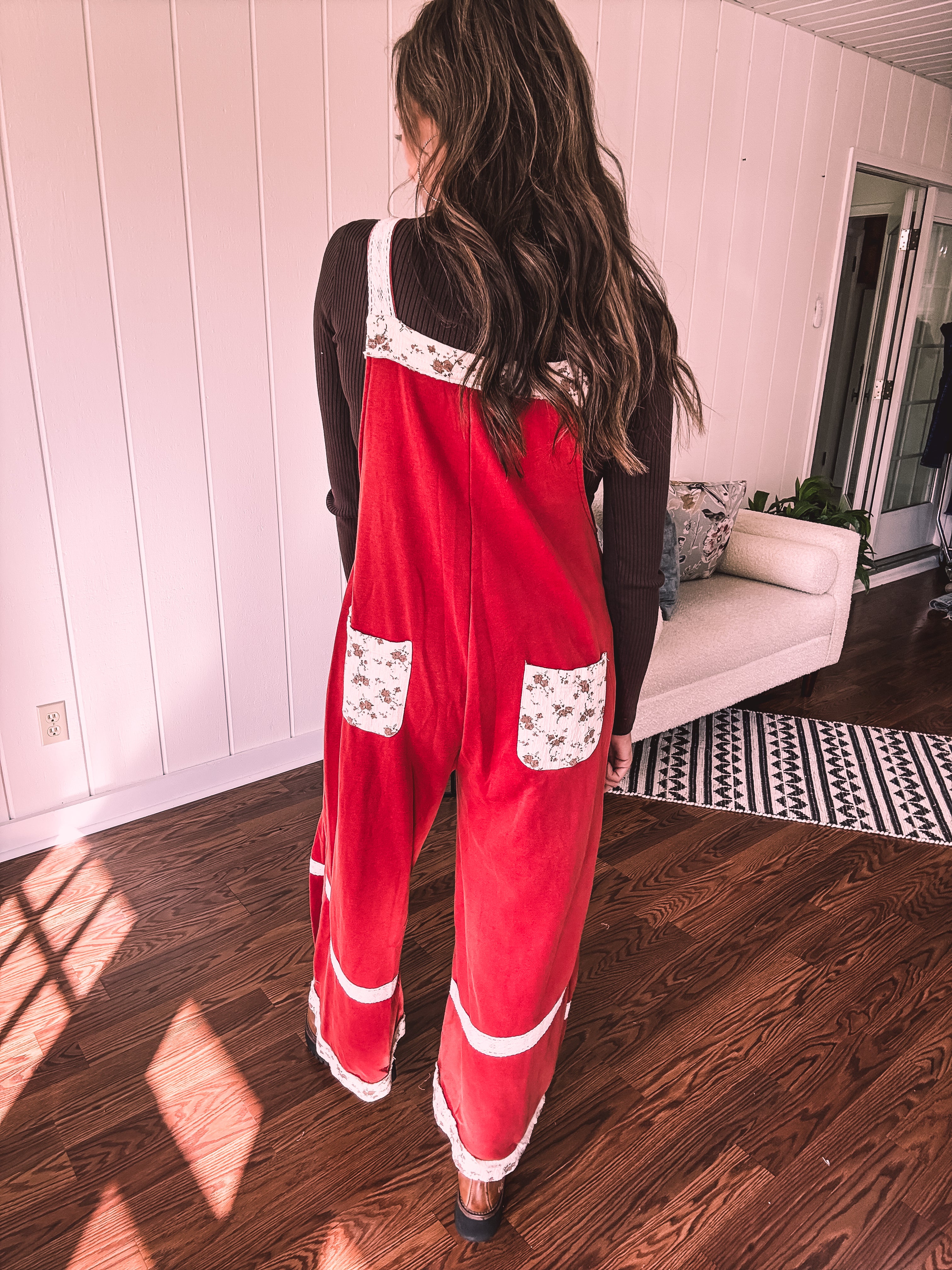 Step into boho bliss with these terra cotta red terry knit overalls from POL. Delicate lace crochet adorns the straps and hem, while charming floral patchwork decorates the pockets and trim for that effortless vintage vibe. The convenient side zip keeps you comfy all day long, and adjustable metal buttons let you customize the fit just right. Cozy, whimsical, and undeniably cool—the perfect piece for anyone who loves laid-back style with personality.