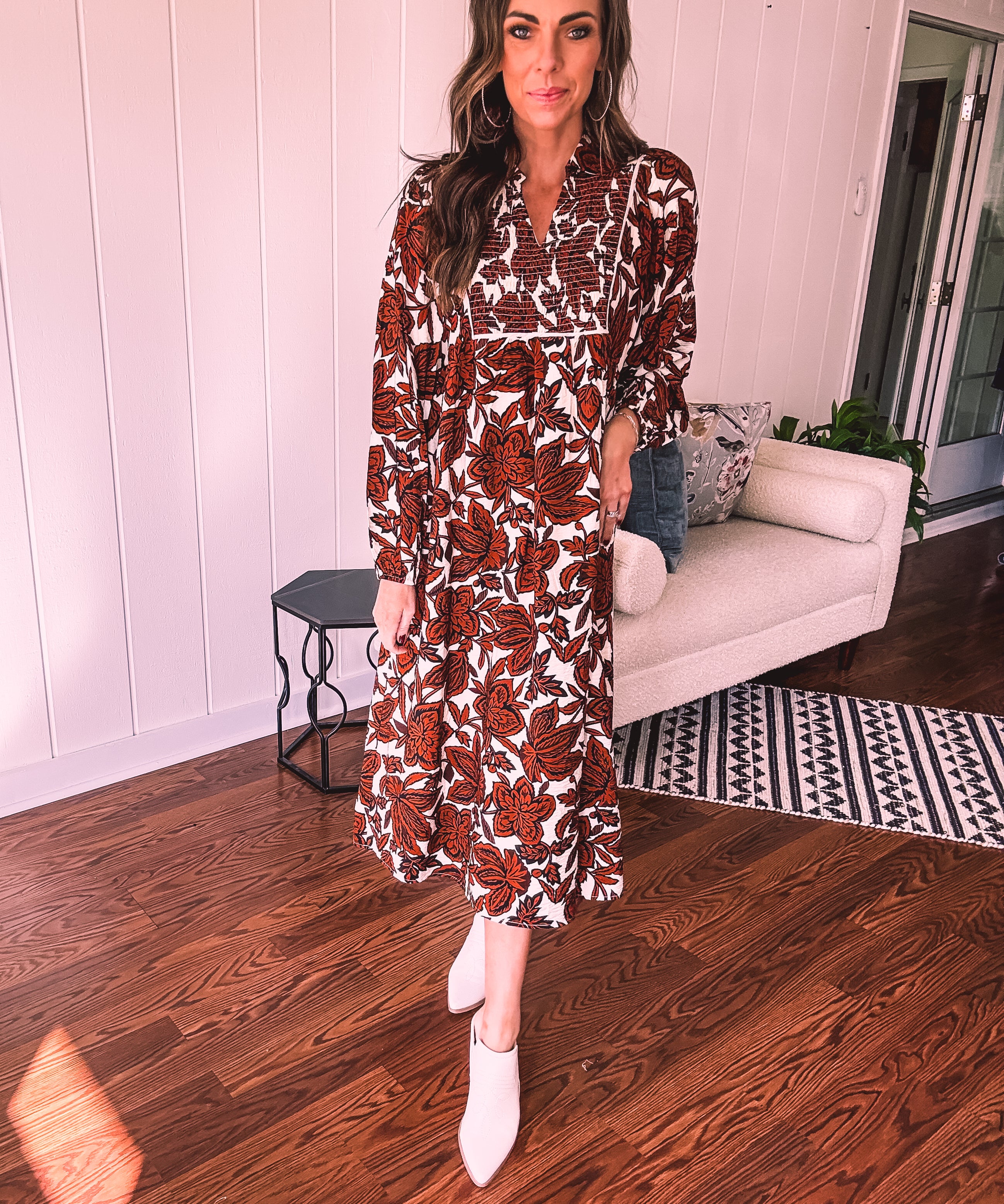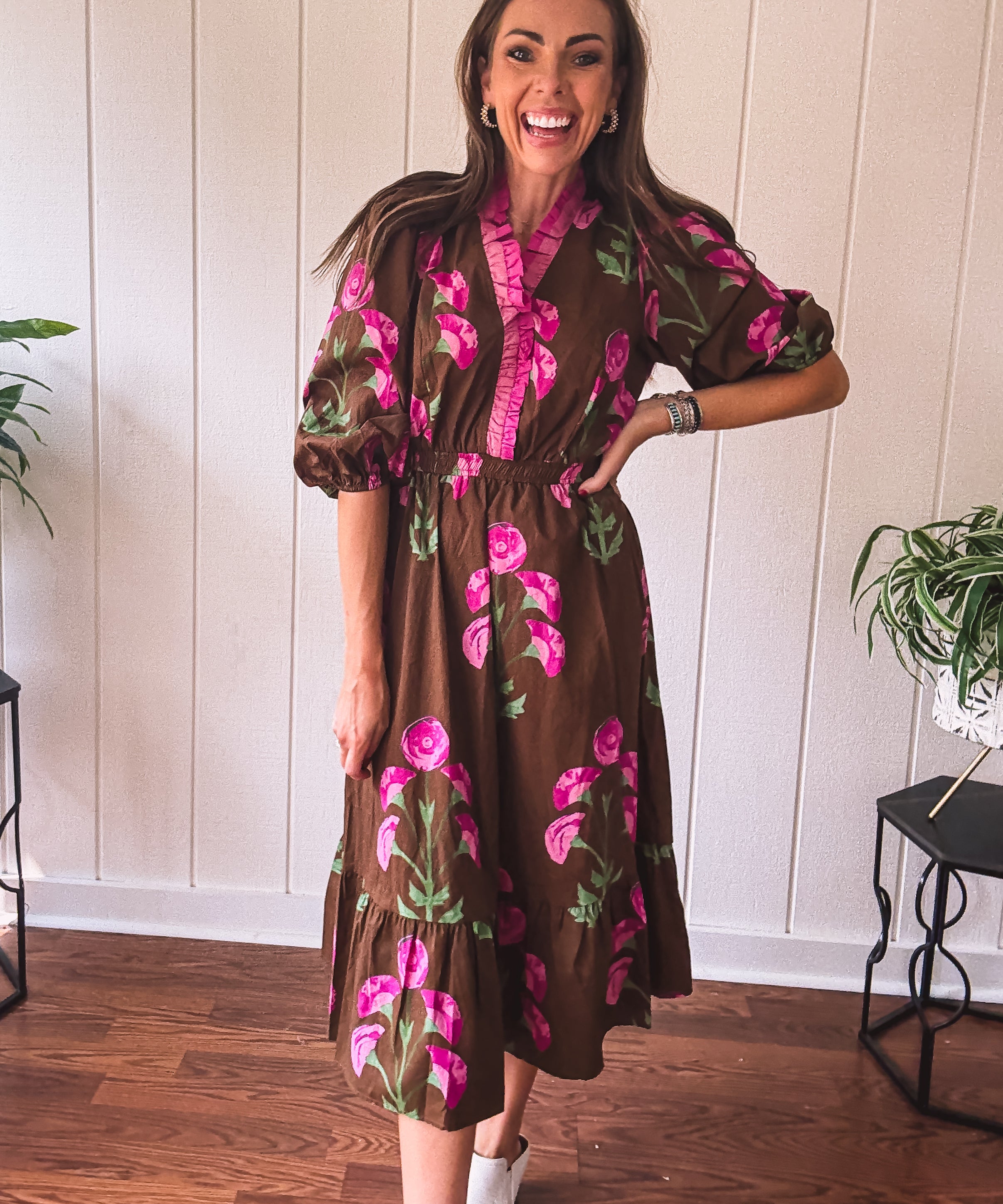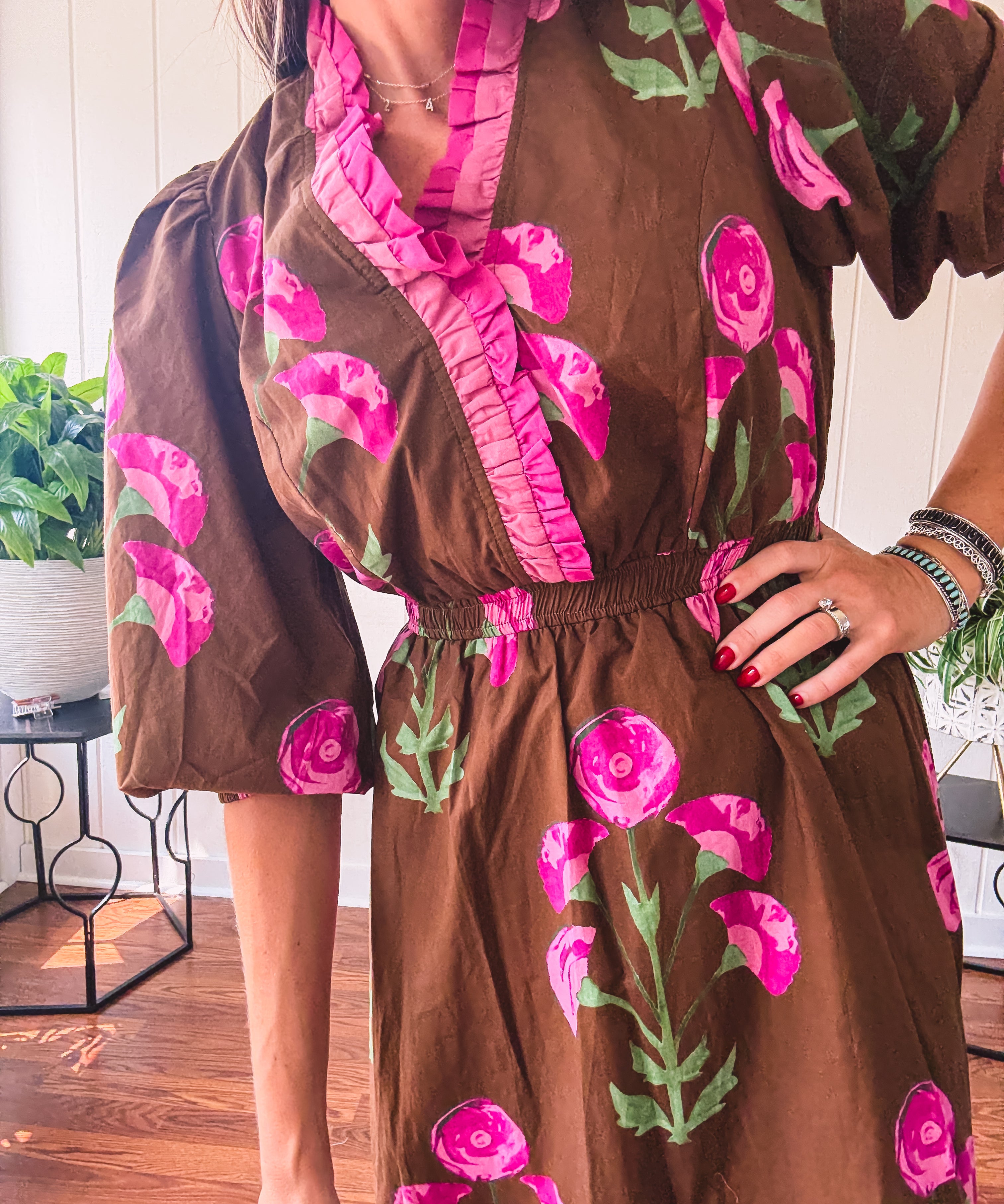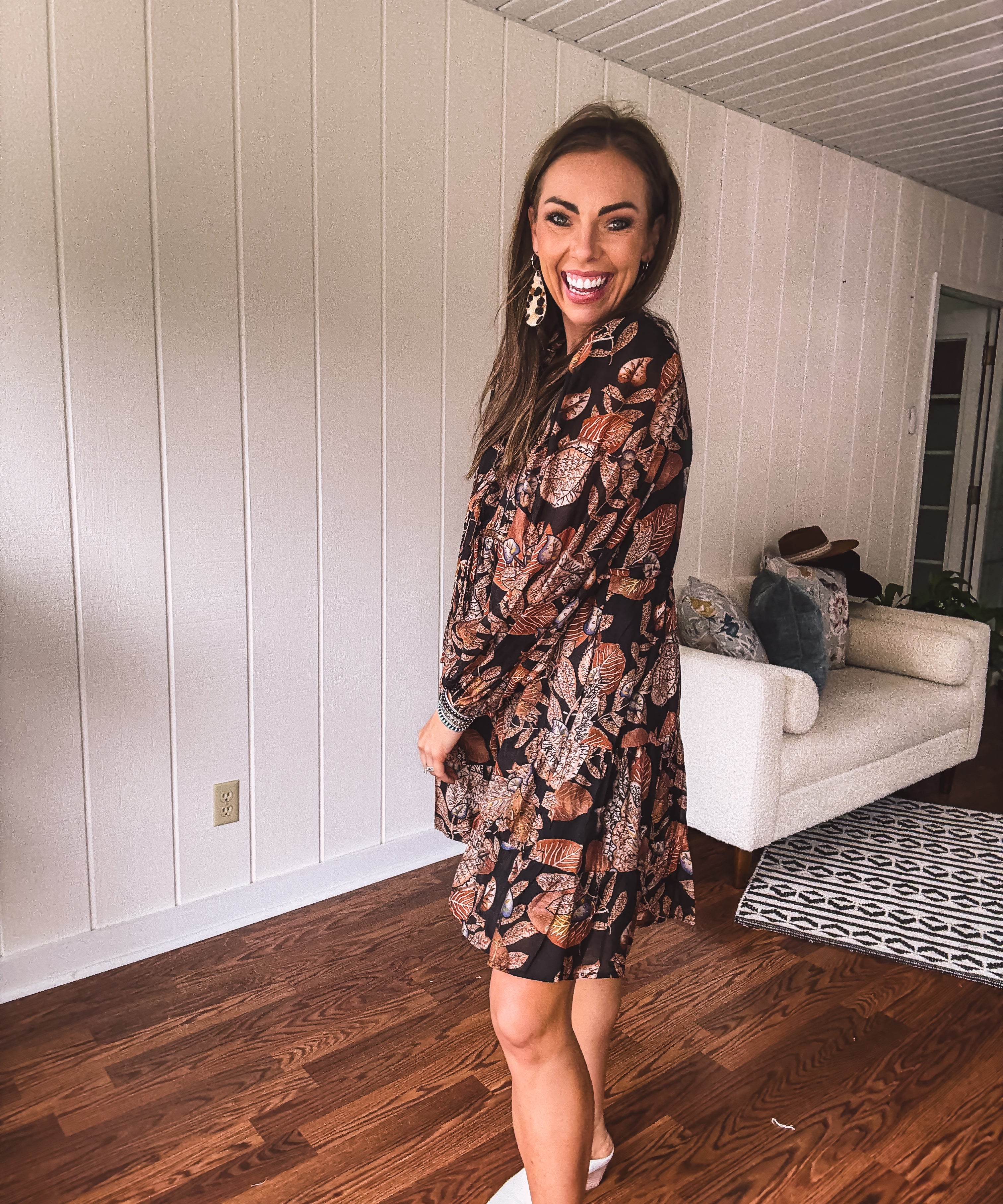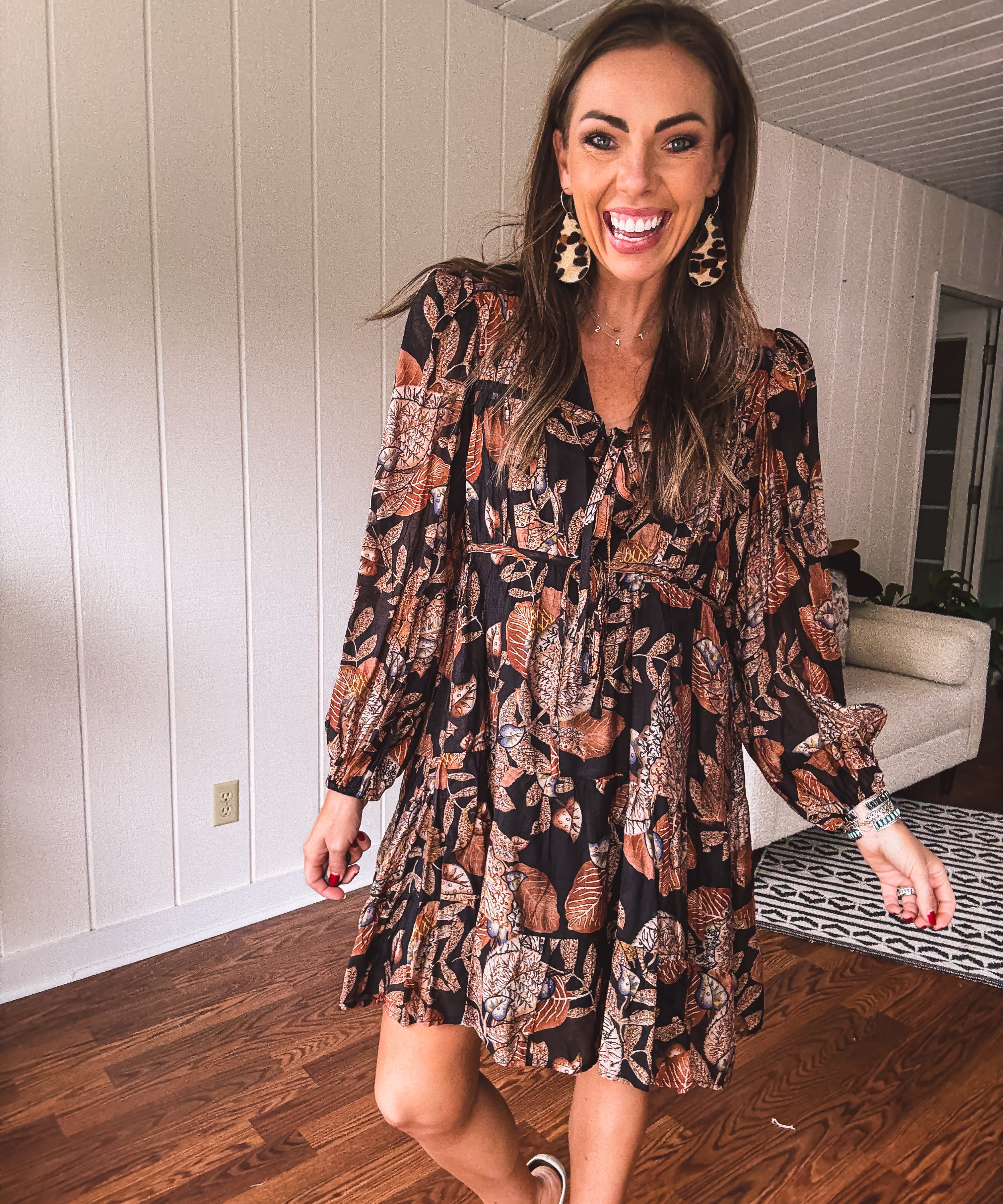 Black Gingko Leaf Printed Chiffon Dress with Smock Yoke