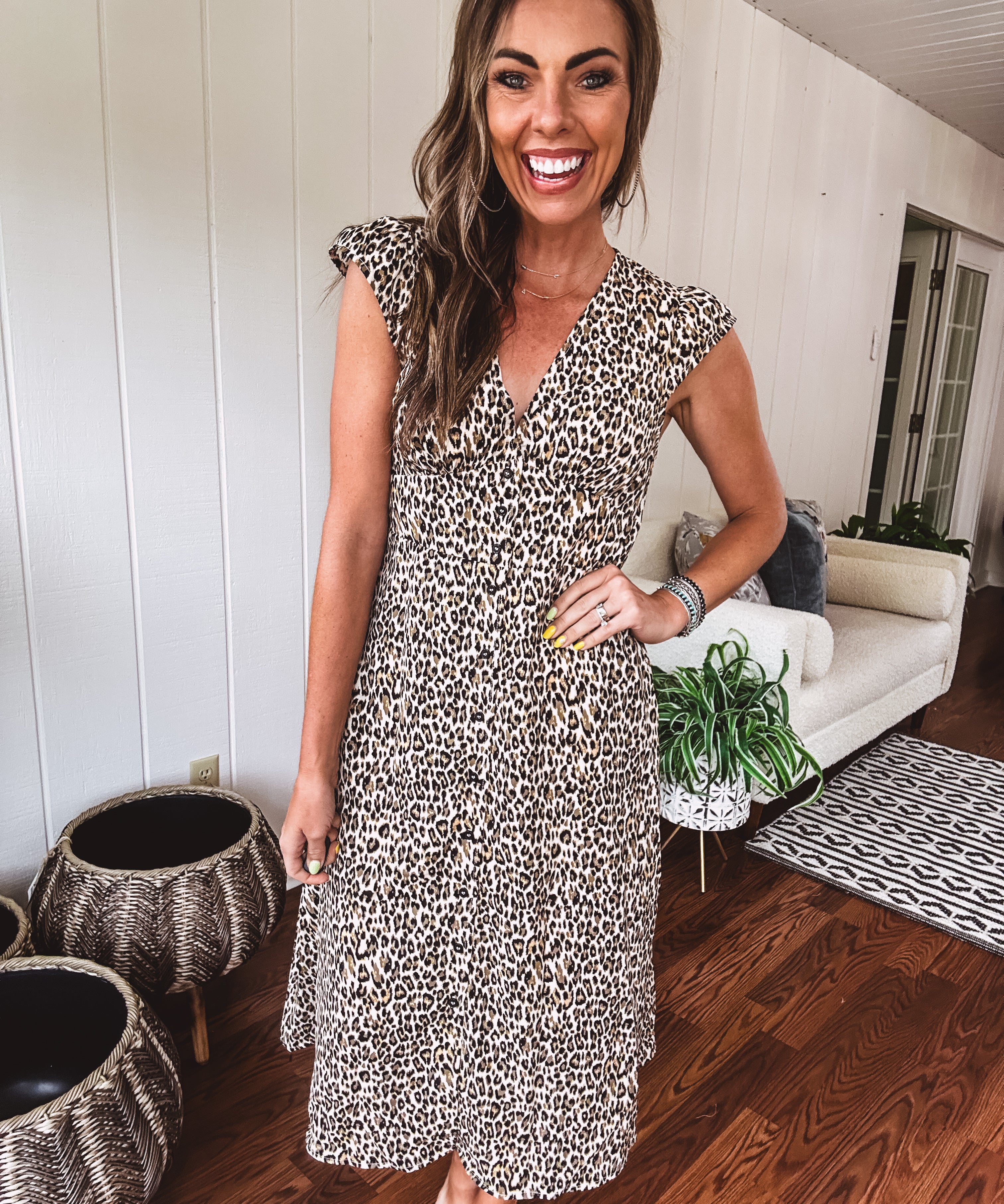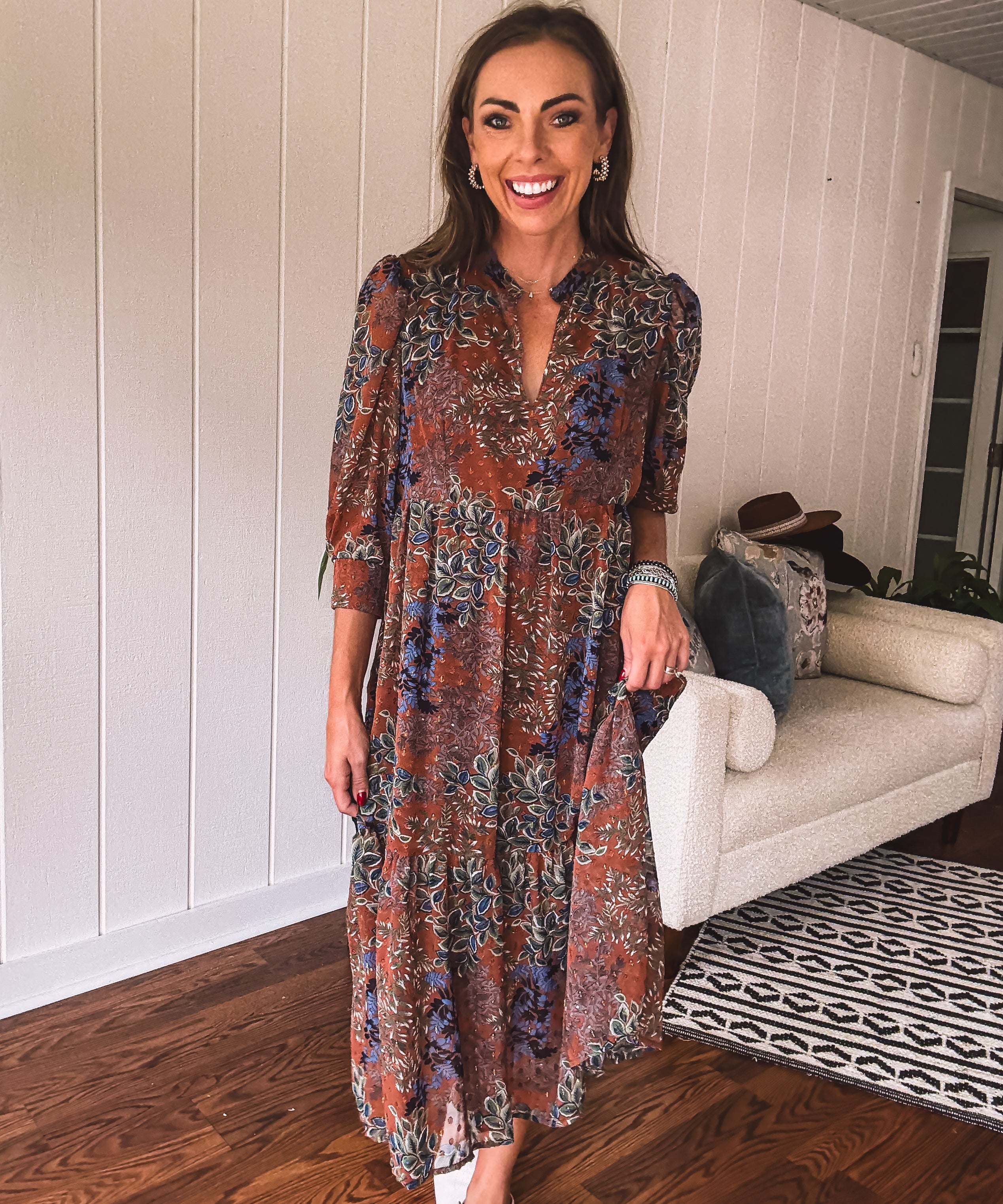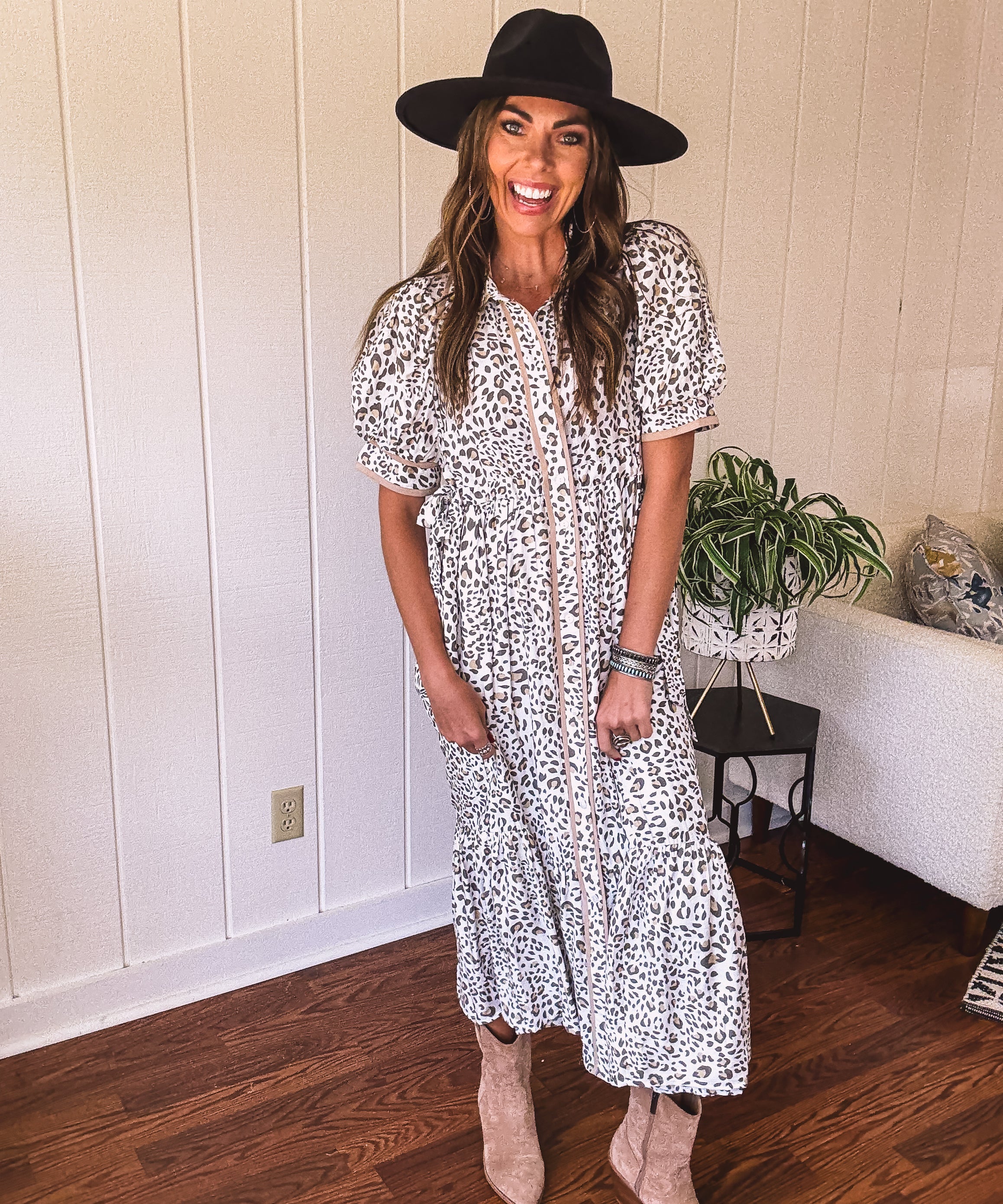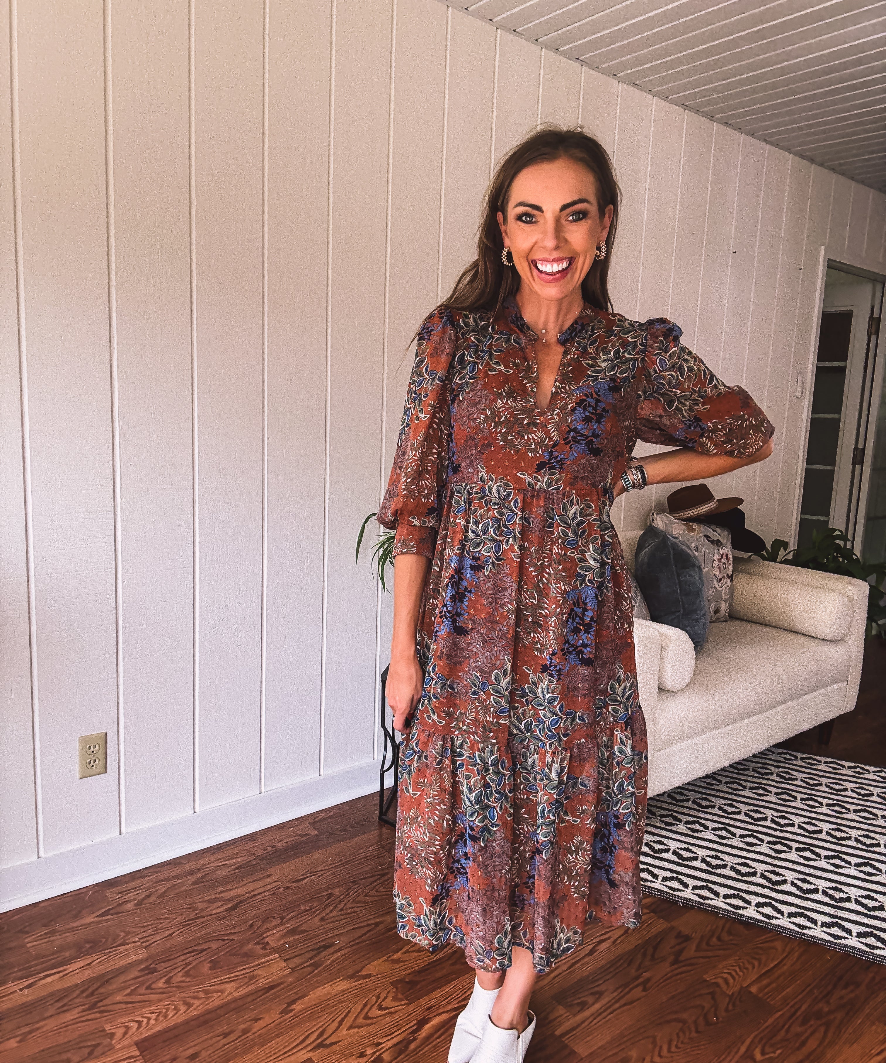 Black Gingko Leaf Printed Chiffon Dress with Smock Yoke