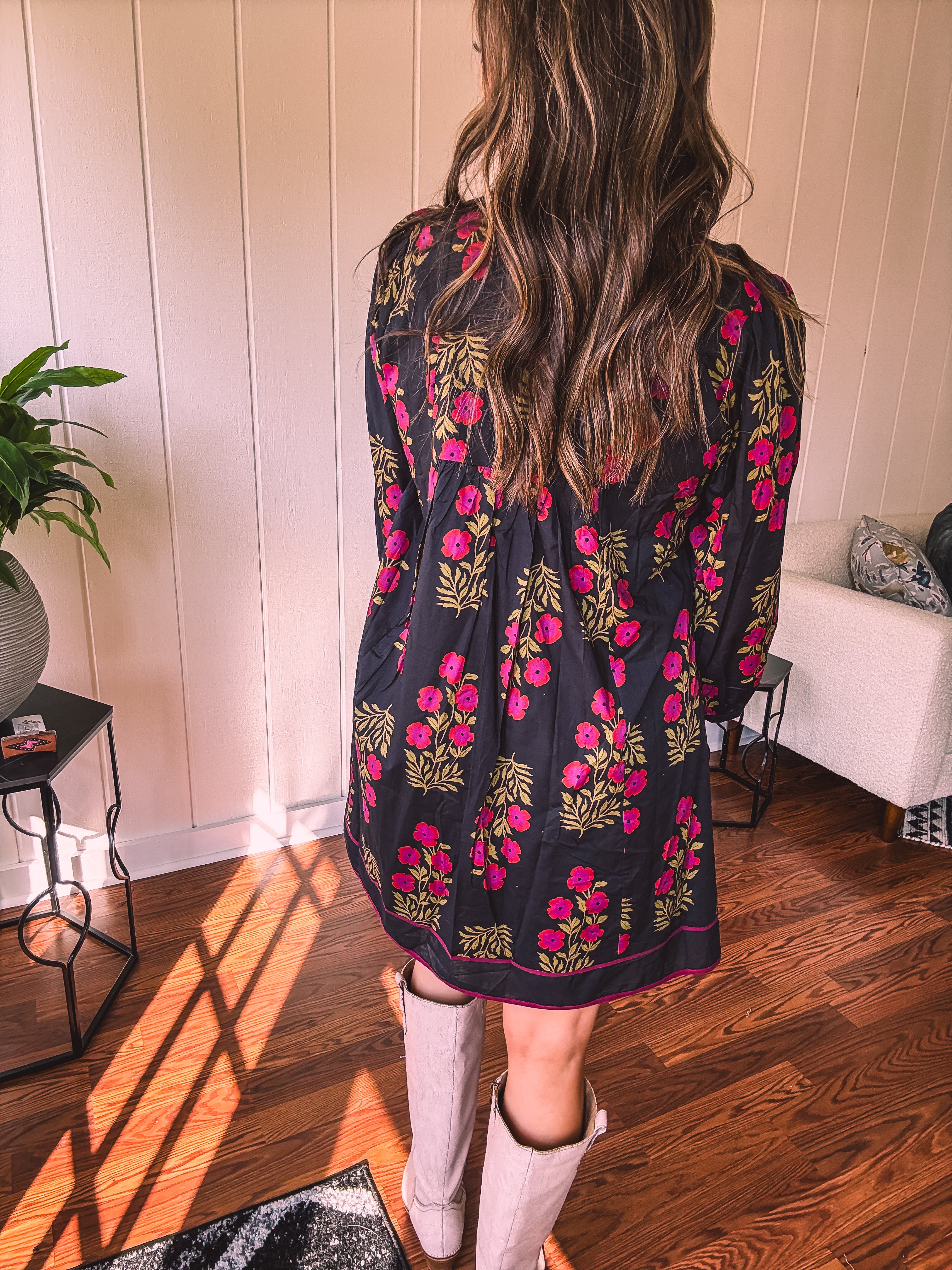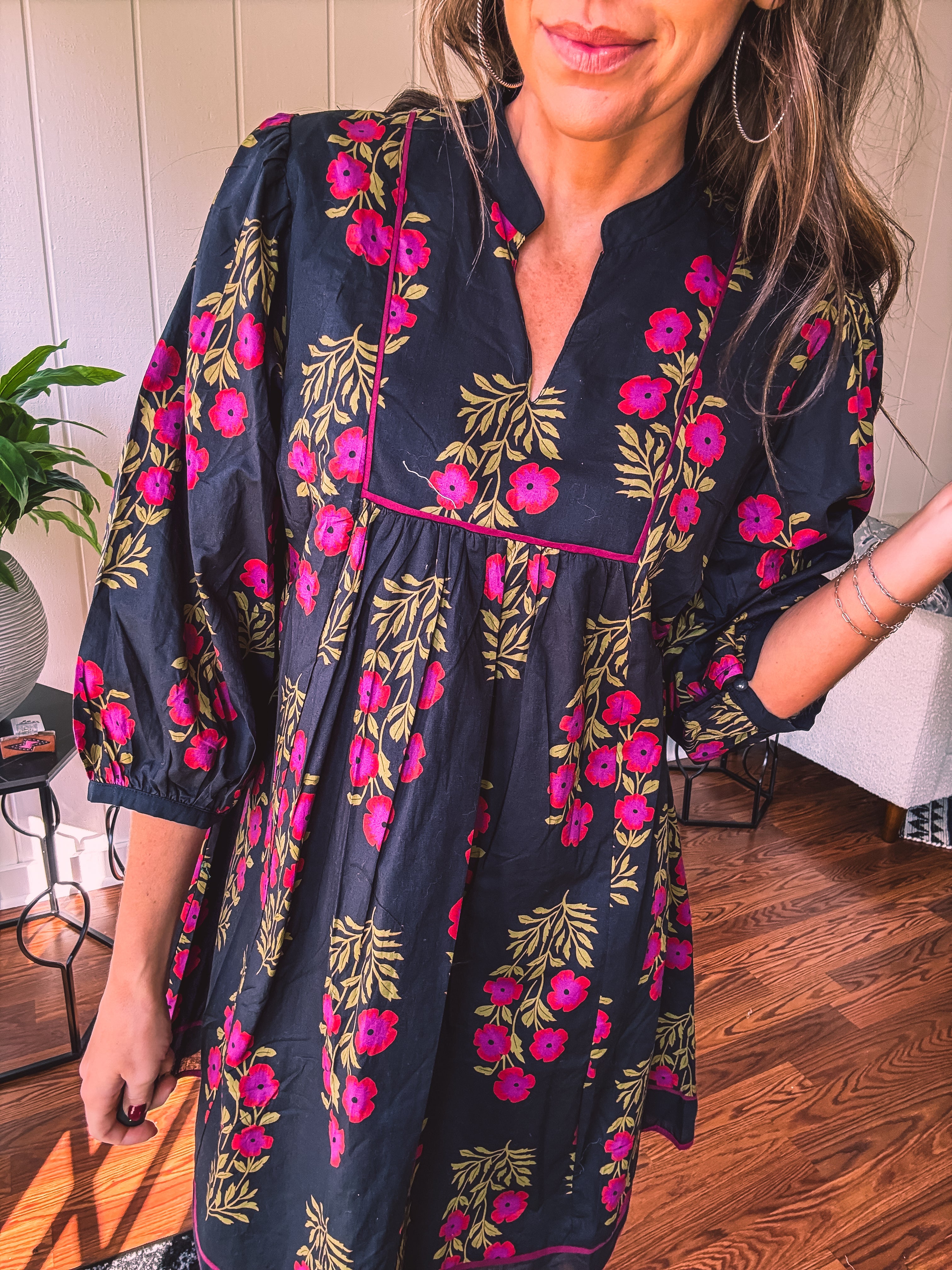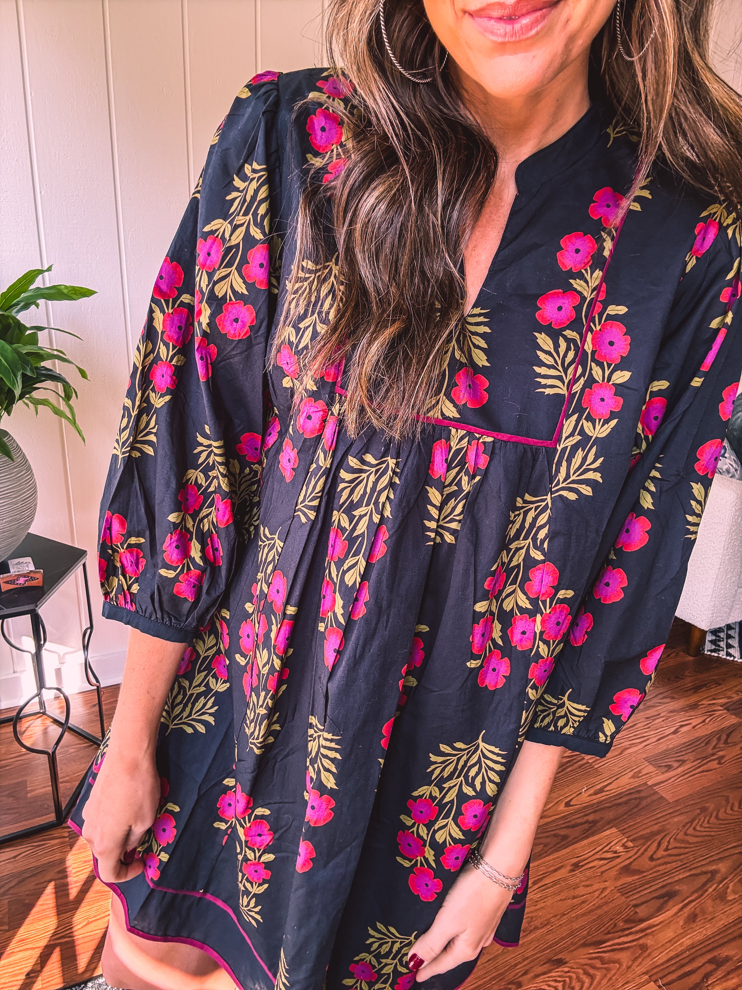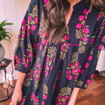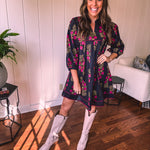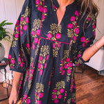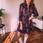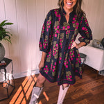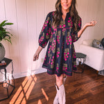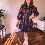 Strike a balance between sweet and bold in this A-line dress that's got serious style credentials. The modest V-neckline paired with a mock collar keeps things sophisticated, while delicate puff sleeves add just the right amount of charm. Wrapped in a stunning black and garnet floral print, it's the kind of piece that works with everything—dress it up with booties or keep it casual with sandals. Fully lined for comfort and cut to flatter every body type, this is the dress that does it all without trying too hard.