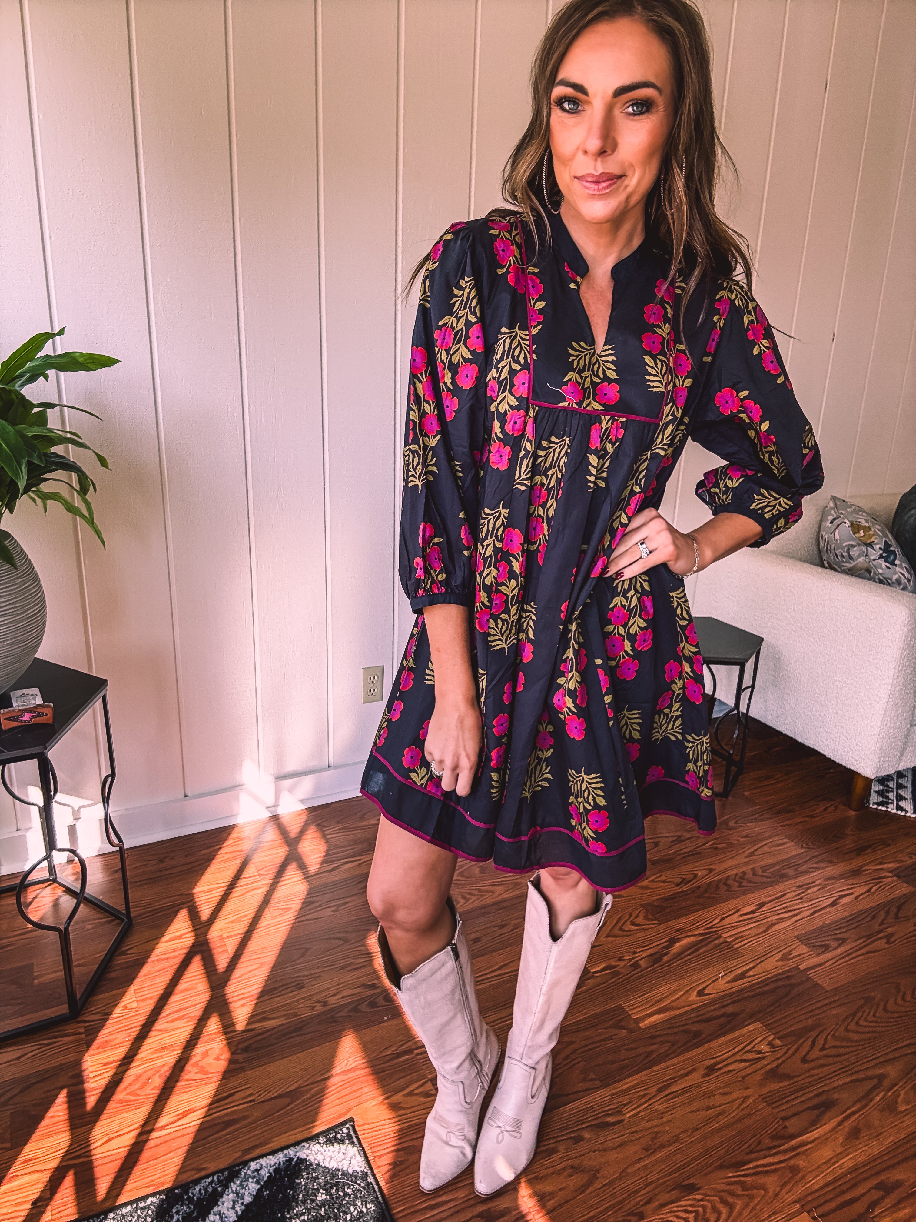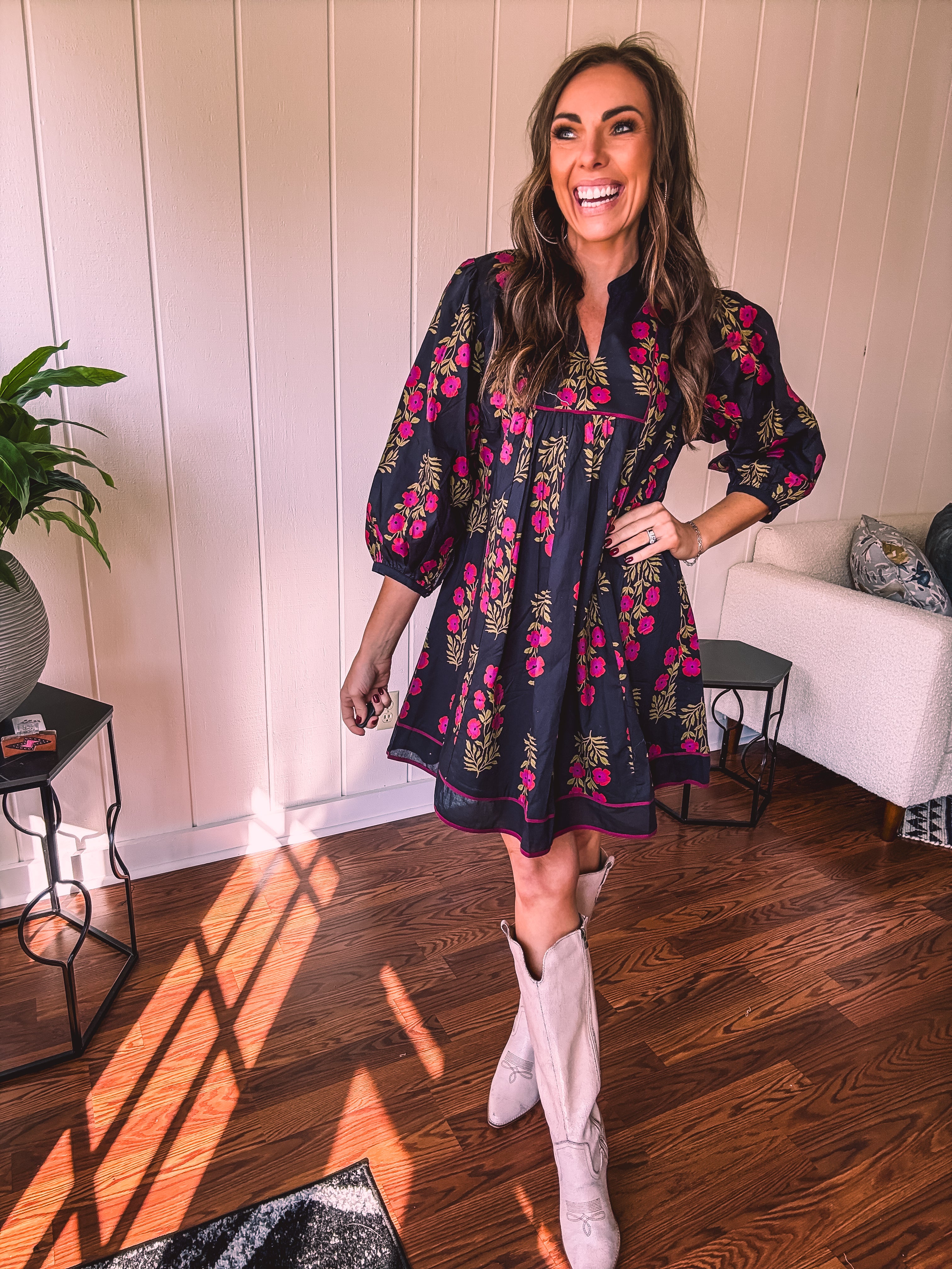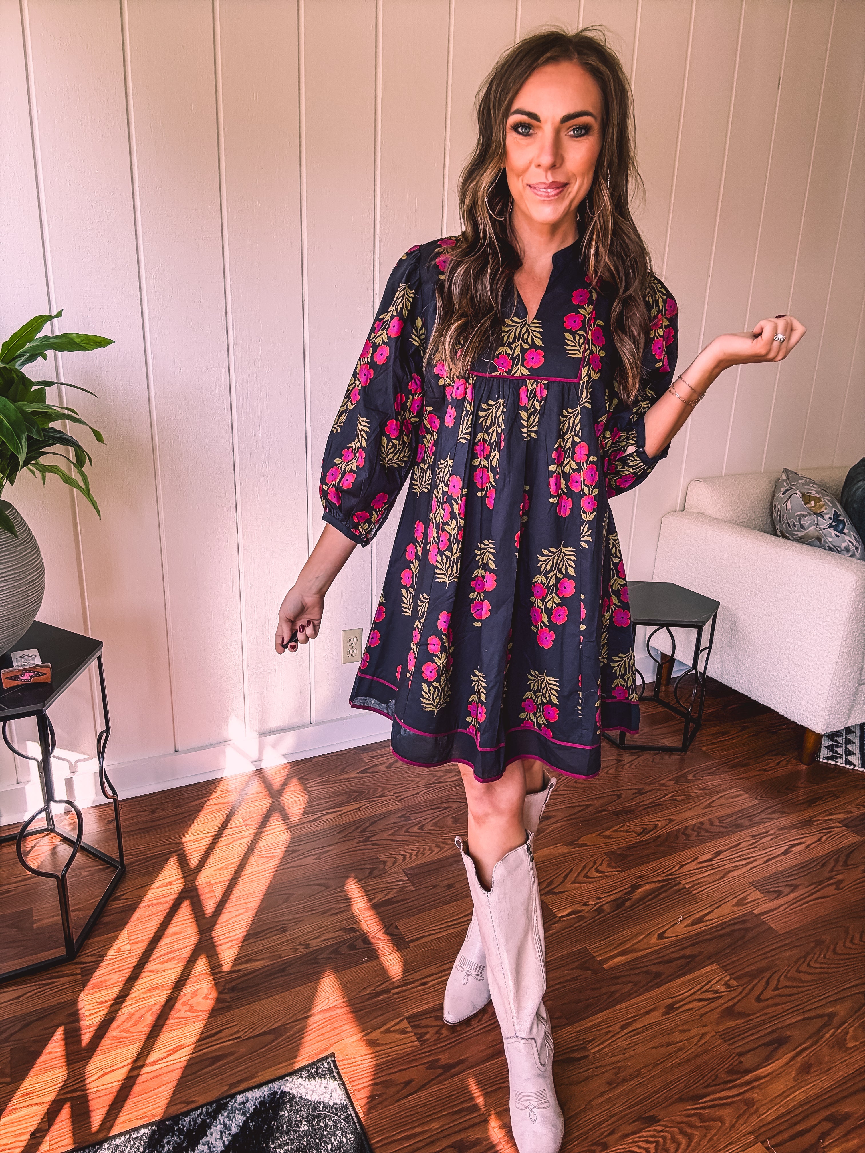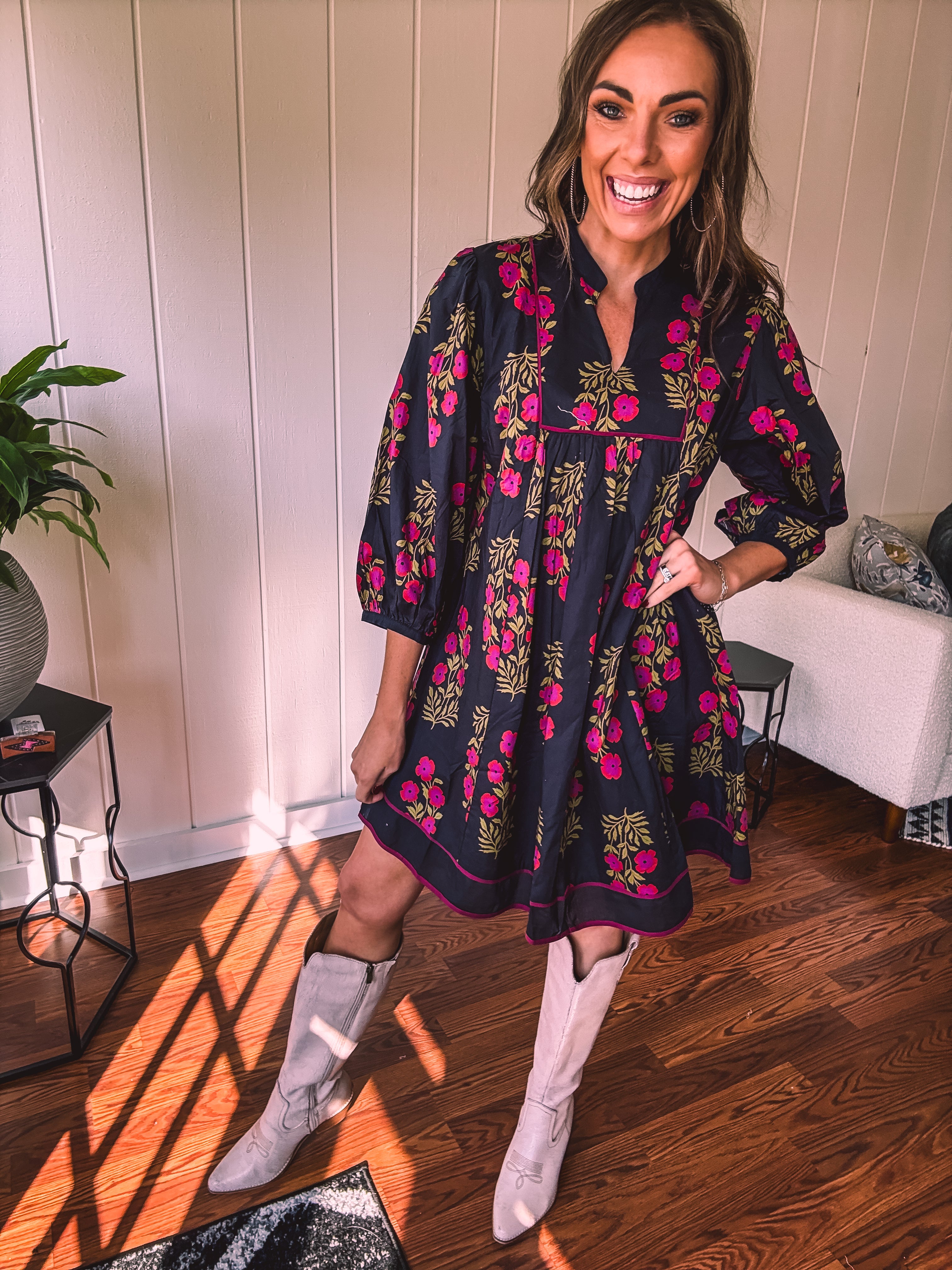 Strike a balance between sweet and bold in this A-line dress that's got serious style credentials. The modest V-neckline paired with a mock collar keeps things sophisticated, while delicate puff sleeves add just the right amount of charm. Wrapped in a stunning black and garnet floral print, it's the kind of piece that works with everything—dress it up with booties or keep it casual with sandals. Fully lined for comfort and cut to flatter every body type, this is the dress that does it all without trying too hard.