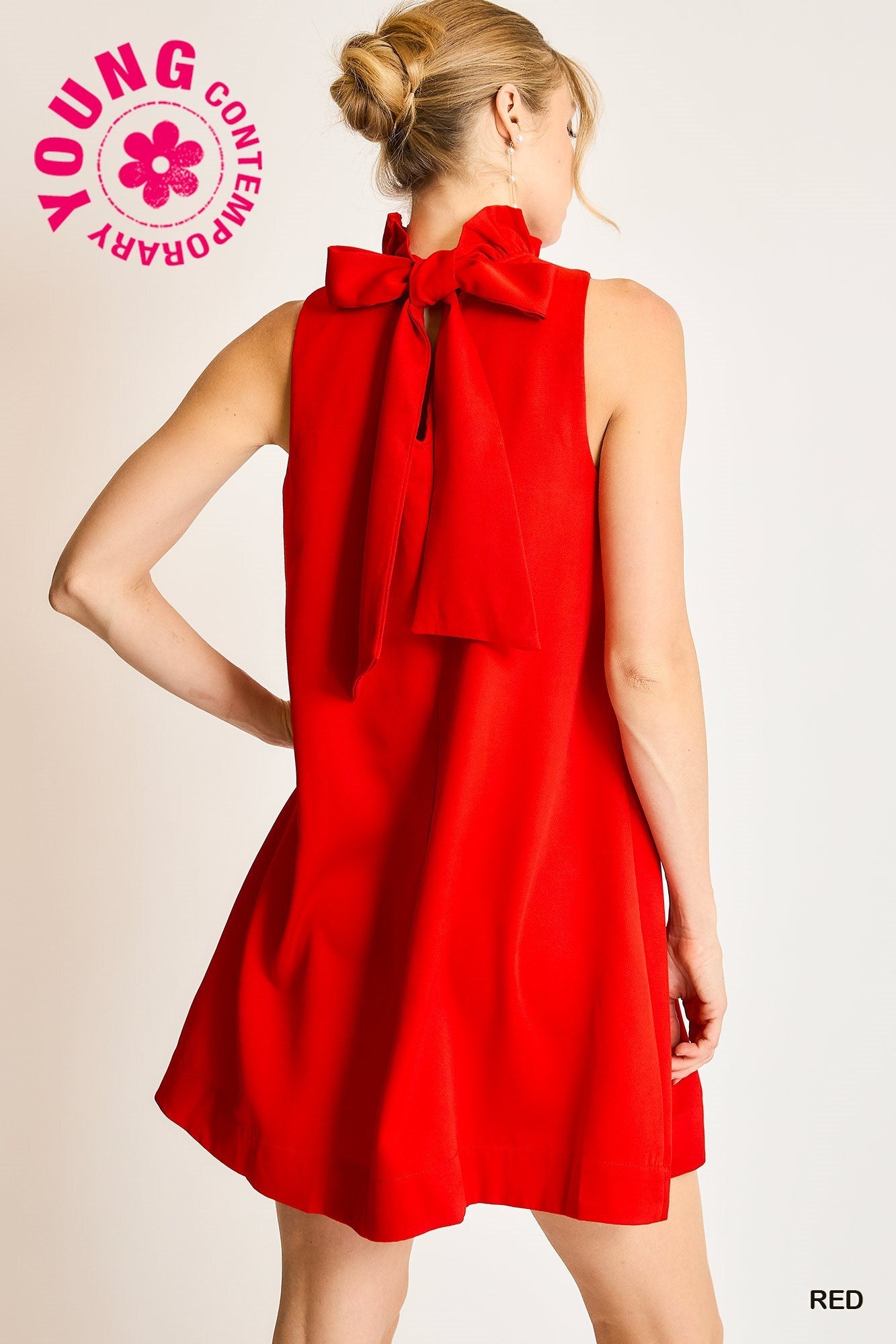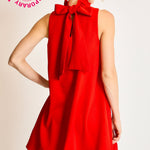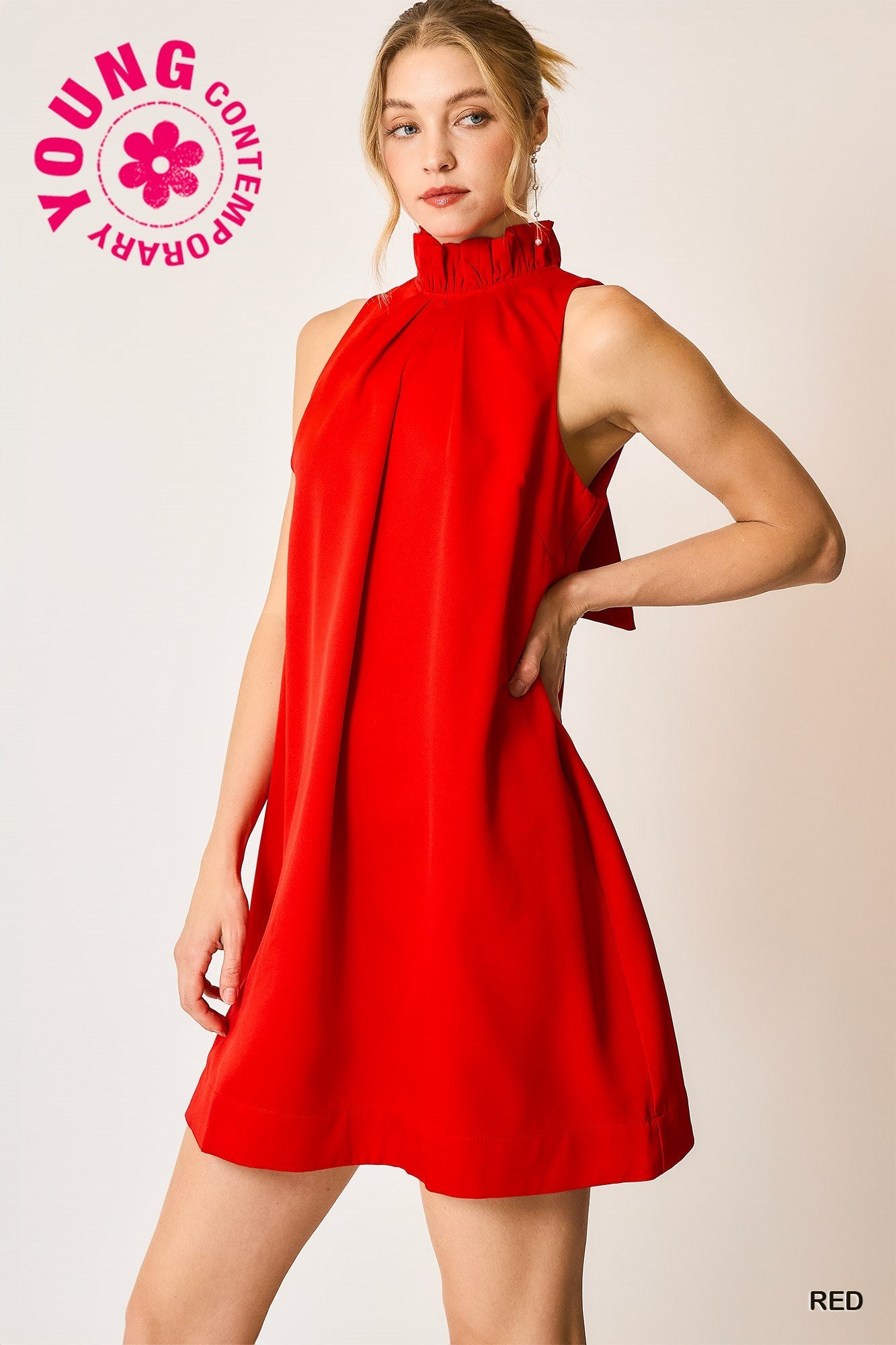 Turn up the heat in this fiery red A-line mini that's ready to steal the spotlight. The high ruffled neckline and cheeky tie-back detail give it serious personality, while the unlined cut keeps things breezy and fun. Pair it with your favorite heels and statement earrings for an outfit that absolutely commands attention—because sometimes you've got to dress like you own the room.
