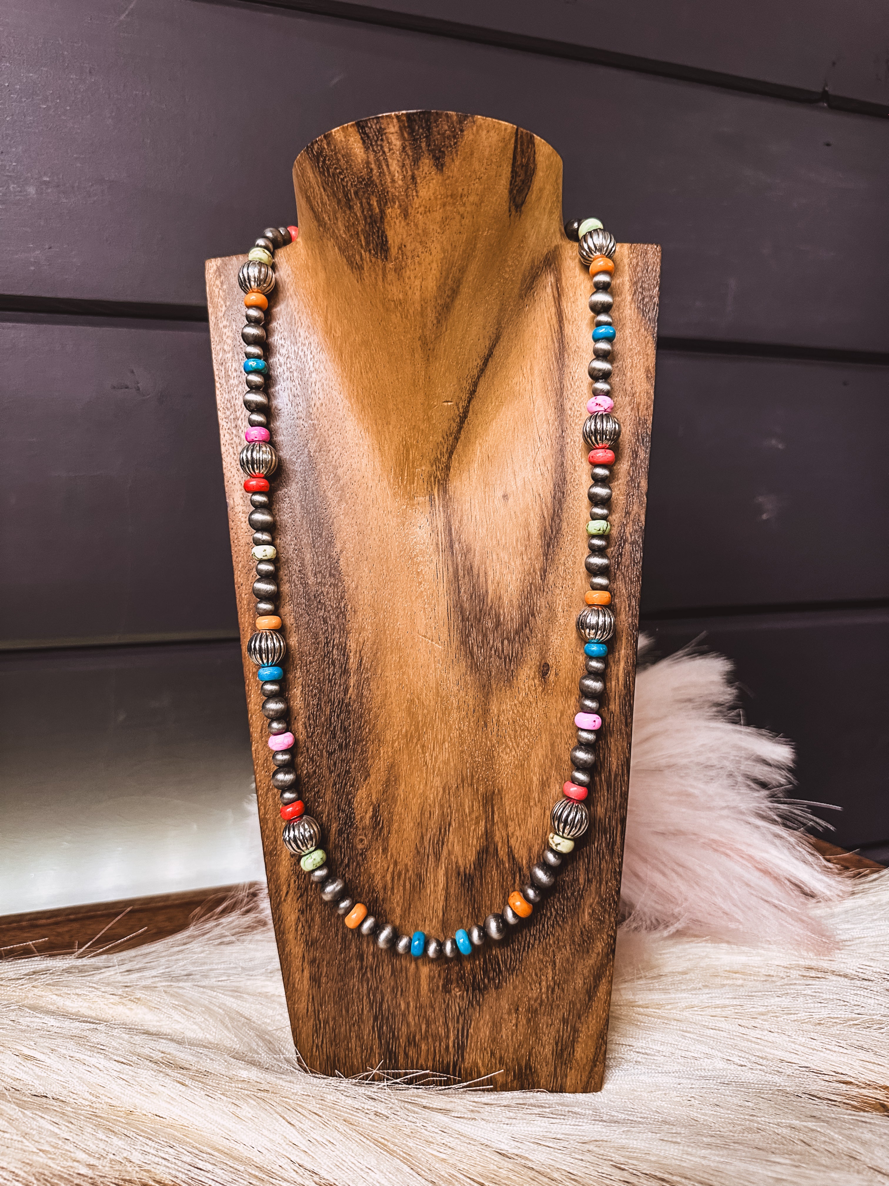 Brighten up any outfit with this playful 5+8mm Shiny Silver + Multi Faux 24" Necklace. Designed with faux sterling silver beads paired with vibrant multi-colored stones, it delivers a bold, eye-catching style that feels light and comfortable to wear. Perfect for adding a splash of color and sparkle without the weight or cost of genuine metals, this necklace effortlessly elevates your look—whether you’re dressing up for a night out or bringing fun vibes to your everyday ensemble. Let your style shine with this striking and affordable statement piece!