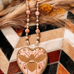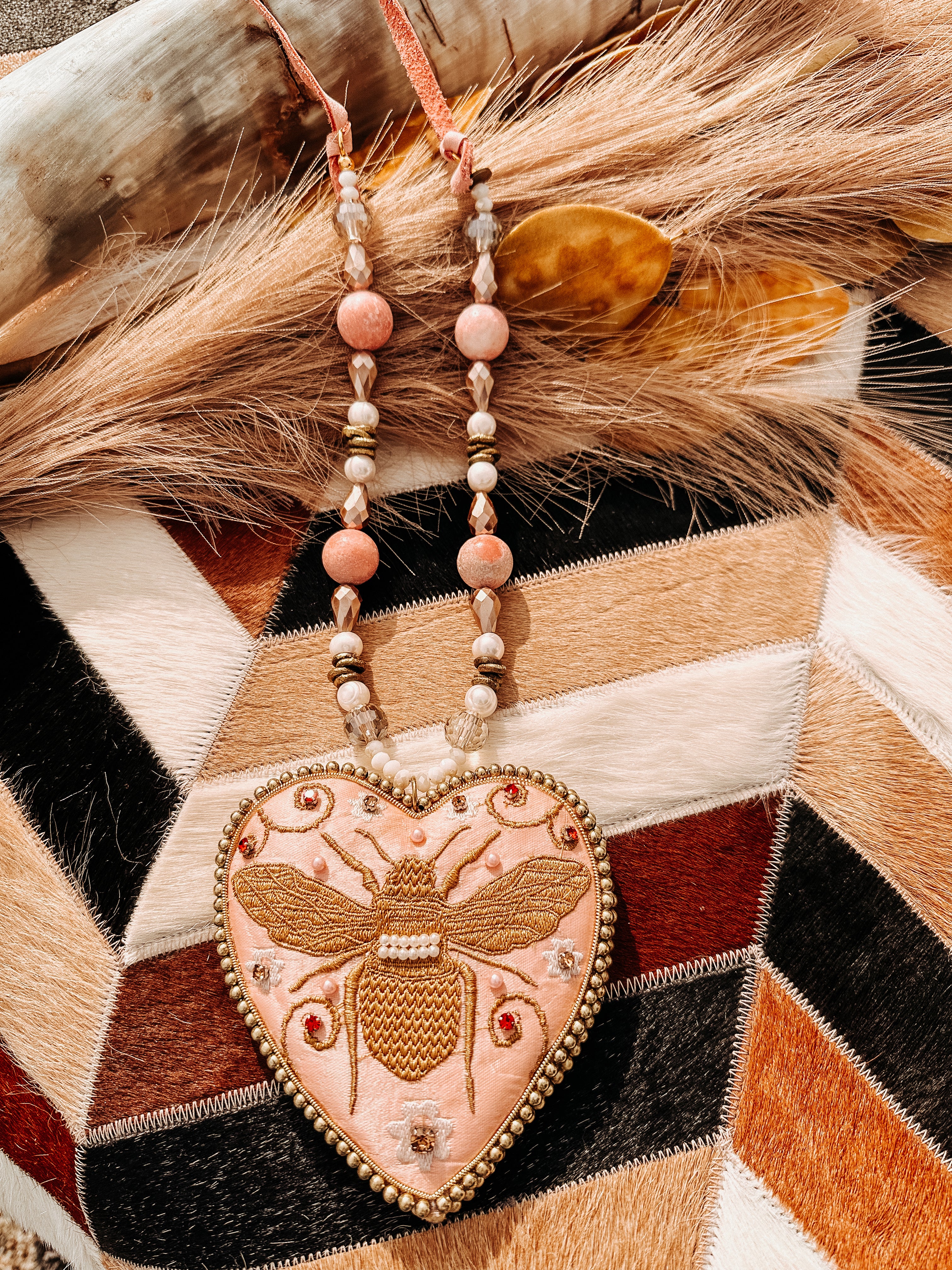 This unique and absolutely gorgeous necklace is a twist on the famous Stevie Nicks quote: "Don't be a lady, be a legend." But, who says you can't be both? The oversized puff heart pendant is covered with velvet on one side and satin on the other and is embellished with faux pearls, and colored stones and embroidered with a golden bee! It hangs from a chain of white pearls, rose gold, pink and bronze beads and ties by pink leather straps. A legend is born with whomever wears this beauty!
