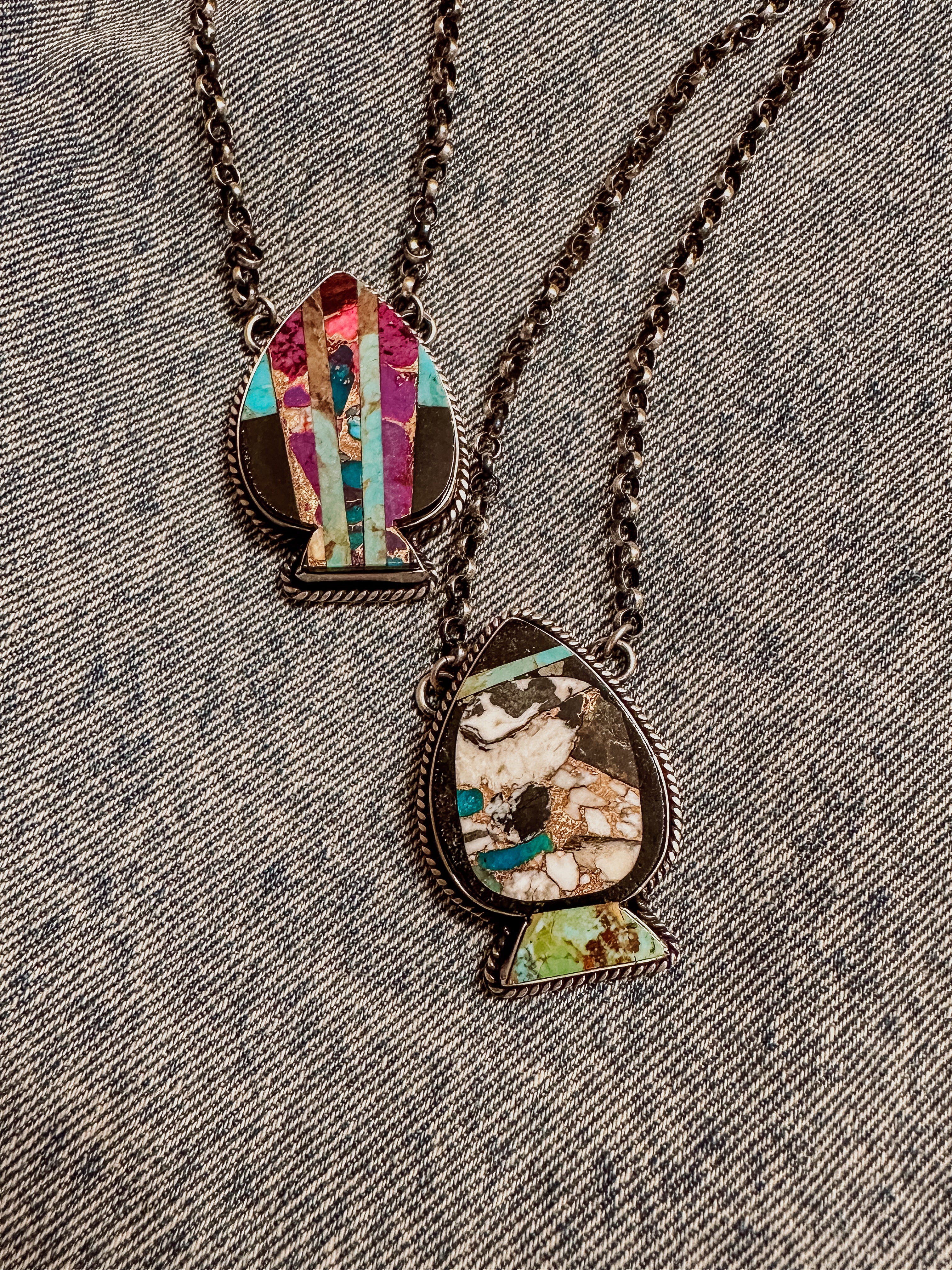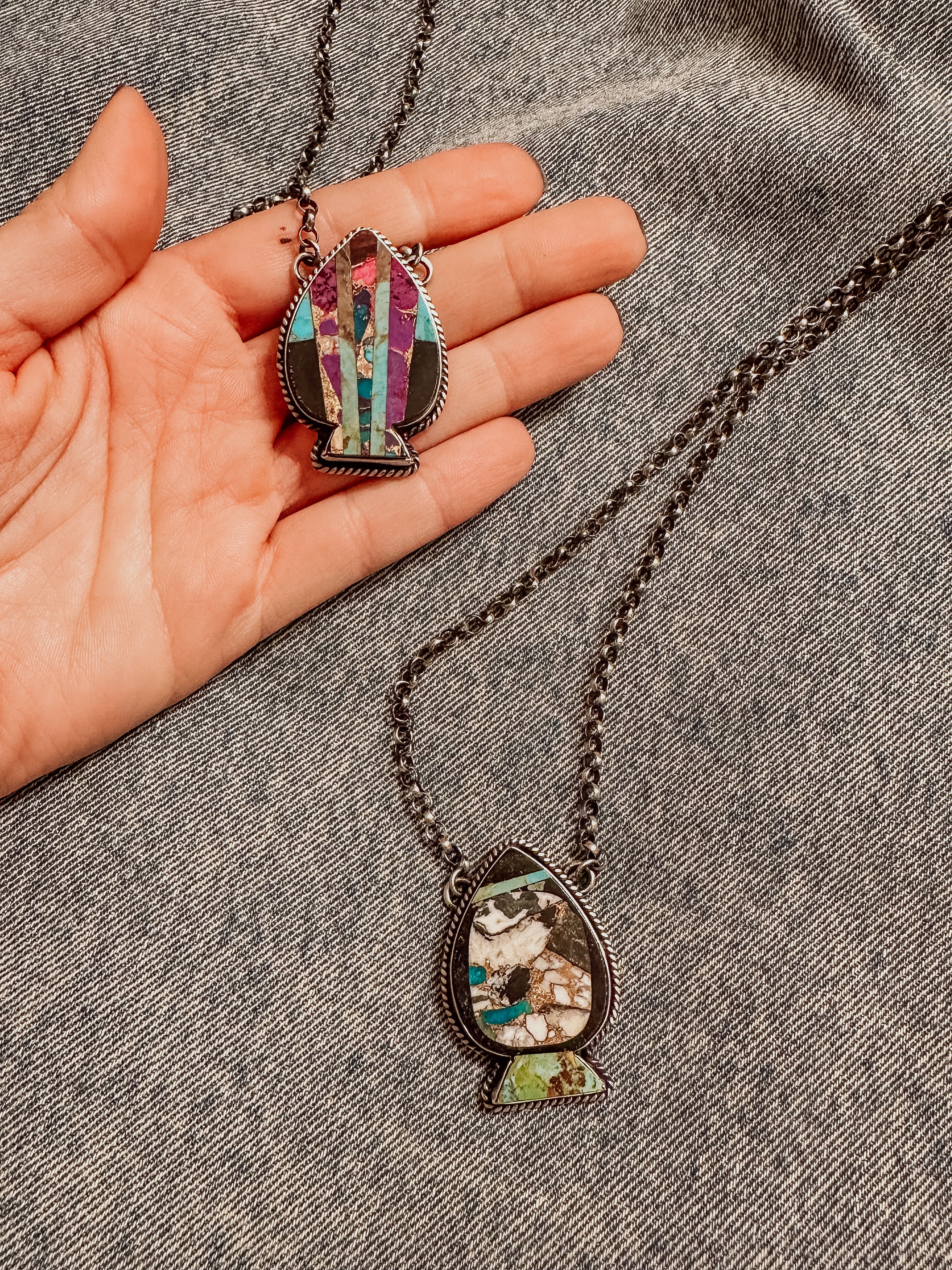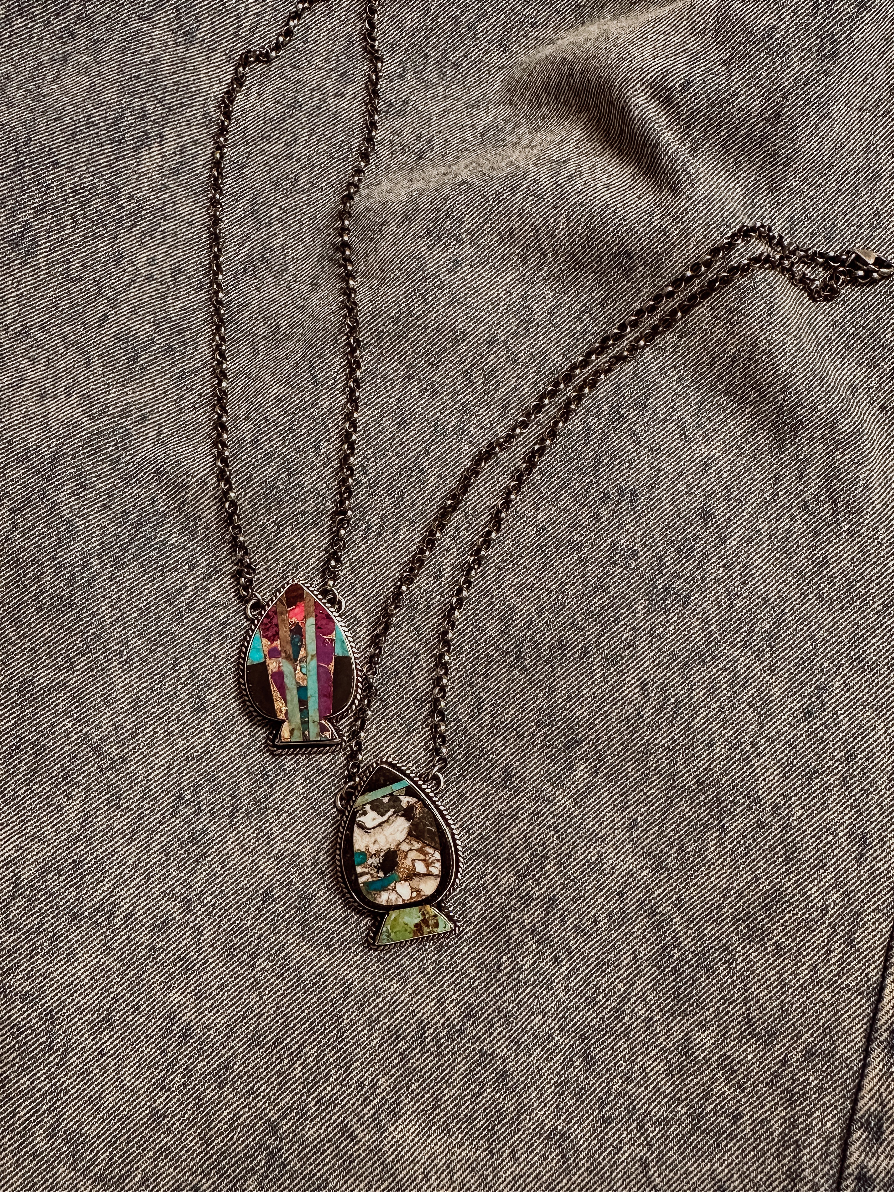 Elevate your look with the playful charm of our Call a Spade Turquoise Necklace. This eye-catching piece combines vibrant turquoise and purple Mojave stones, creating a colorful blend that sparks adventure and fun. Crafted with authentic sterling silver, the unique spade design adds a bold statement to your everyday style. Perfect for those who love to mix funky accents with their wardrobe, this necklace invites you to embrace your daring side while enjoying quality materials and standout color. Let your accessories do the talking with this lively and spirited treasure.