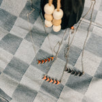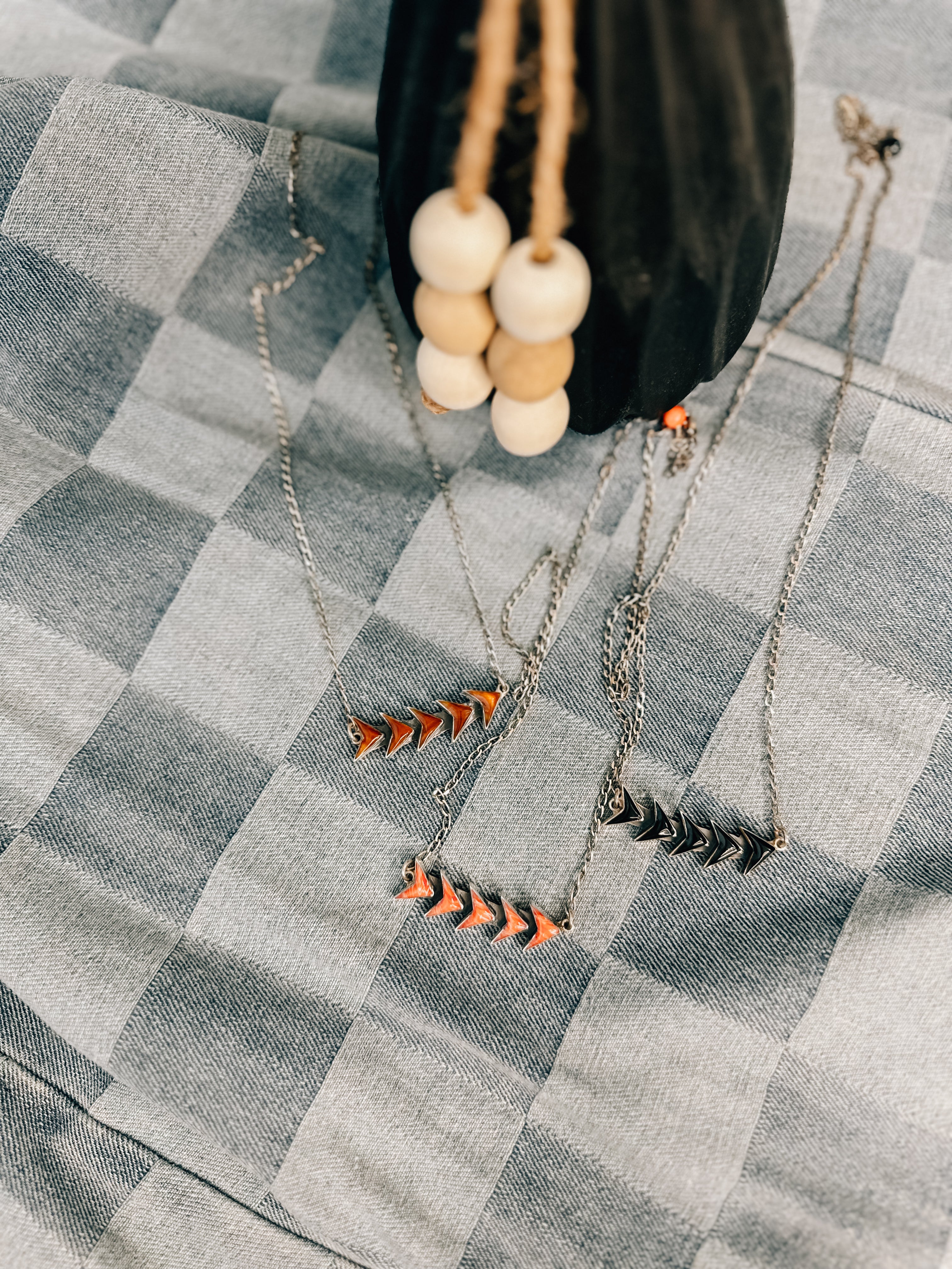 This stunning necklace features a dainty chain adorned with 5 authentic Coral stones in an arrow shape, all expertly inlaid in genuine sterling silver. While it looks gorgeous on its own, it can also elevate your entire look when paired with Navajo Pearls or other pieces in sterling silver.