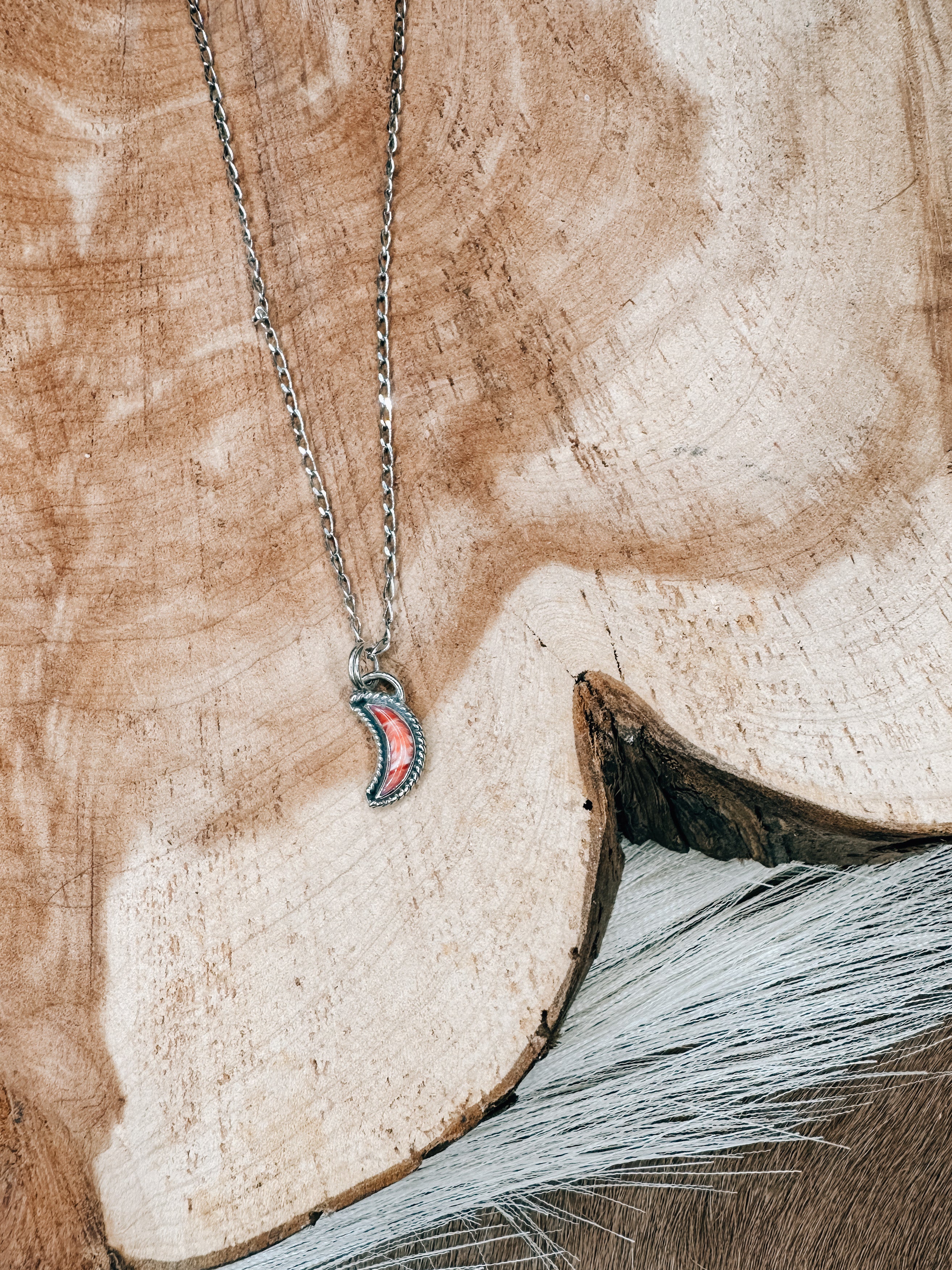 Immerse yourself in the beauty and symbolism of the Authentic Coral Moon Necklace. Handcrafted with a genuine sterling silver chain and a crescent moon-shaped inlay, this piece evokes new beginnings, feminine power, love, and fertility. Enhance your jewelry collection and channel positive energy by pairing it with your favorite Sterling Silver pieces or Navajo Pearls.