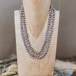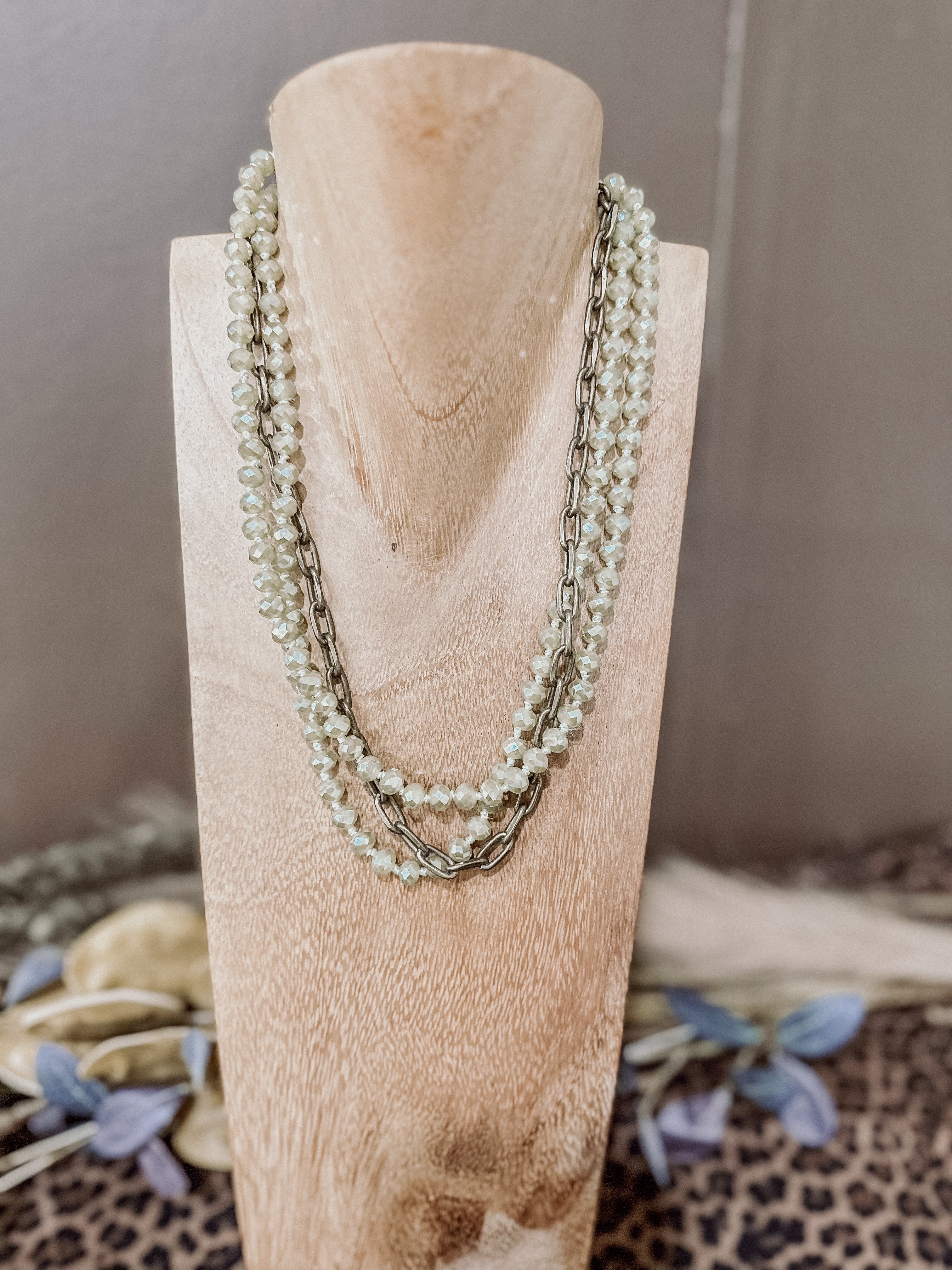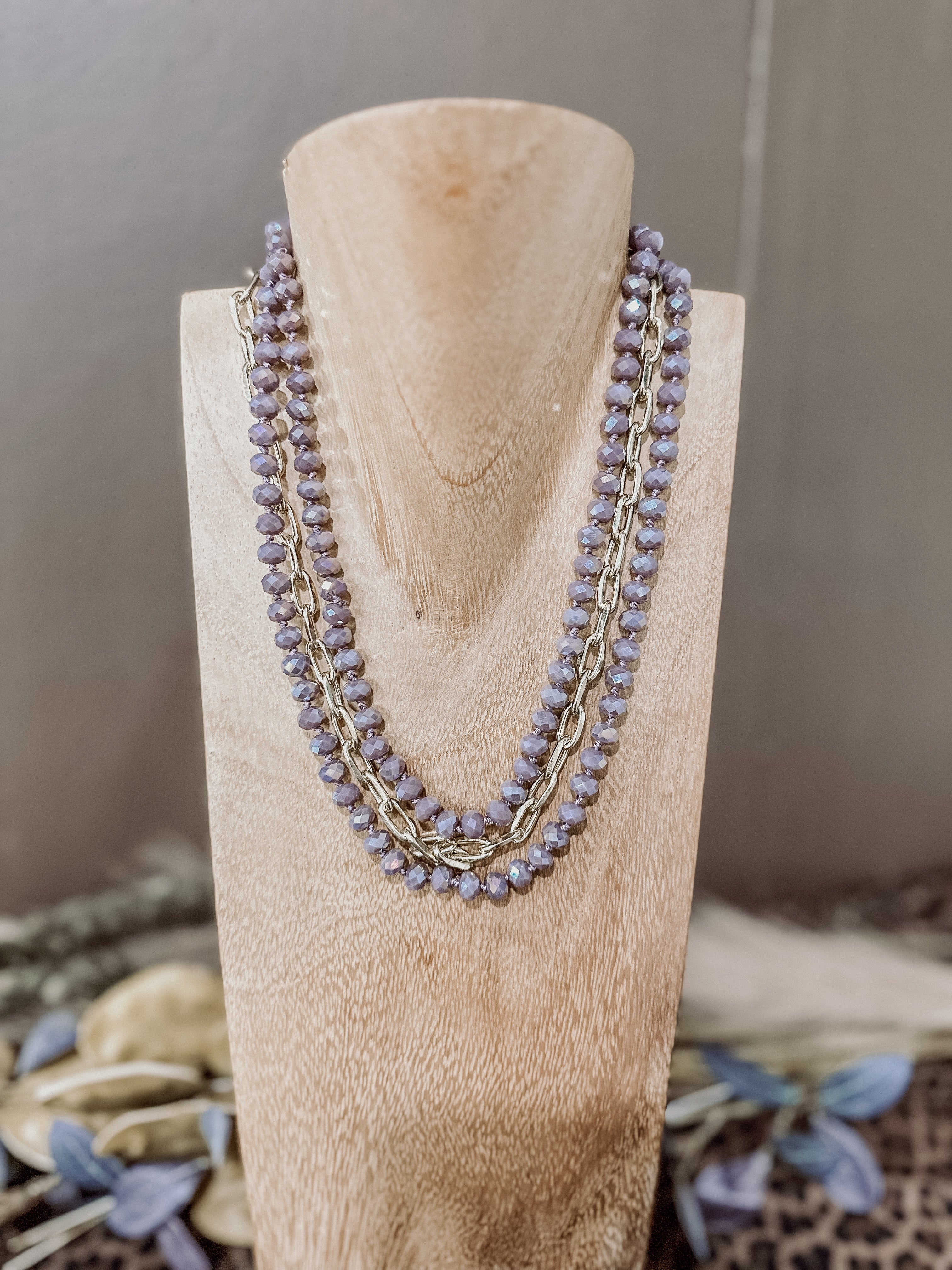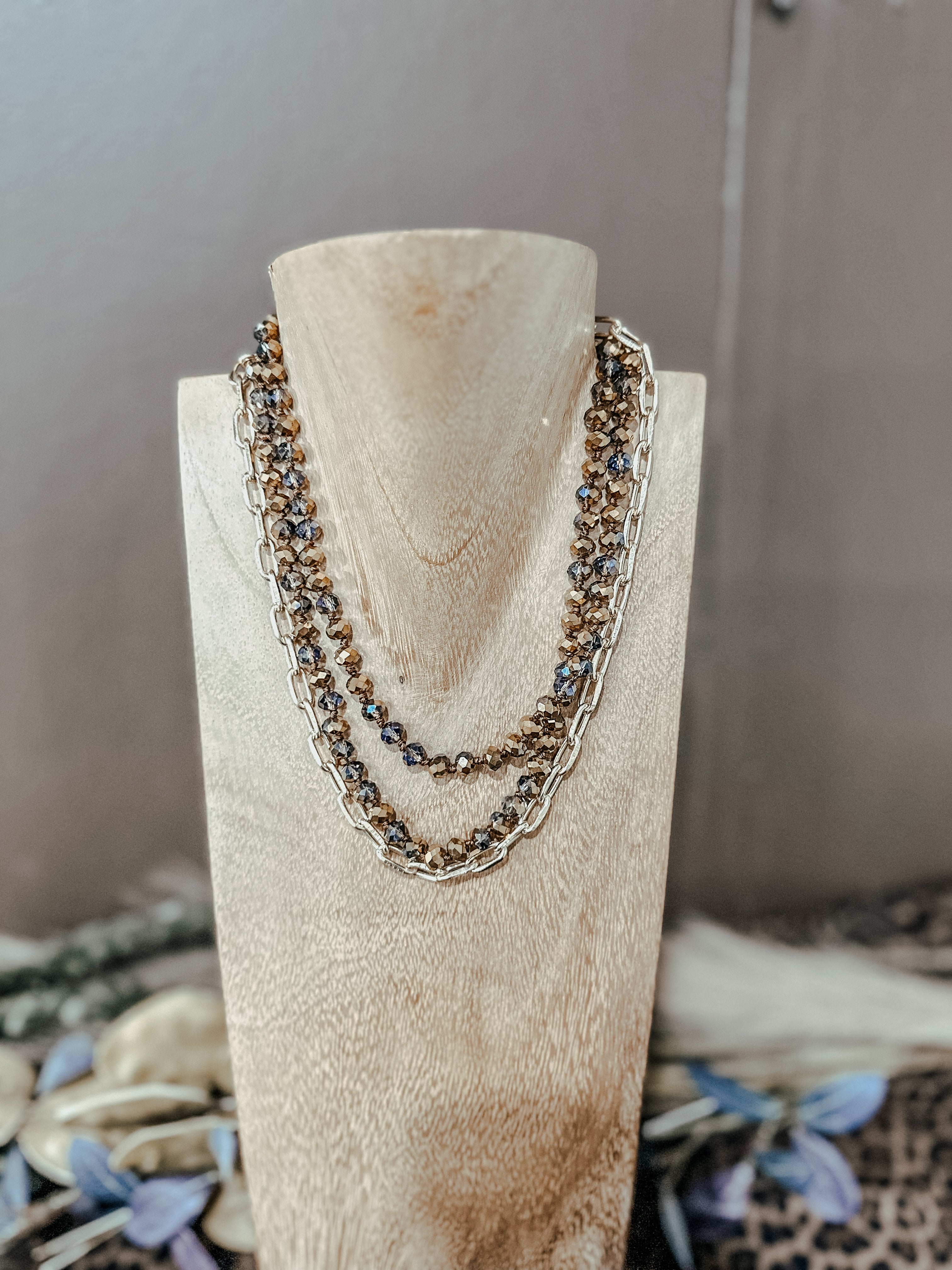 Add a touch of playful glamour to any outfit with the Double Glitz Chain Necklace. This eye-catching textured muted gold paper clip chain is beautifully paired with your choice of a brushed olive, lime, bronze, or lavender beaded necklace, each one designed to shimmer and catch the light exquisitely. Perfect for layering or wearing solo, this necklace brings a burst of color and sparkle to your look, adding that perfect blend of chic style and bold drama for any occasion. Elevate your accessory game with this versatile and vibrant piece.