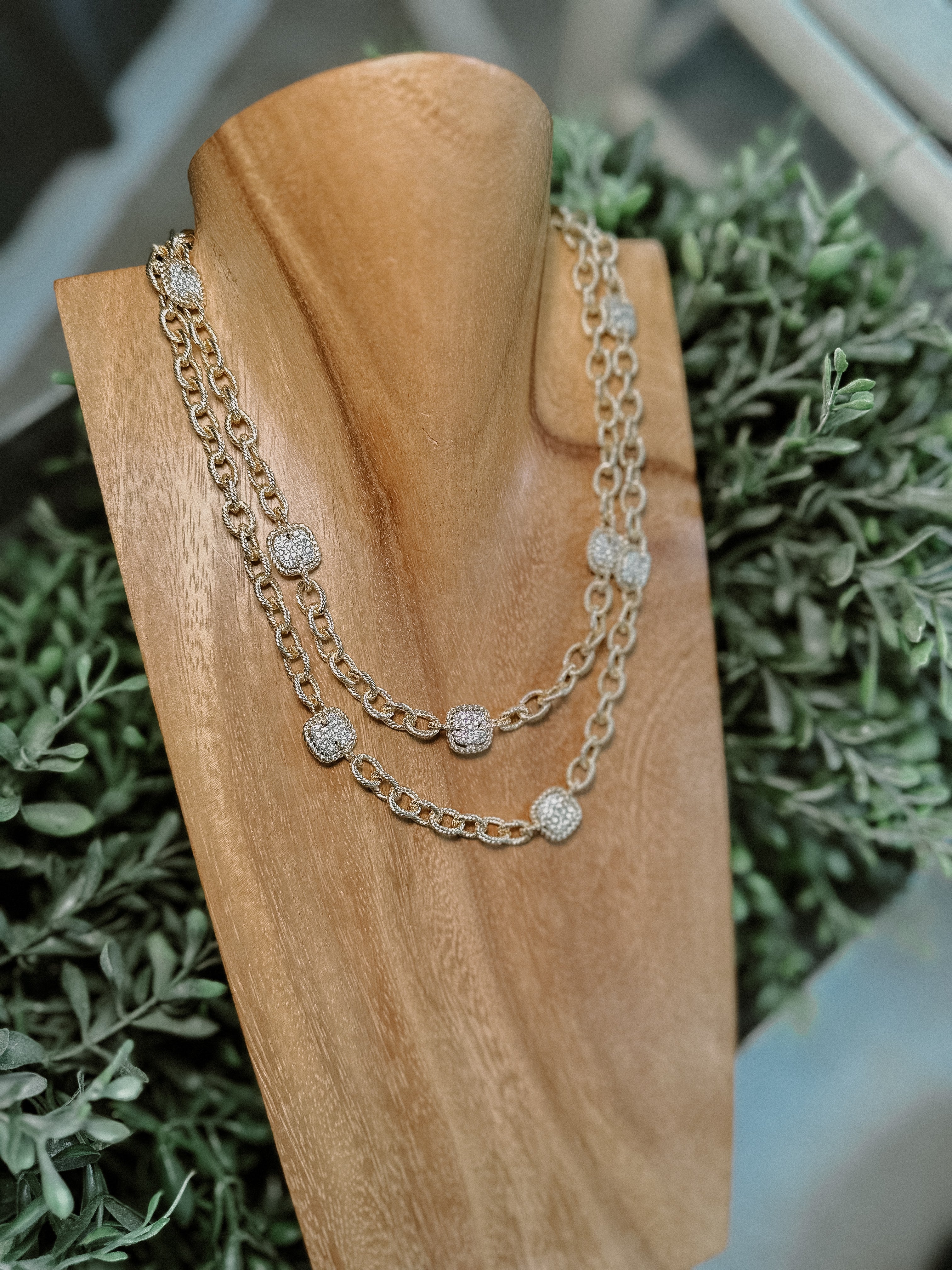 Get the ultimate in effortless style and sophistication with this Gold Double Link and Small Square Pave Stone Necklace. The stunning pave design and etched chain link pieces catch the light and add an elegant touch to any outfit. Wear it layered to make a bold statement or keep it simple for a touch of class - the possibilities are endless.