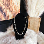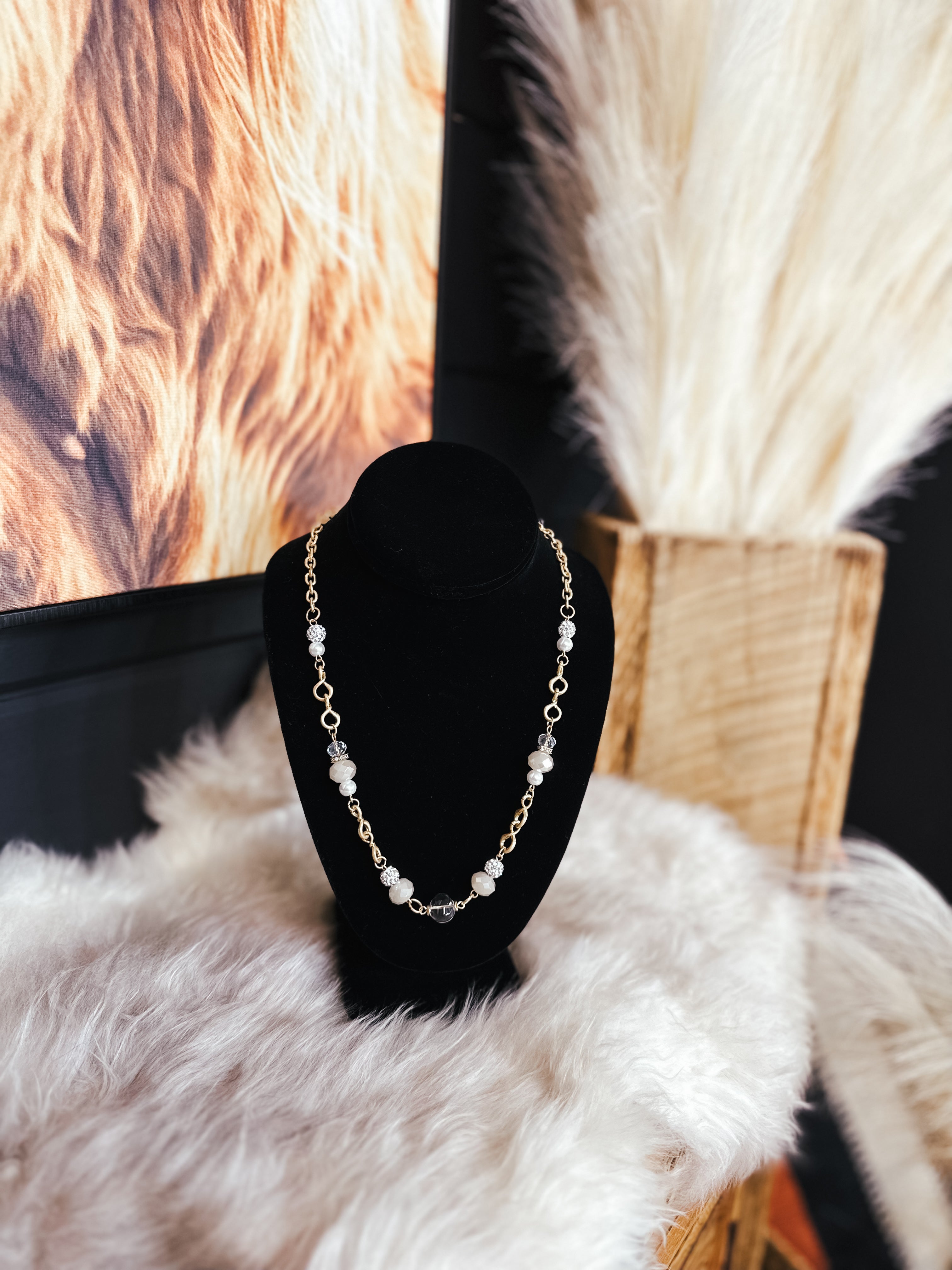 Elevate your look with this faux gold chain necklace, sparkling with iridescent ivory beads, delicate faux pearls, and shimmering pave crystal accents. Perfect for layering or wearing solo, it adds a playful yet elegant touch to any outfit. Whether you're dressing up for a night out or adding charm to your everyday style, this necklace brings the perfect pop of shine and sophistication. A chic, versatile accessory that effortlessly enhances your jewelry collection with a hint of glam and a dash of fun.