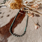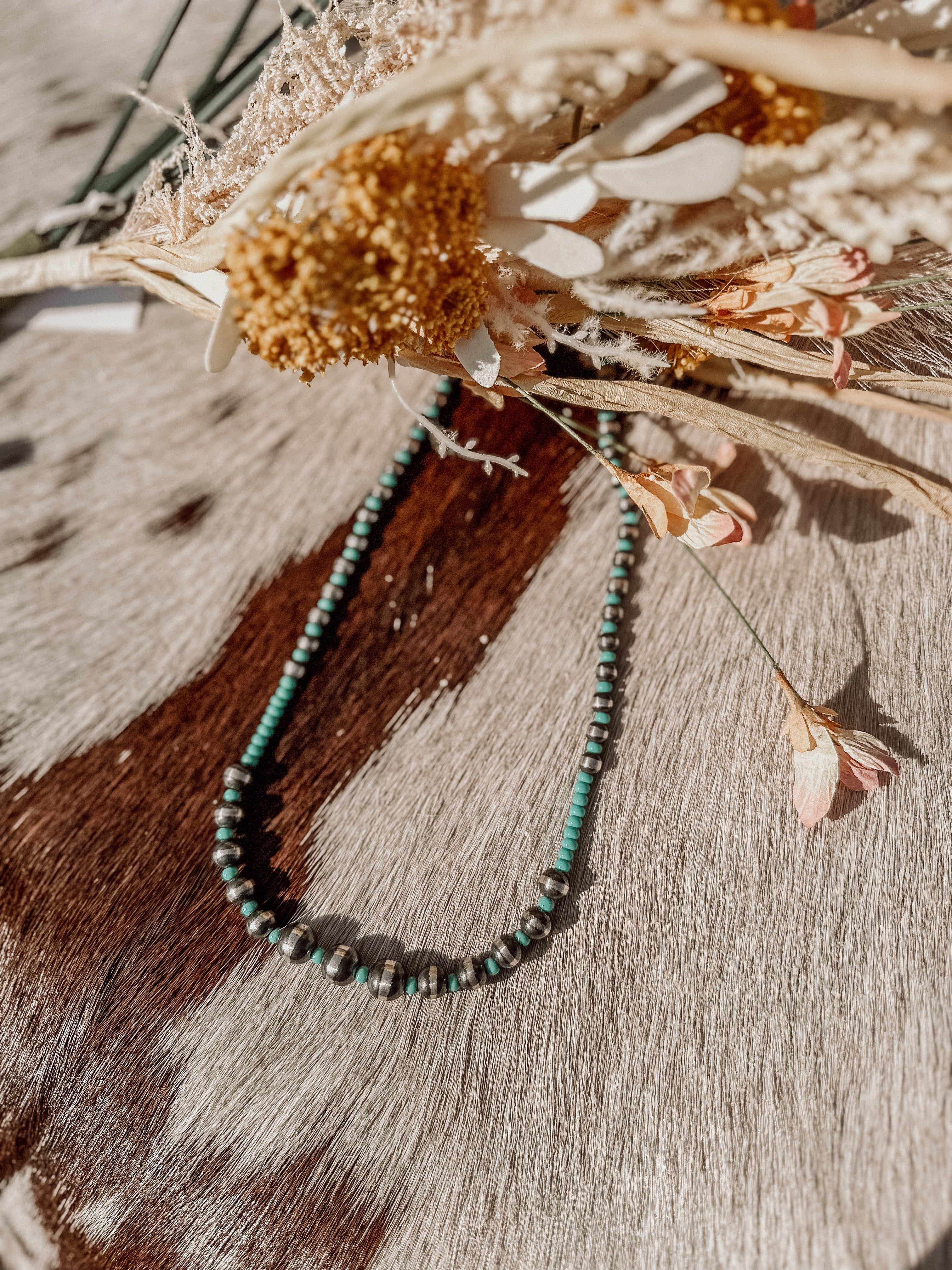 Rhoda Katz brings us another showstopper with this Large Turquoise + Navajo Pearl Necklace. The alternating pearls and turquoise beads create a stunning and eye catching piece that culminates in larger beads in the center. This may be the only Turquoise or Navajo Pearl Necklace you ever need, but it also looks great layered with the sterling silver pieces in your collection!