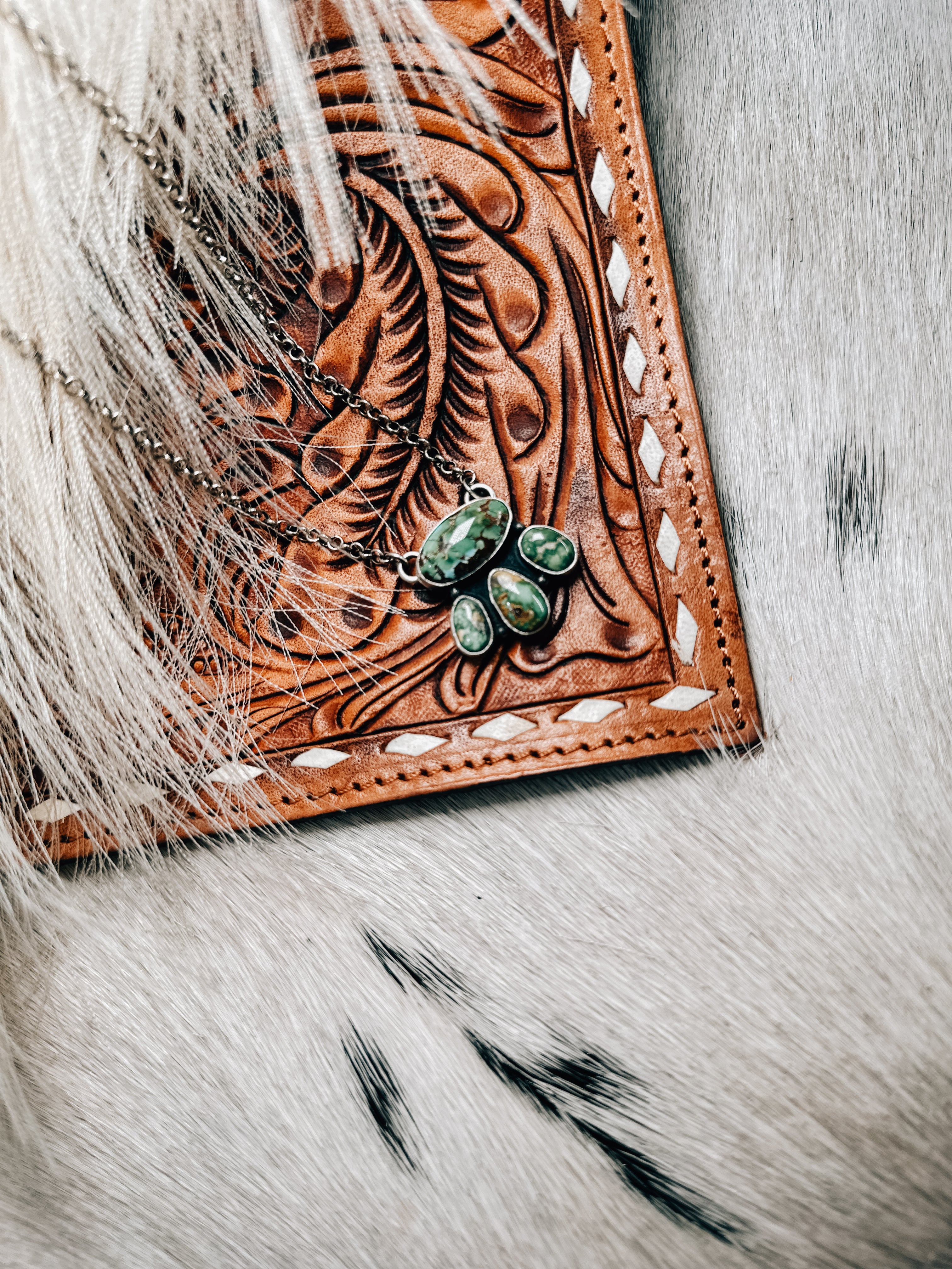 Indulge in the luxurious beauty of this Malachite Triple Teardrop Necklace, featuring a striking oval stone atop three dangling teardrops that resemble a paw. The adjustable cufflink chain allows for a customized fit, making it a perfect match for your Navajo pearls for a truly stunning ensemble.