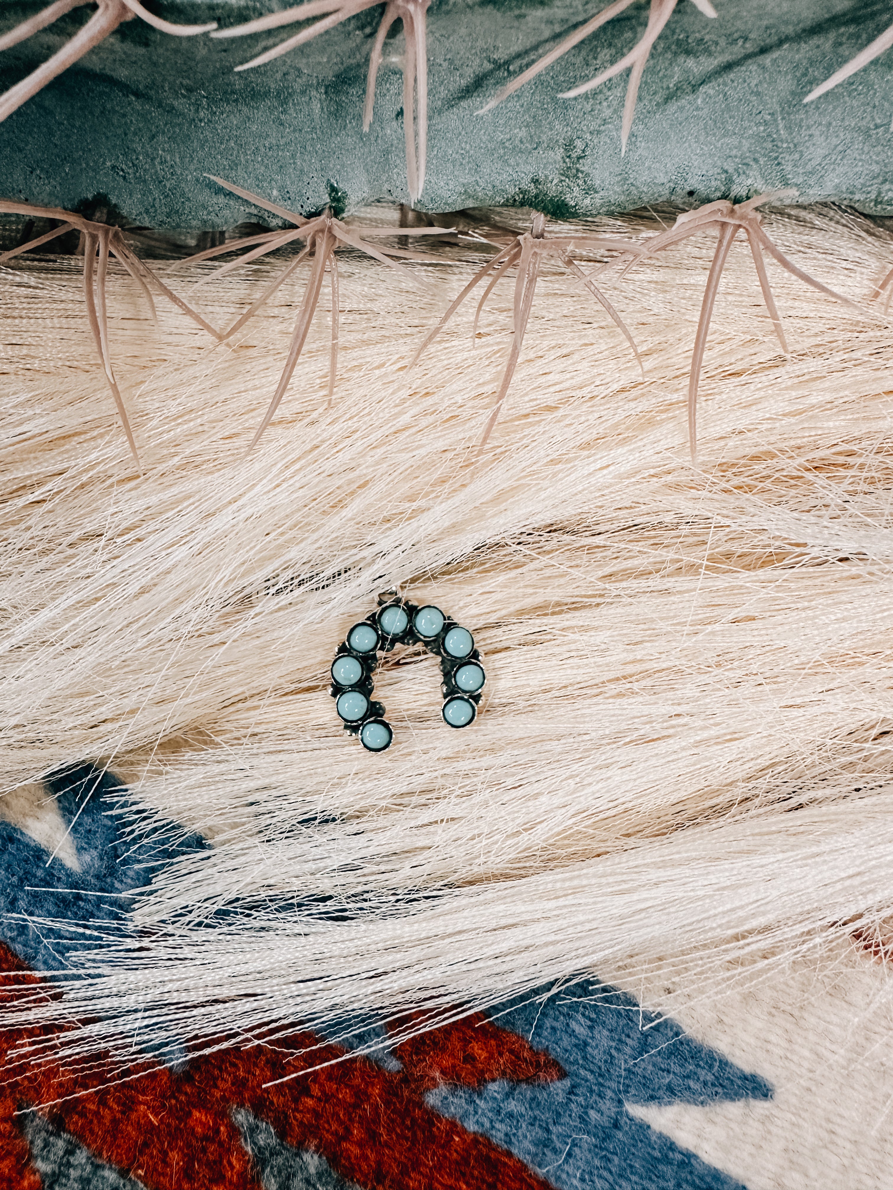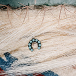 This pendant features 9 genuine Kingman Turquoise stones arranged in a beautiful blossom pattern, all set in oxidized .925 Sterling Silver. Pair it with a delicate chain for a timeless look or a Navajo Pearl chain for a more Western vibe. Bring out the true beauty of this accessory with your unique sense of style.