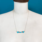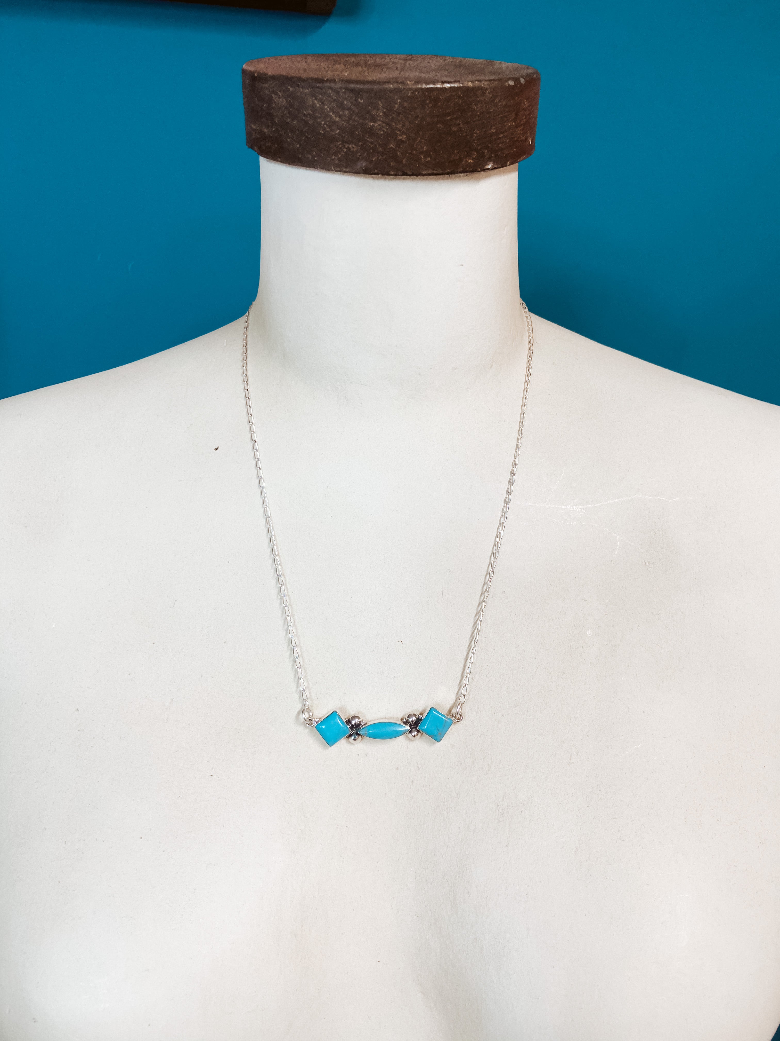 This magnificent necklace features two diamond-shaped and one oval-shaped Authentic Kingman Turquoise Stones, connected with .925 Sterling Silver balls and beautifully hung on a delicate chain. Each piece is carefully handcrafted, making it truly one-of-a-kind. Experience the unique and stunning beauty of this Misshaped TQ Necklace.