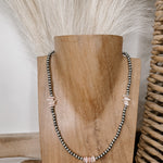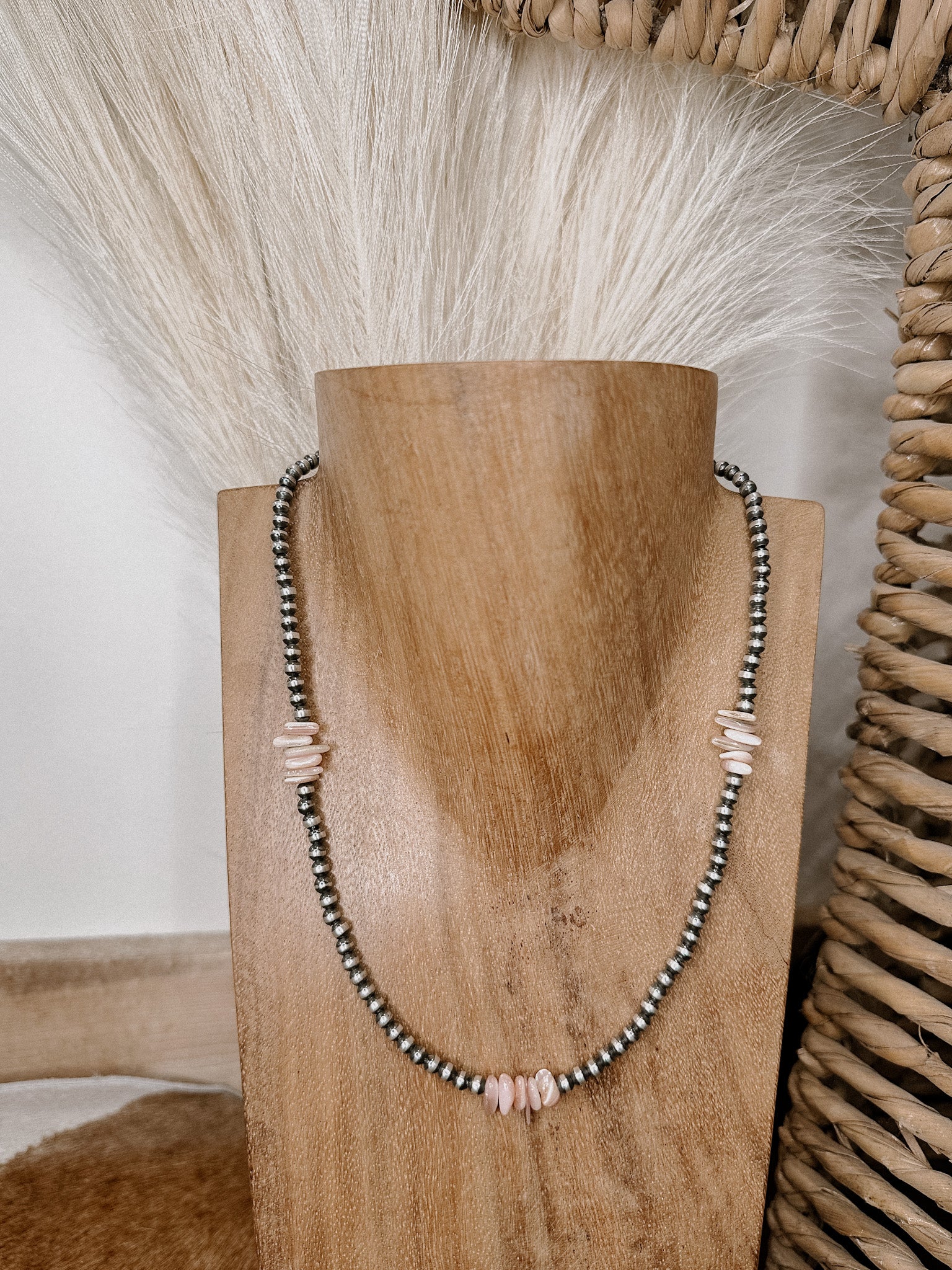 Transform your look with this exquisite necklace adorned with delicate, handmade Navajo Pearl beads and three eye-catching clusters of real Pink Conch chips on a 15" chain with a 3" extender. This beauty is a gorgeous statement piece, but also layers perfectly with our other Navajo Pearl offerings!
