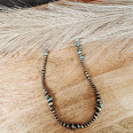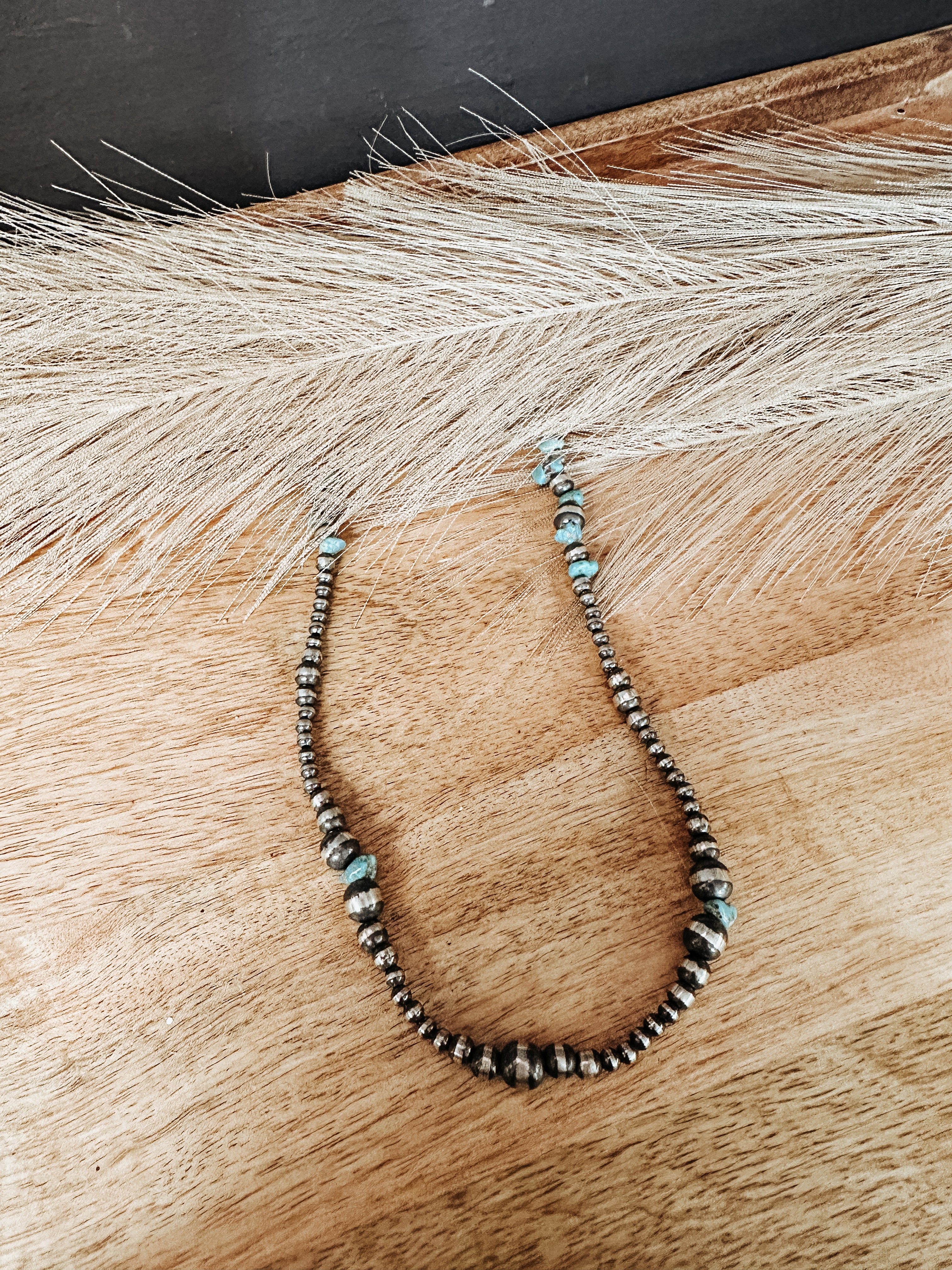 This stunning necklace from Rhoda Katz features an ombre design of authentic sterling silver Navajo pearls combined with rough cut genuine Kingman Turquoise stones. The perfect combination of pearls and turquoise at an ideal length. Add this to your collection and layer it with your favorite pieces for a classic look.