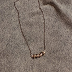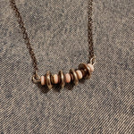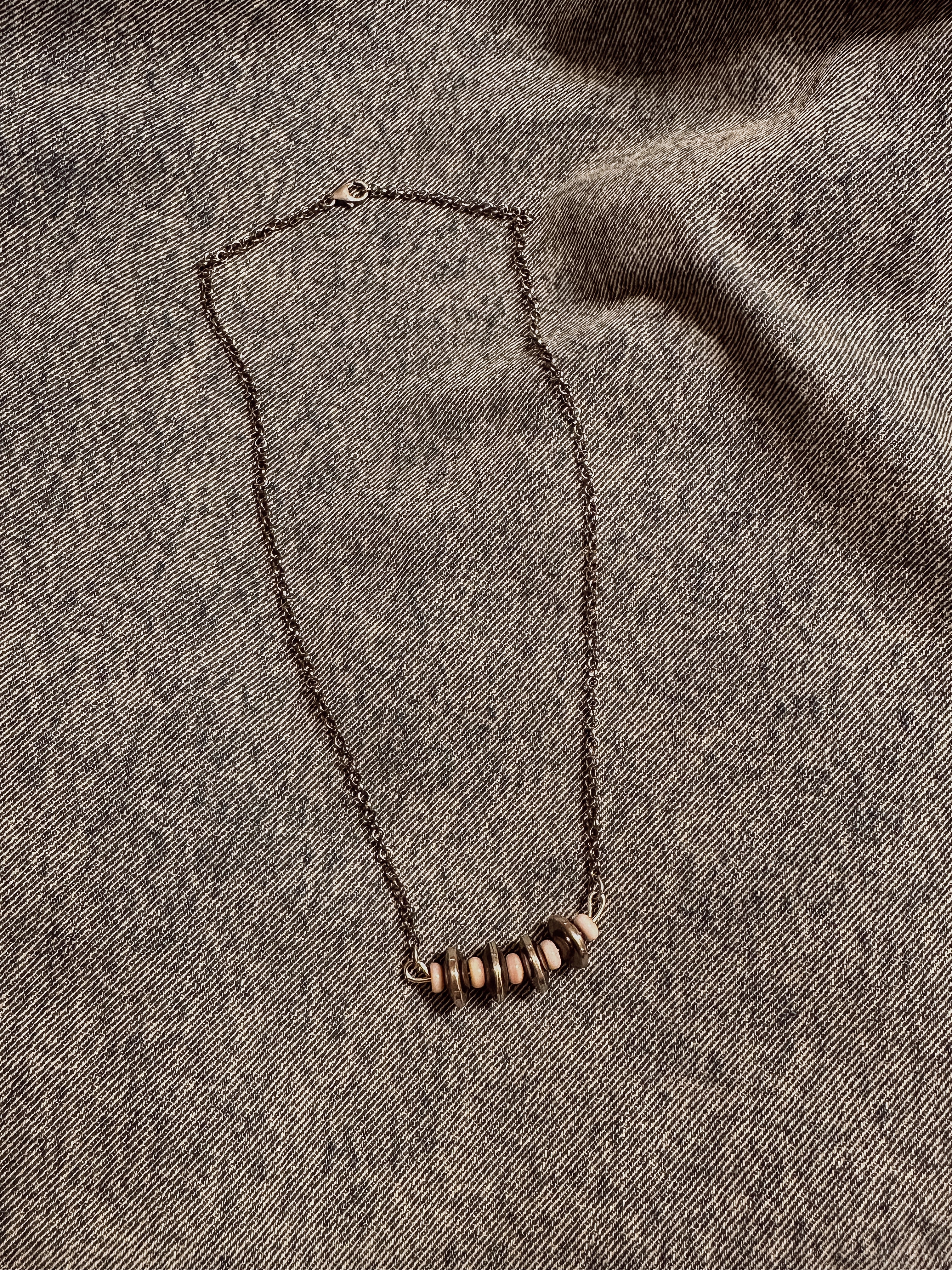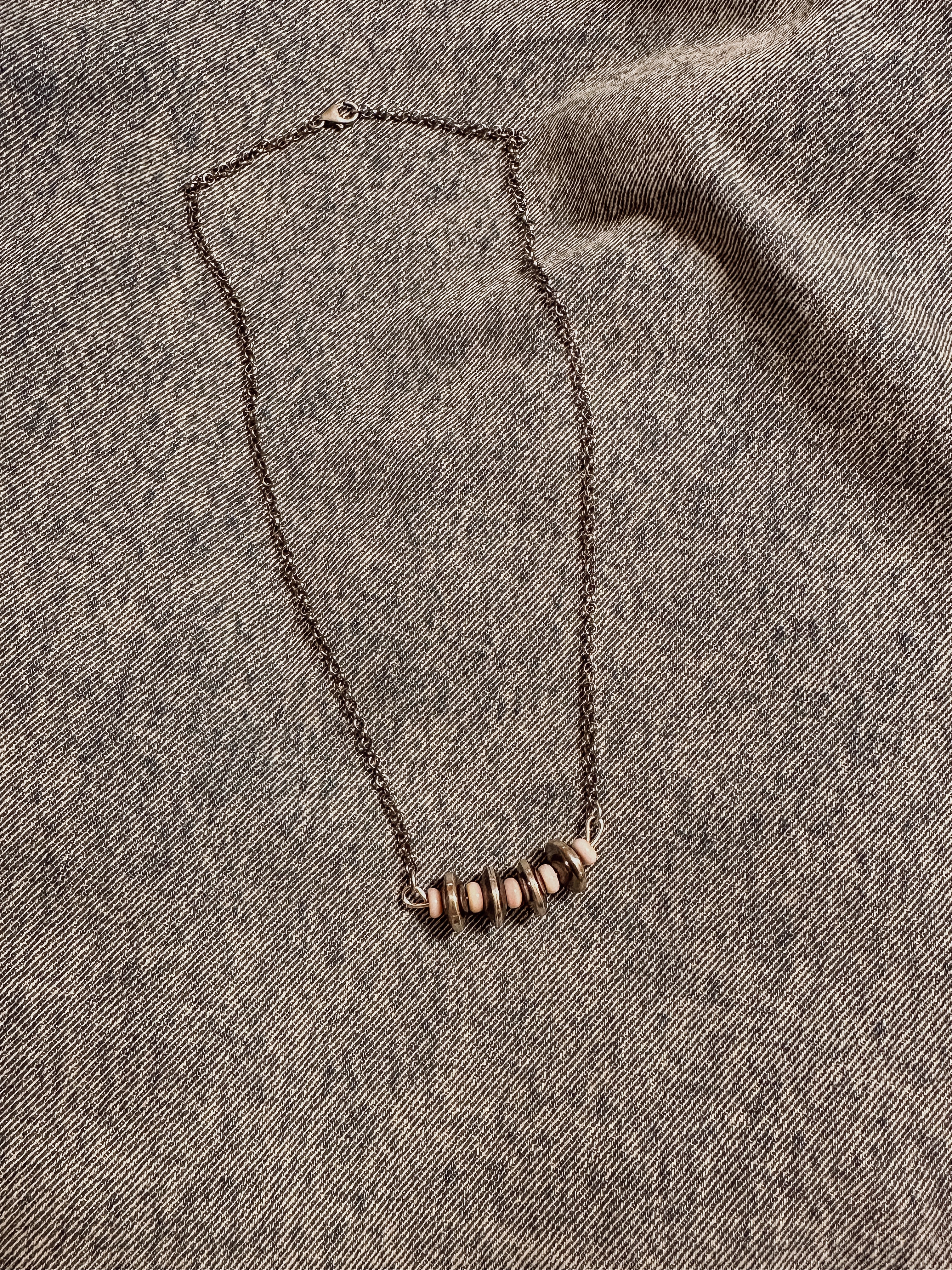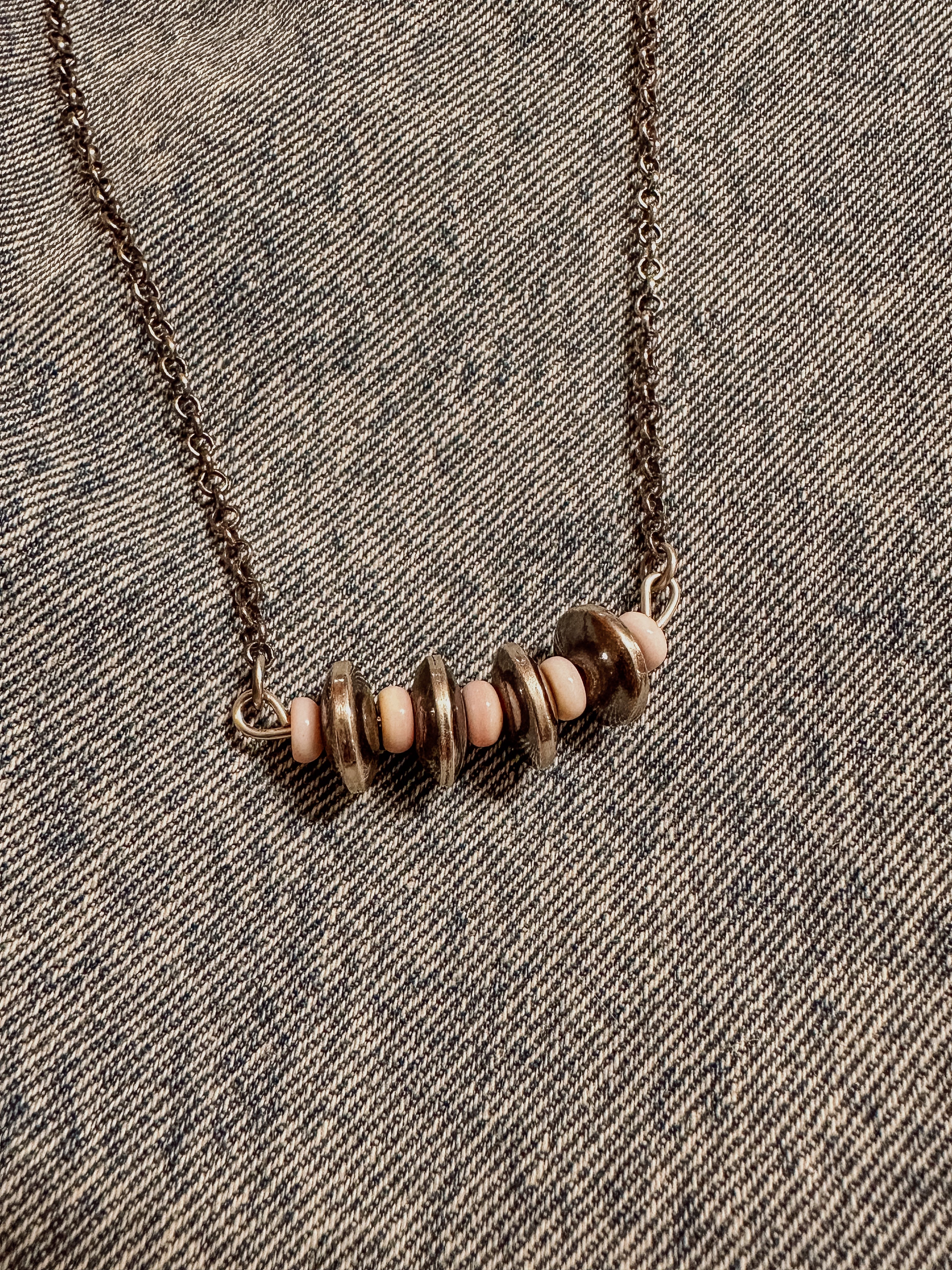 This necklace features authentic pink conch and cylindrical gemstones, alternating in a unique and stackable design. Crafted with expert precision, this piece is perfect for adding a touch of vibrant color and elegance to any outfit.