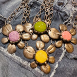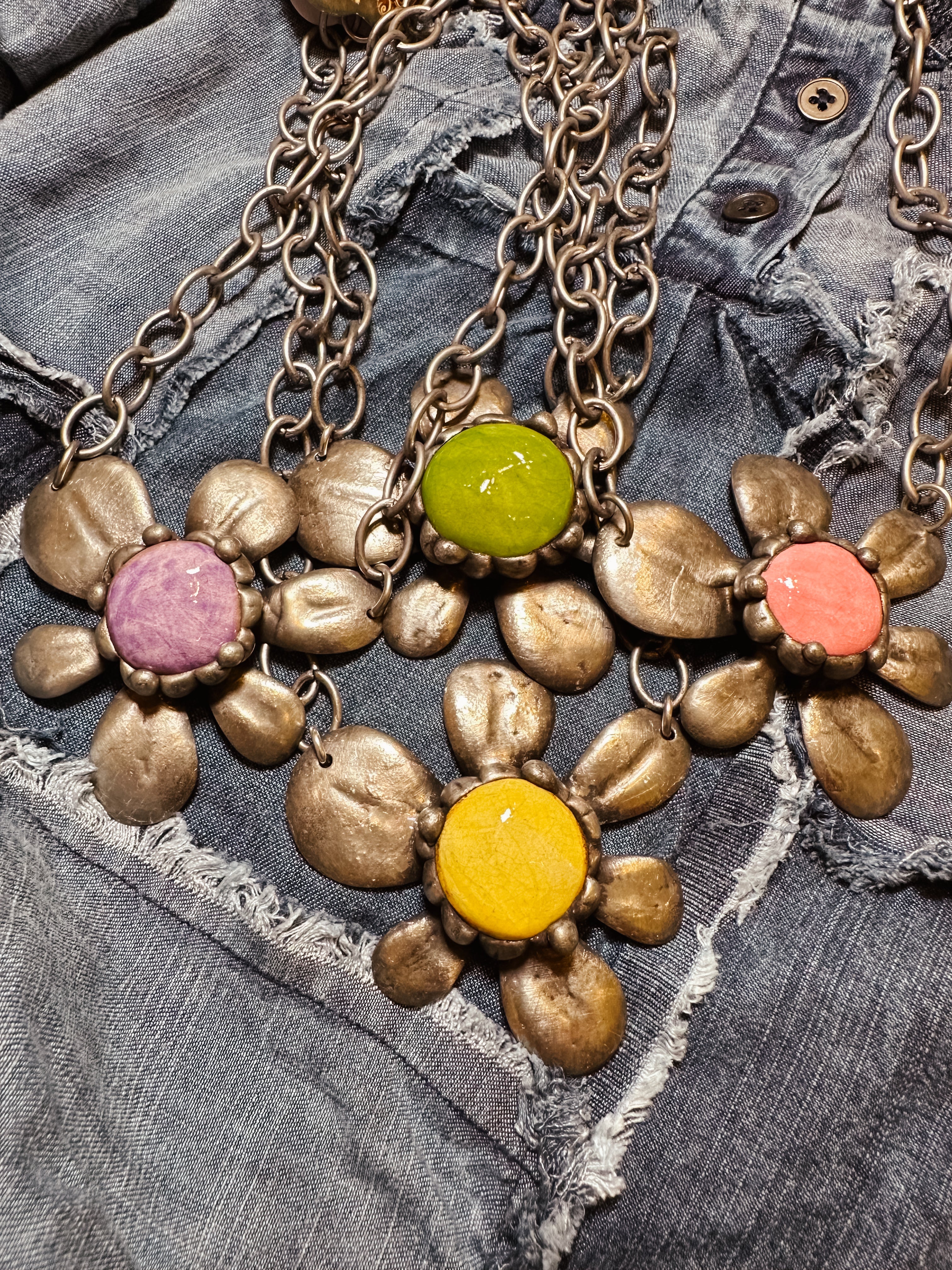 Bring a splash of retro flair to your style with this playful faux silver chain link necklace. It features a muted finish that highlights a large, eye-catching metal flower at its center. Choose from a variety of bold and bright colors—banana, pink, purple, lime, white, or turquoise—to match your mood and outfit. This statement piece offers a mix of edgy charm and vibrant personality, perfect for adding a fun twist to any look, whether you're dressing up for a night out or brightening your everyday ensemble.