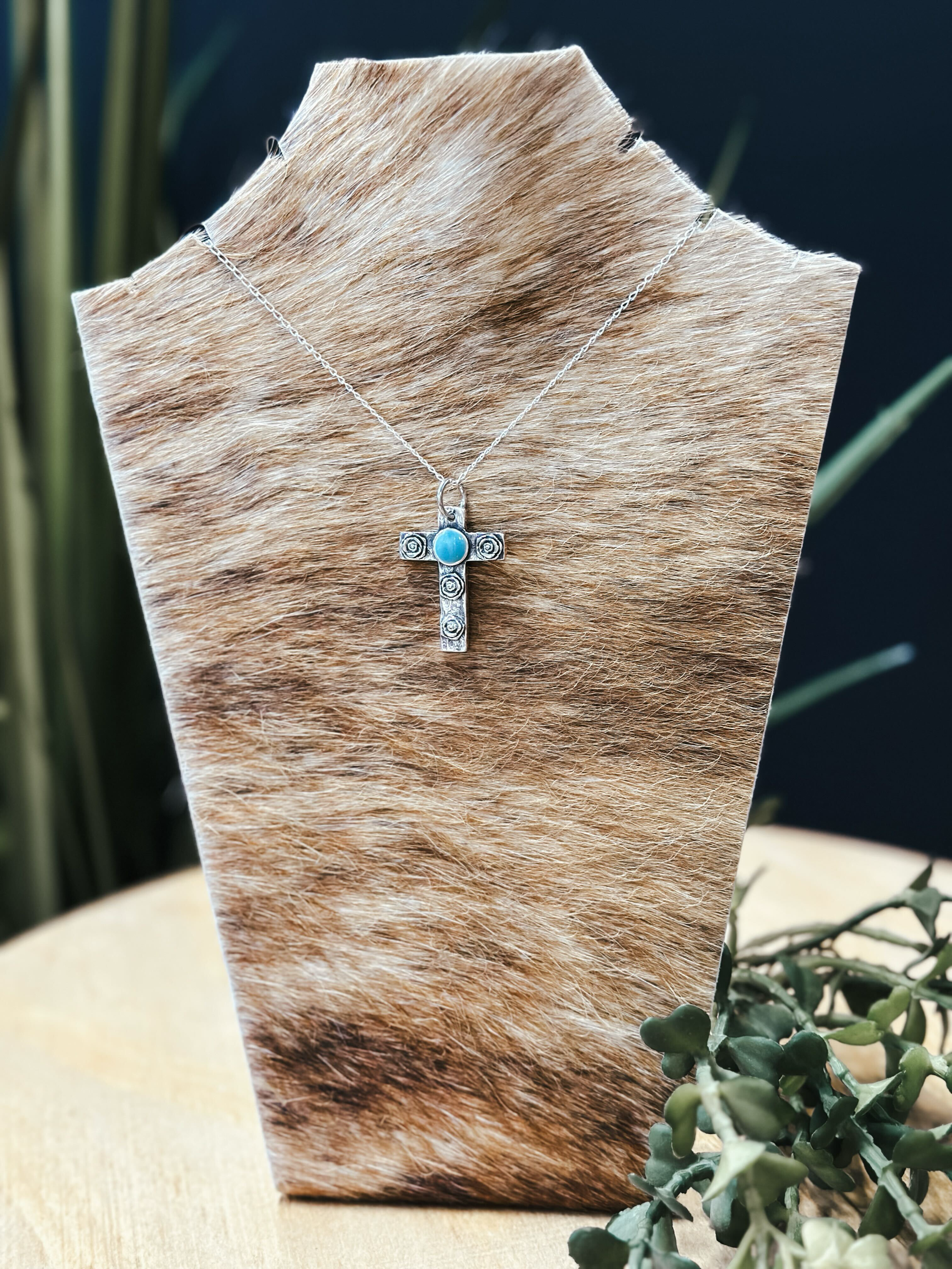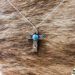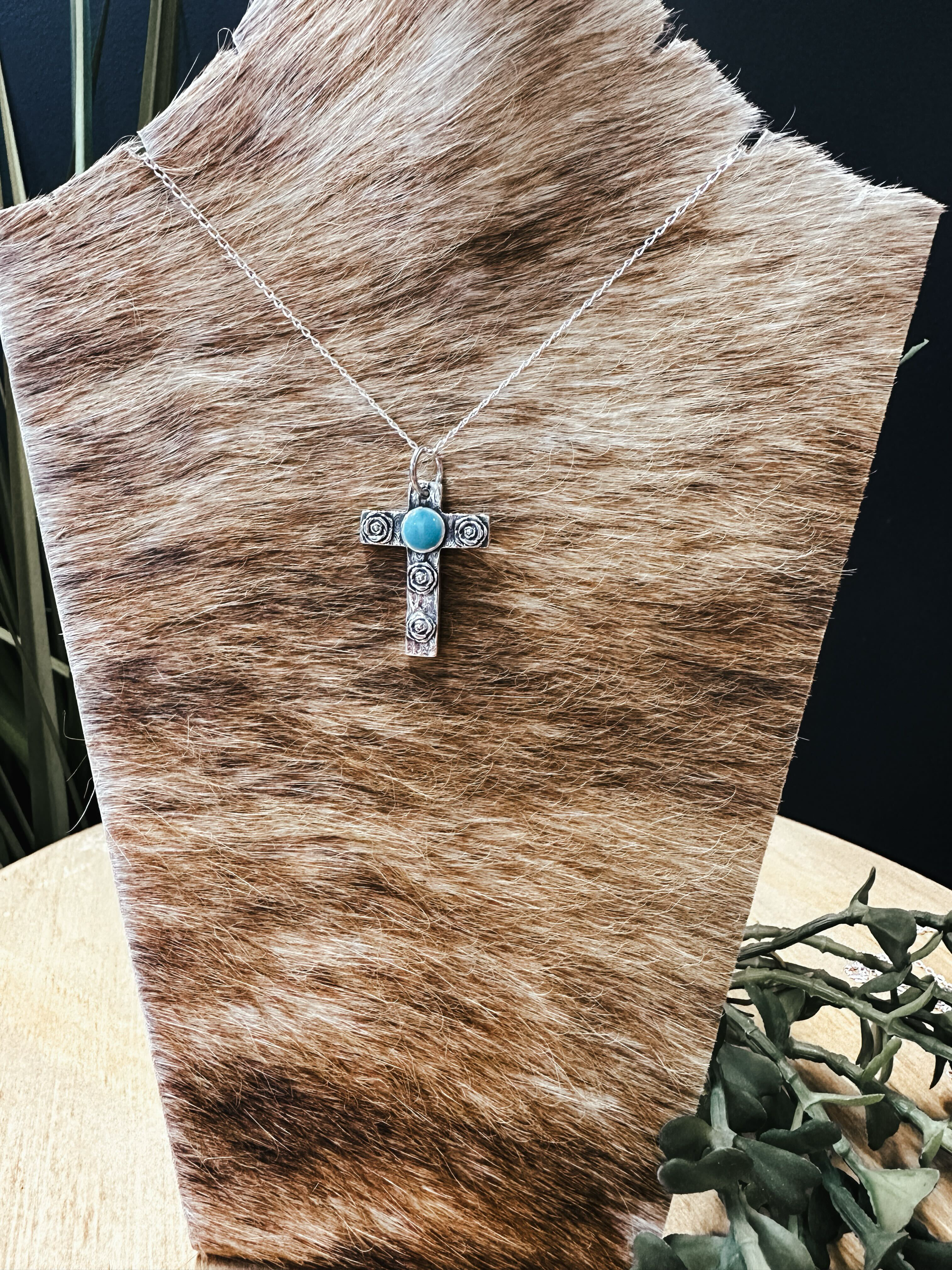 Indulge in the exquisite craftsmanship of Rhoda Katz with this one-of-a-kind cross necklace. It boasts an authentic Kingman Turquoise stone at the center, beautifully accented by etched Sterling Silver roses, and hangs delicately from a dainty chain. This stunning piece is sure to captivate and become a treasured addition to your collection.