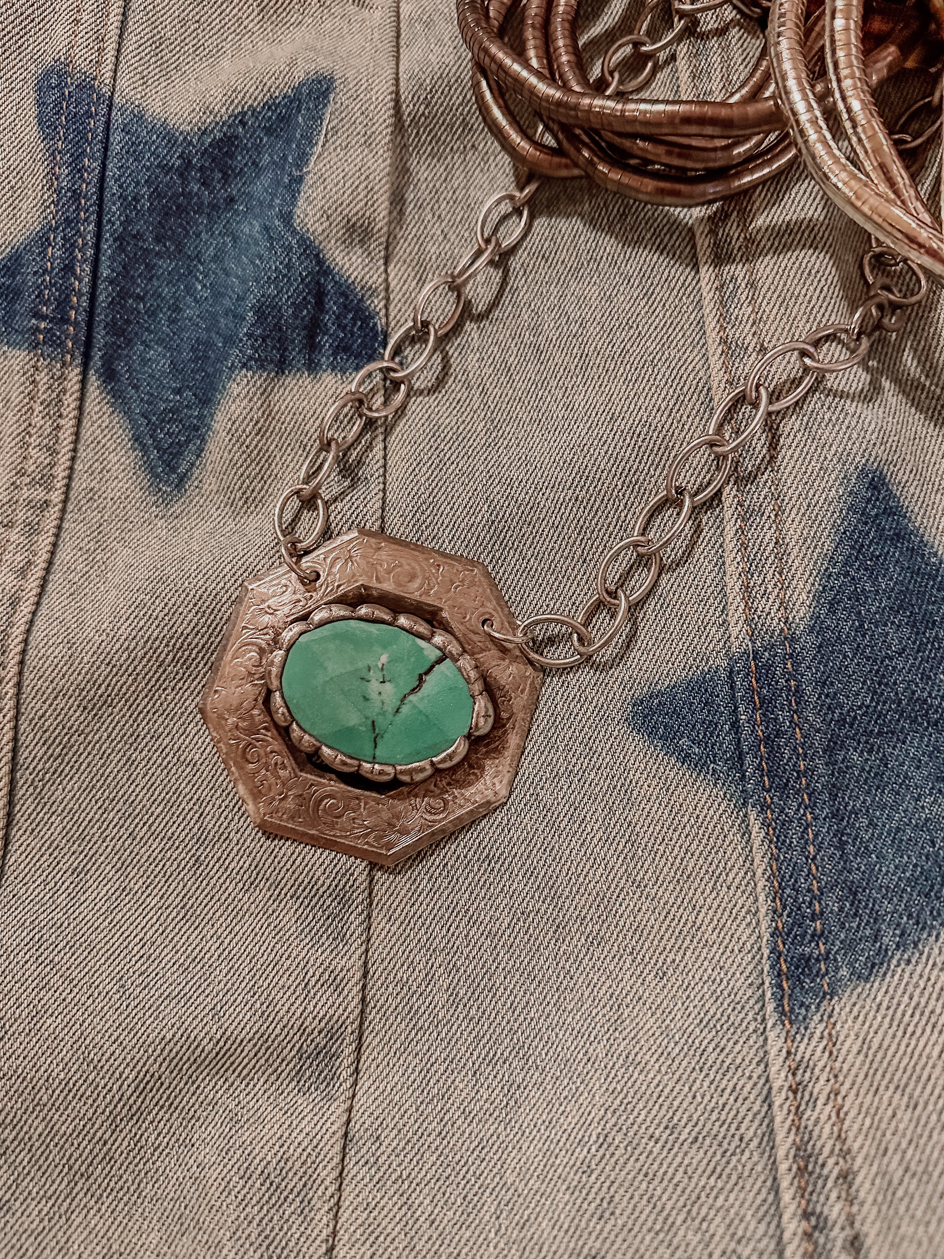 Elevate your style with the Show Ring Bling Slab Necklace, featuring a muted faux silver chain link that leads to a bold octagonal slab centerpiece. This striking piece is accented by a vibrant faux turquoise oval stone, adding a pop of color and western-inspired flair. Perfect for layering or wearing solo, it brings maximum drama and a playful edge to any outfit, making your look unforgettable wherever you go. Embrace the charm of rugged elegance with this unique necklace that’s ready to shine.