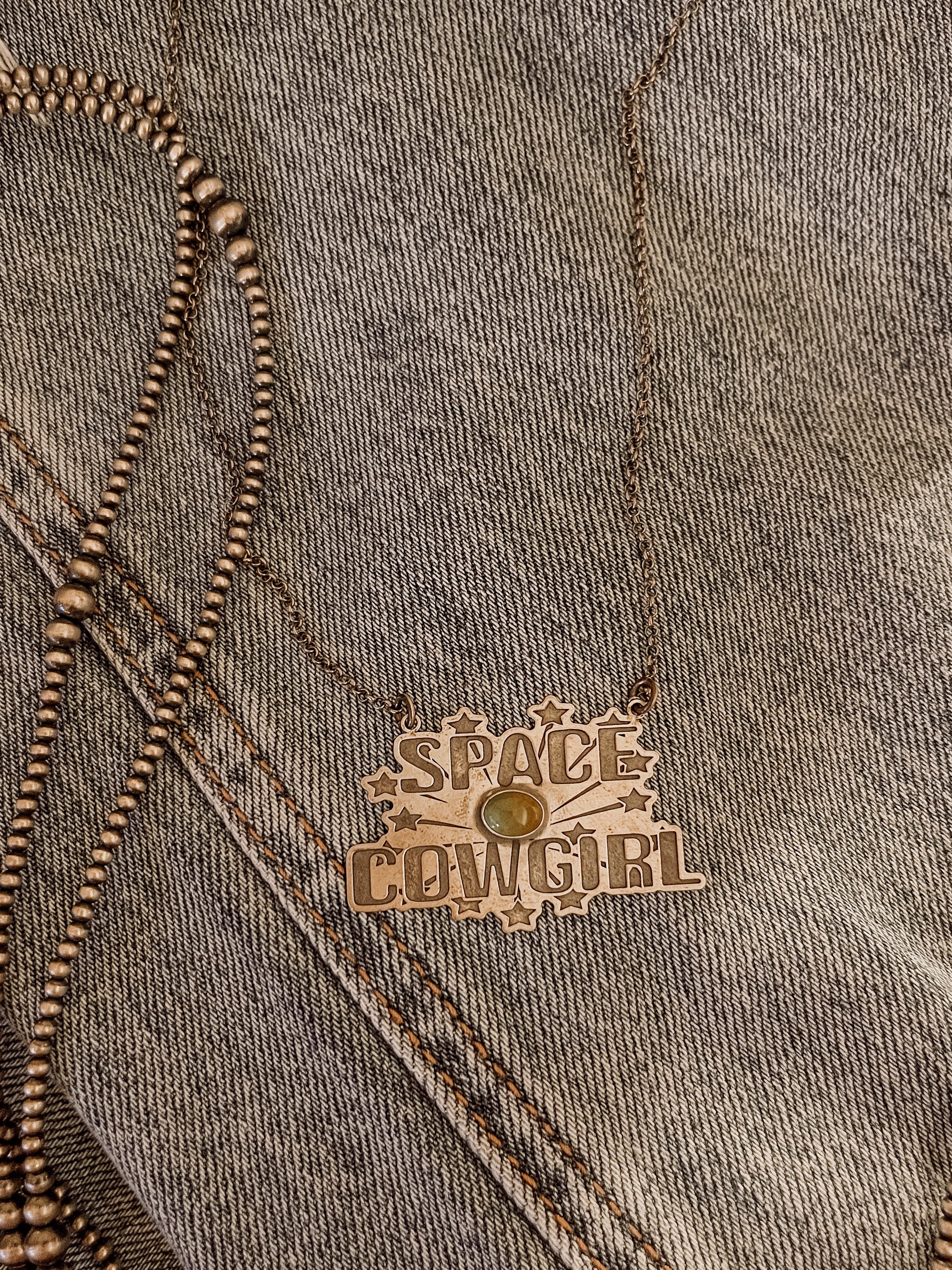 Get ready to channel retro vibes with this stunning piece of jewelry. Made of genuine Sterling Silver and featuring an engraved "Space Cowgirl" design, it also boasts a beautiful oval Kingman Turquoise stone on an oxidized chain. Whether you wear it solo for a funky and artistic look or layer it with Navajo Pearls and other Turquoise pieces for a complete vibe, this necklace is sure to make a statement. Plus, it's fully adjustable so you can wear it flat for a unique and eye-catching look. Don't miss out on adding this one-of-a-kind piece to your collection!