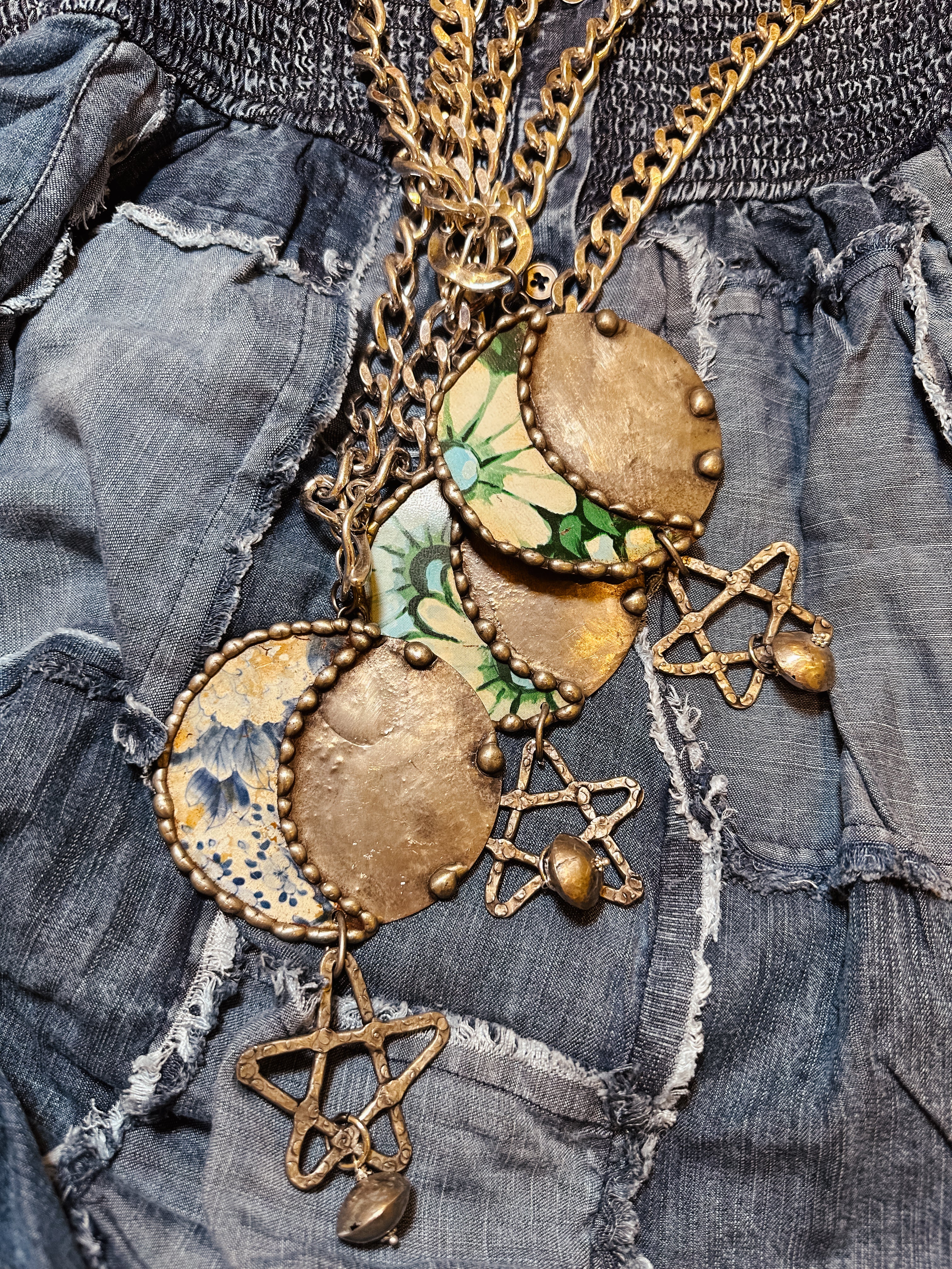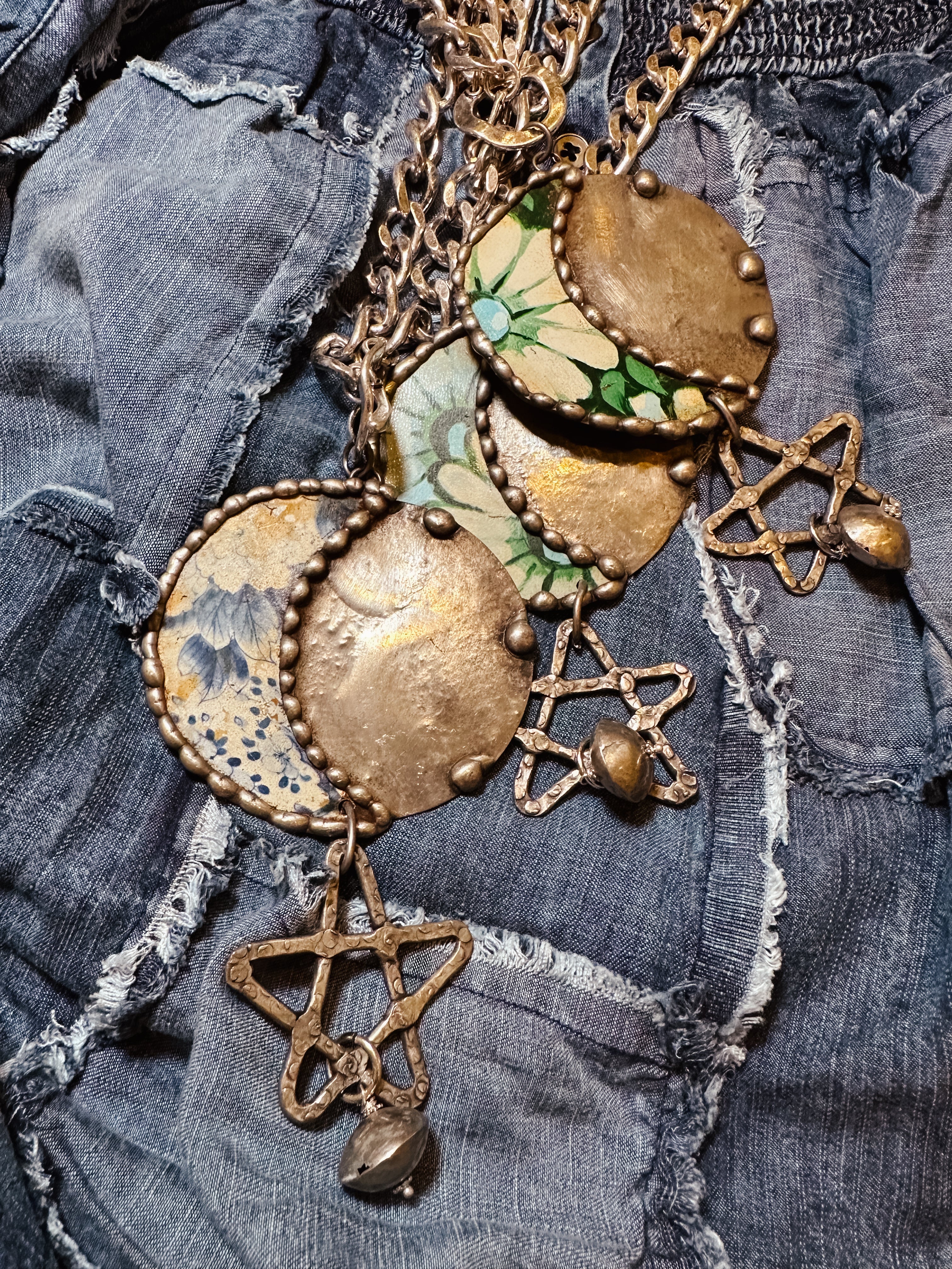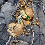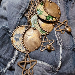 This charming necklace features a muted antique brass chain that leads to an oversized half-moon charm decorated with retro floral hues and patterns. Adding a whimsical touch, a delicate star and a tiny bell dangle beneath, creating subtle movement and sound. Bold and chunky, this unique piece is designed to catch eyes and spark conversations, making it a perfect statement accessory for anyone who loves playful, vintage-inspired style with a touch of celestial magic.
