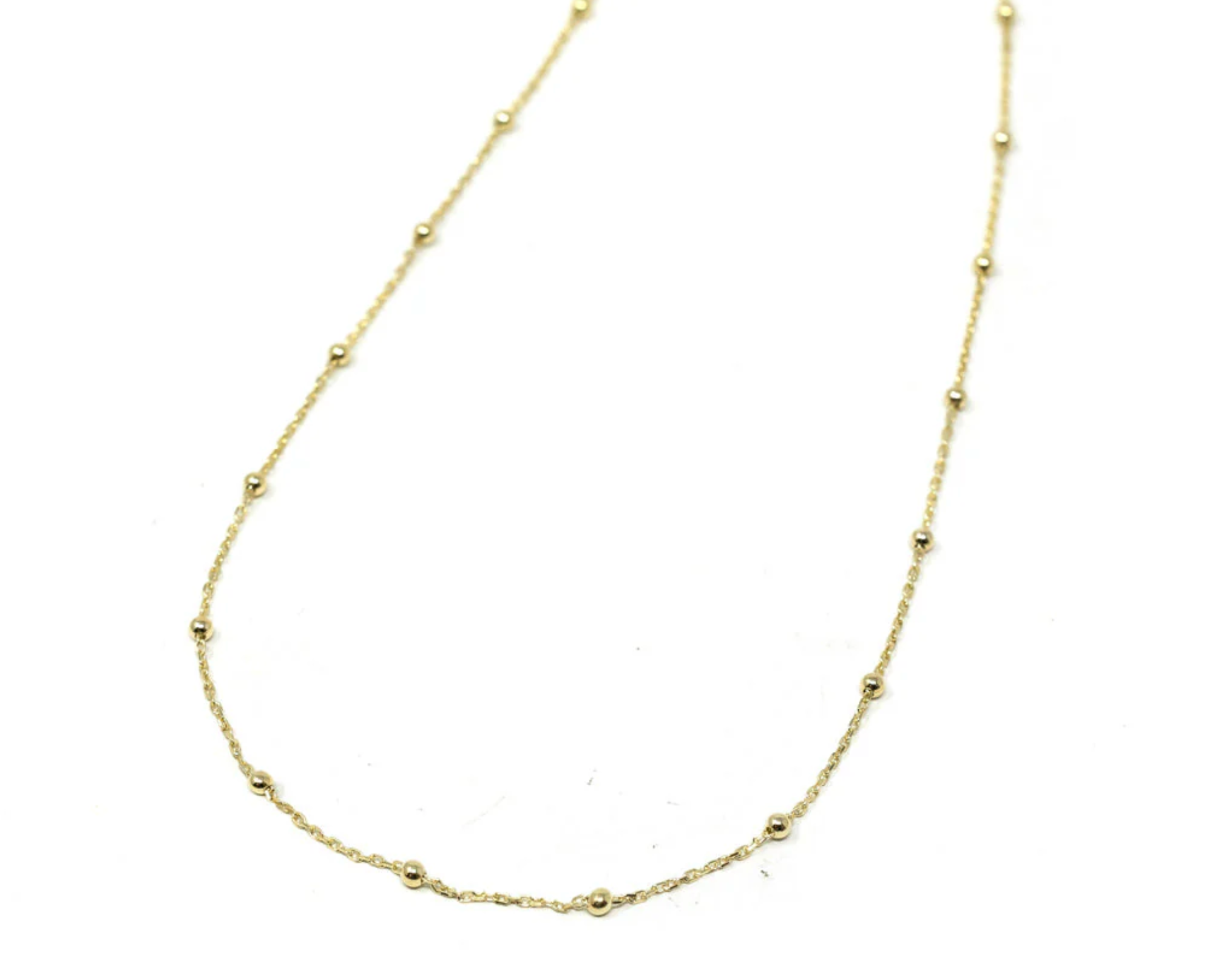 The TSK Baby Ball Chain is a new, unique staple in your charm collection. This dainty chain makes the perfect daily wearer and layers beautifully. wear it alone to highlight the collar bone and punctuate any 'fit or add your favorite charms for a unique vibe. Available in gold or silver.