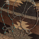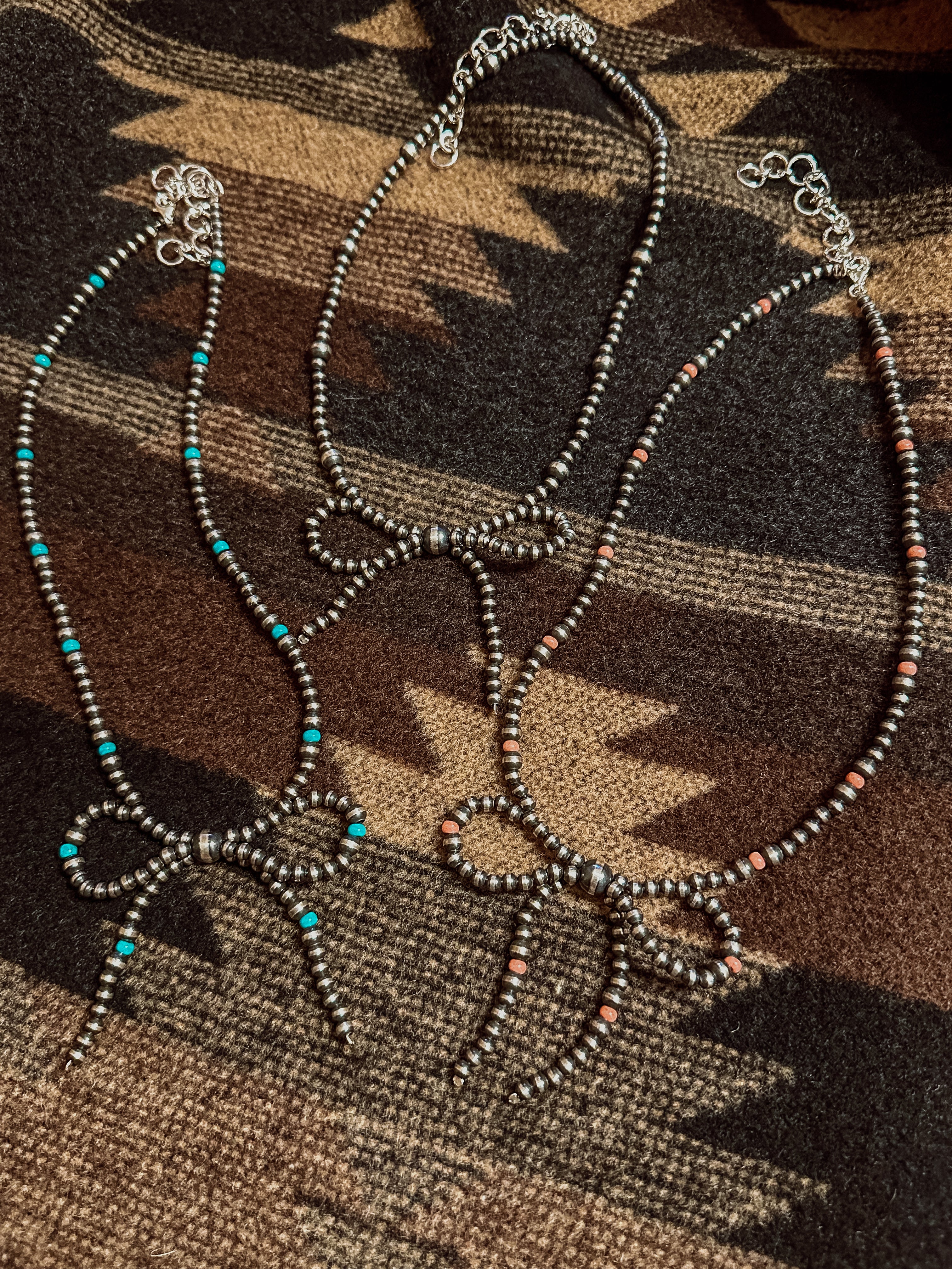 Indulge in luxury with our Bow Navajo Pearl Necklace. Handmade with chic sterling silver and Kingman Turquoise, this on-trend adjustable piece adds a touch of elegance to any outfit. Experience the sophistication and exclusivity of this exquisite piece, featuring a beautiful pearl. Elevate your style with our unique necklace.