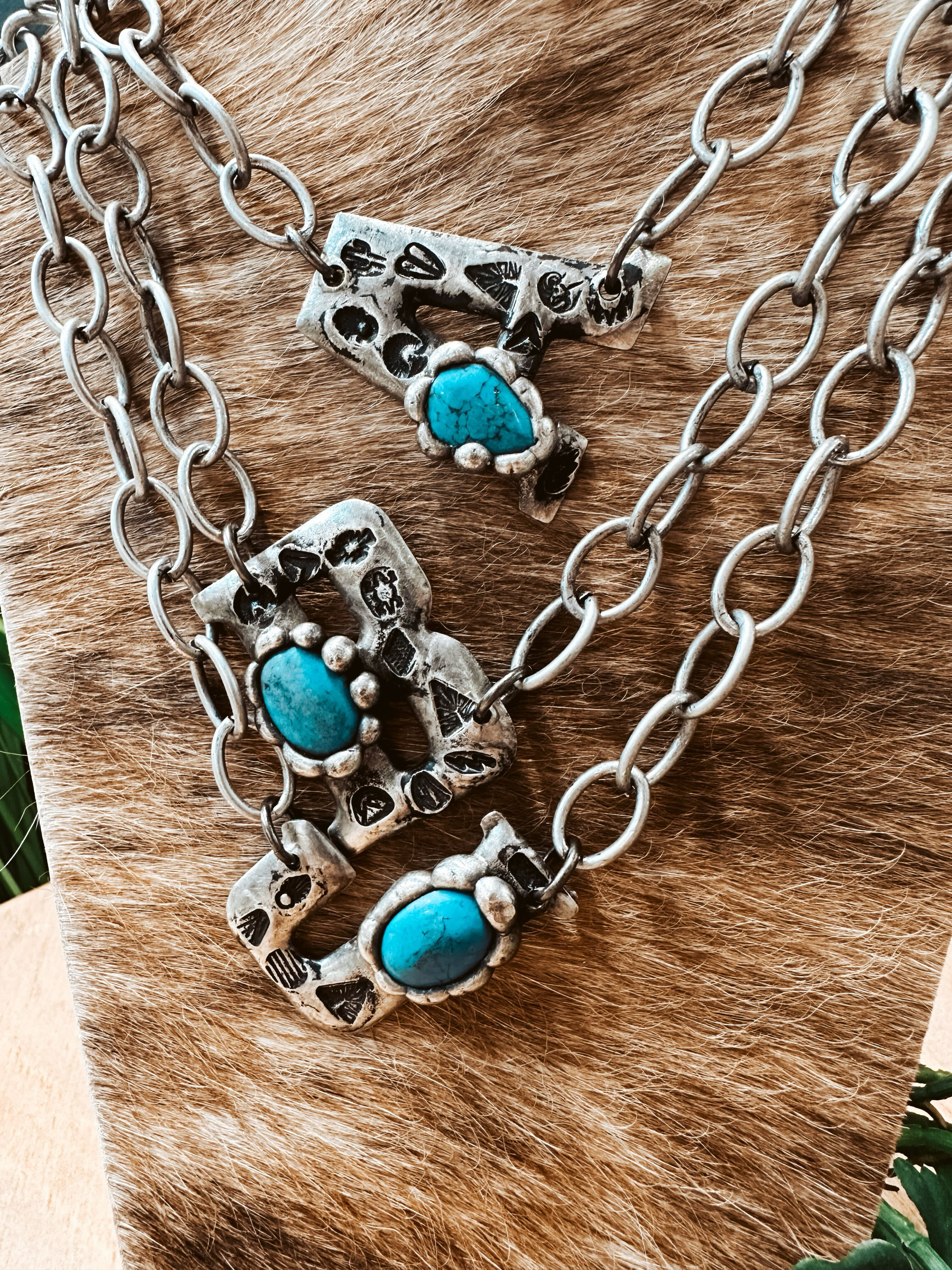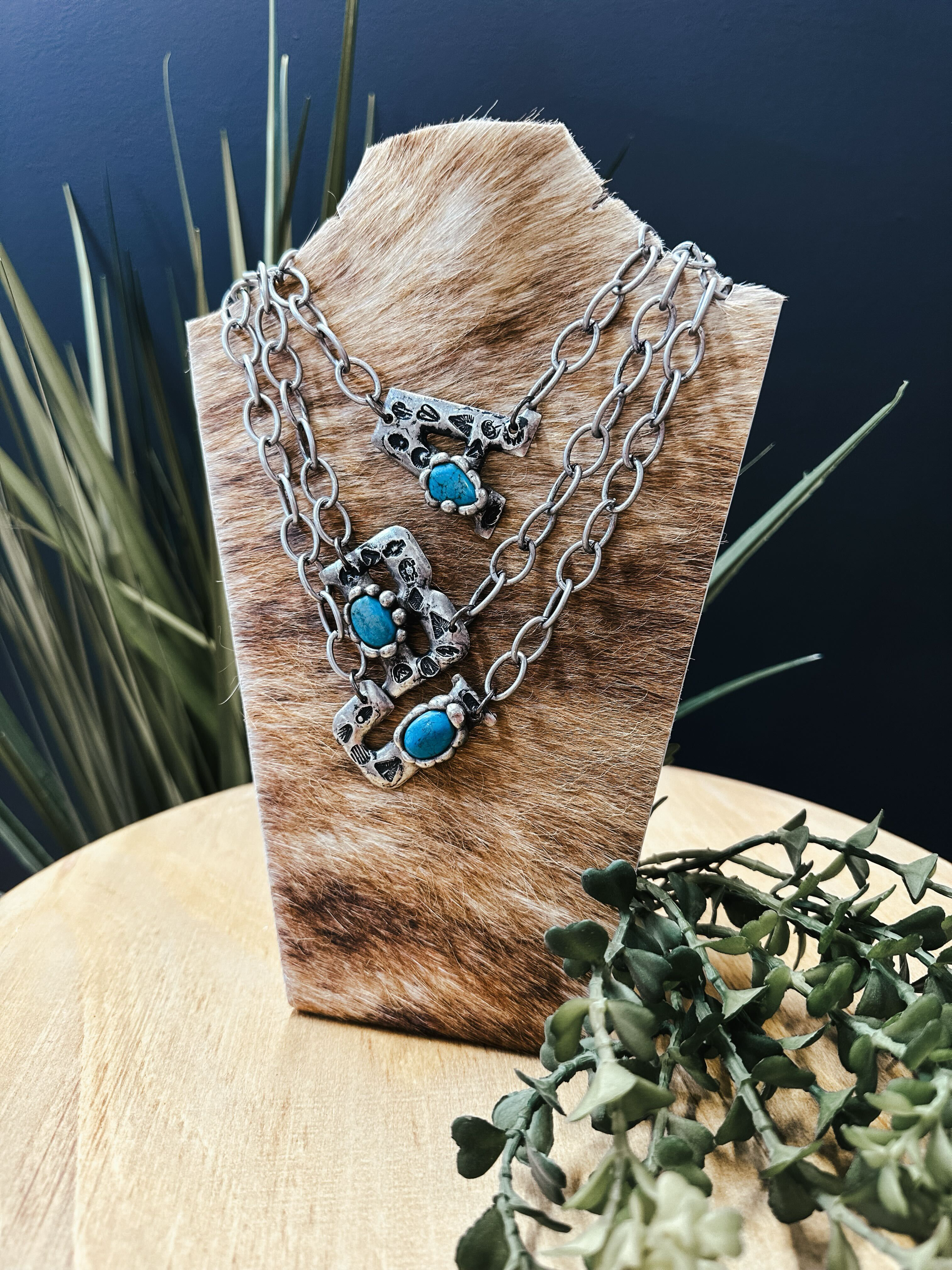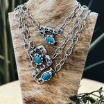 Add a touch of Western charm with this stamped turquoise necklace. Crafted with care, its vivid turquoise stone and intricate stamped details capture the spirit of the Wild West. At 18" long, it's the ideal length to complement any outfit, whether you're dressing up for a night out or going casual for a weekend adventure. Show off your unique style and passion for all things western with this playful and distinctive necklace that makes any occasion a little more special.