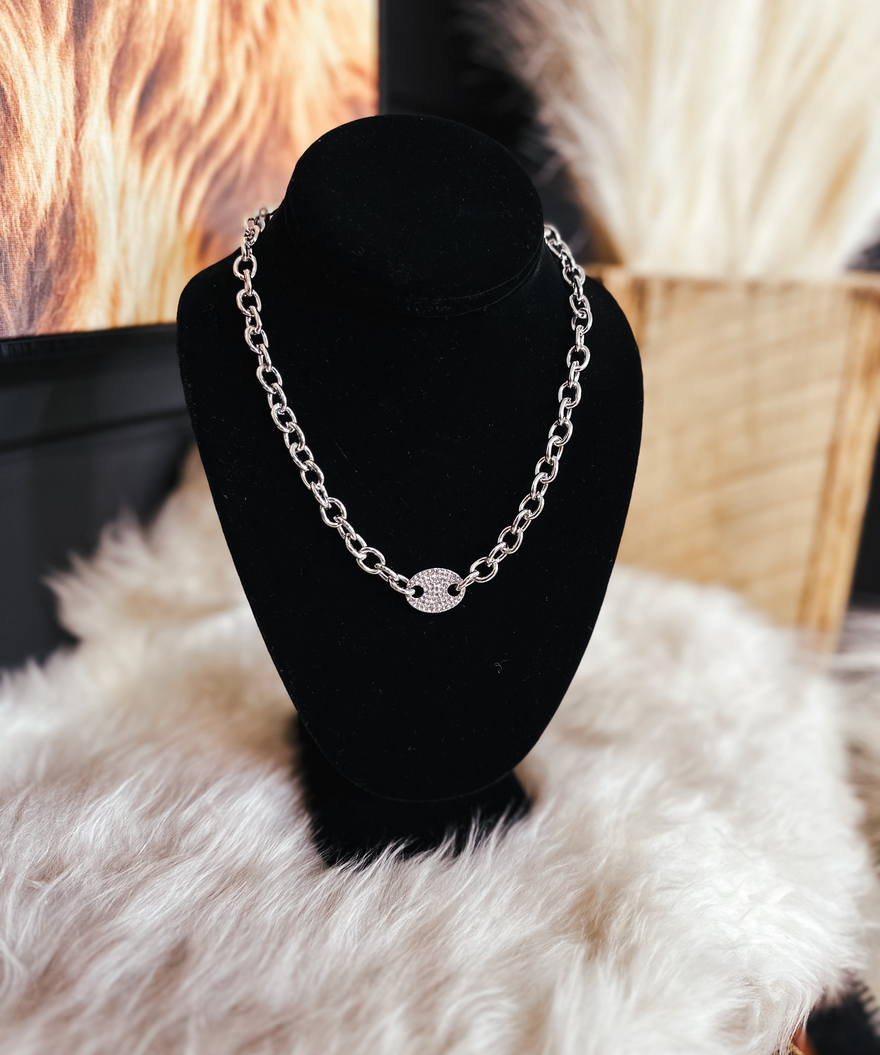 Silver Cuff Link Necklace with Pave Crystal