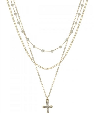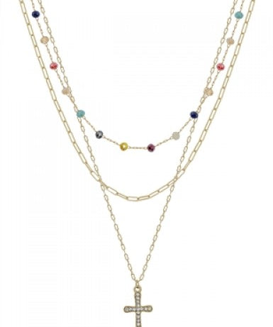 Crystal Bead + Gold Pave Cross Multi Layer Necklace