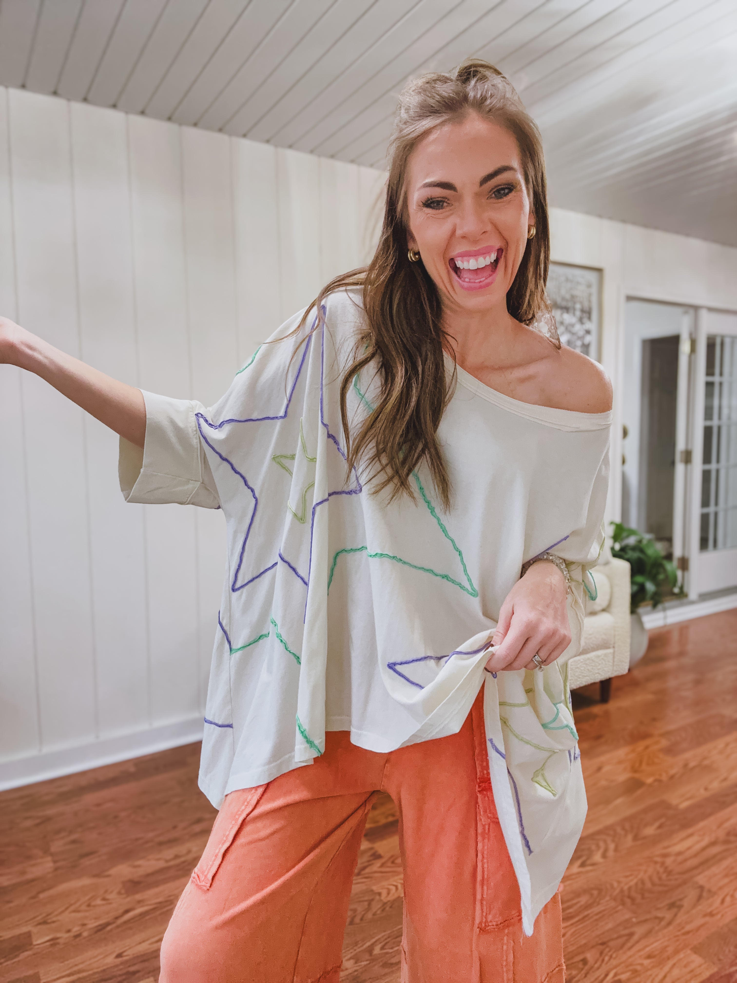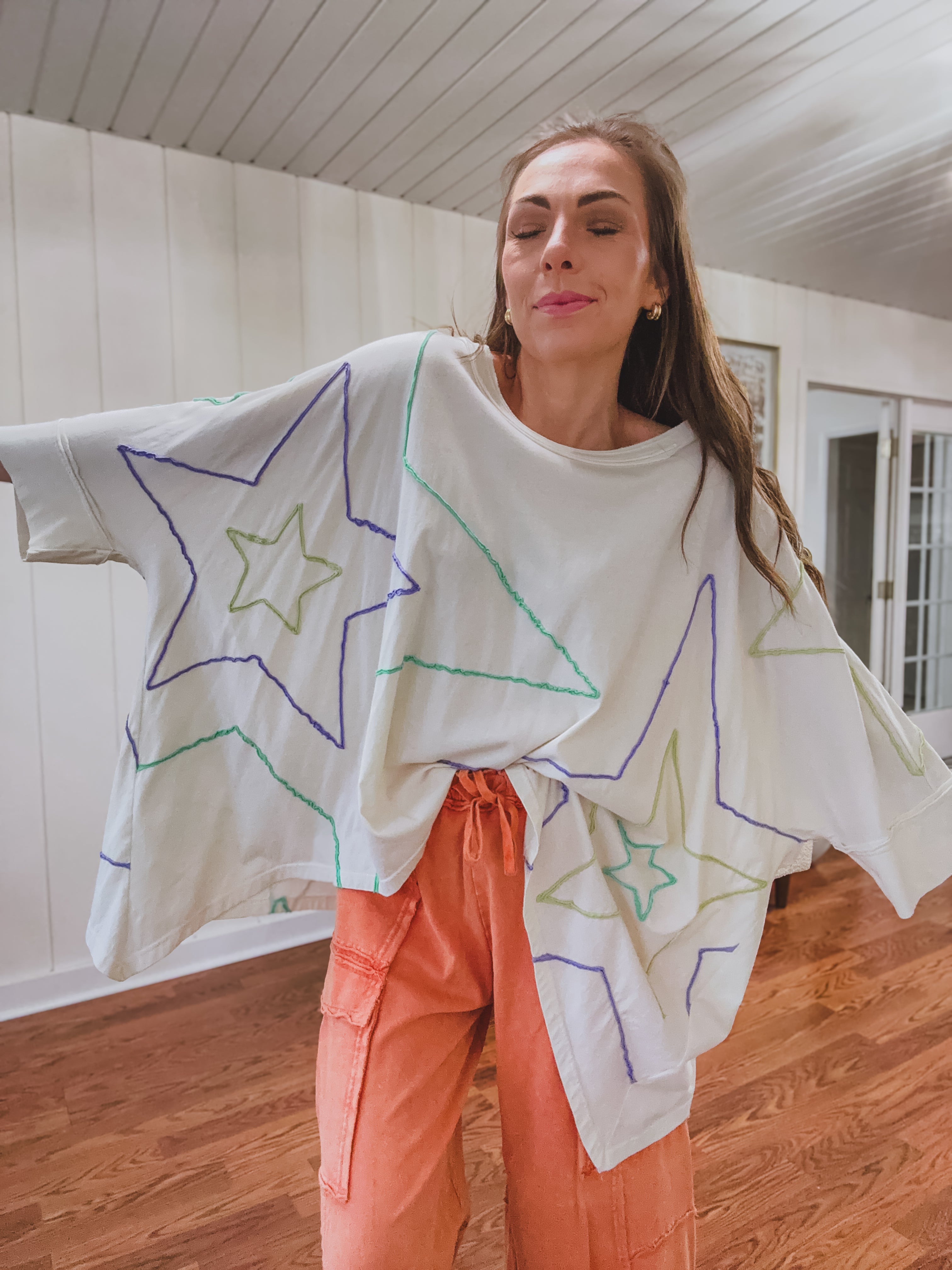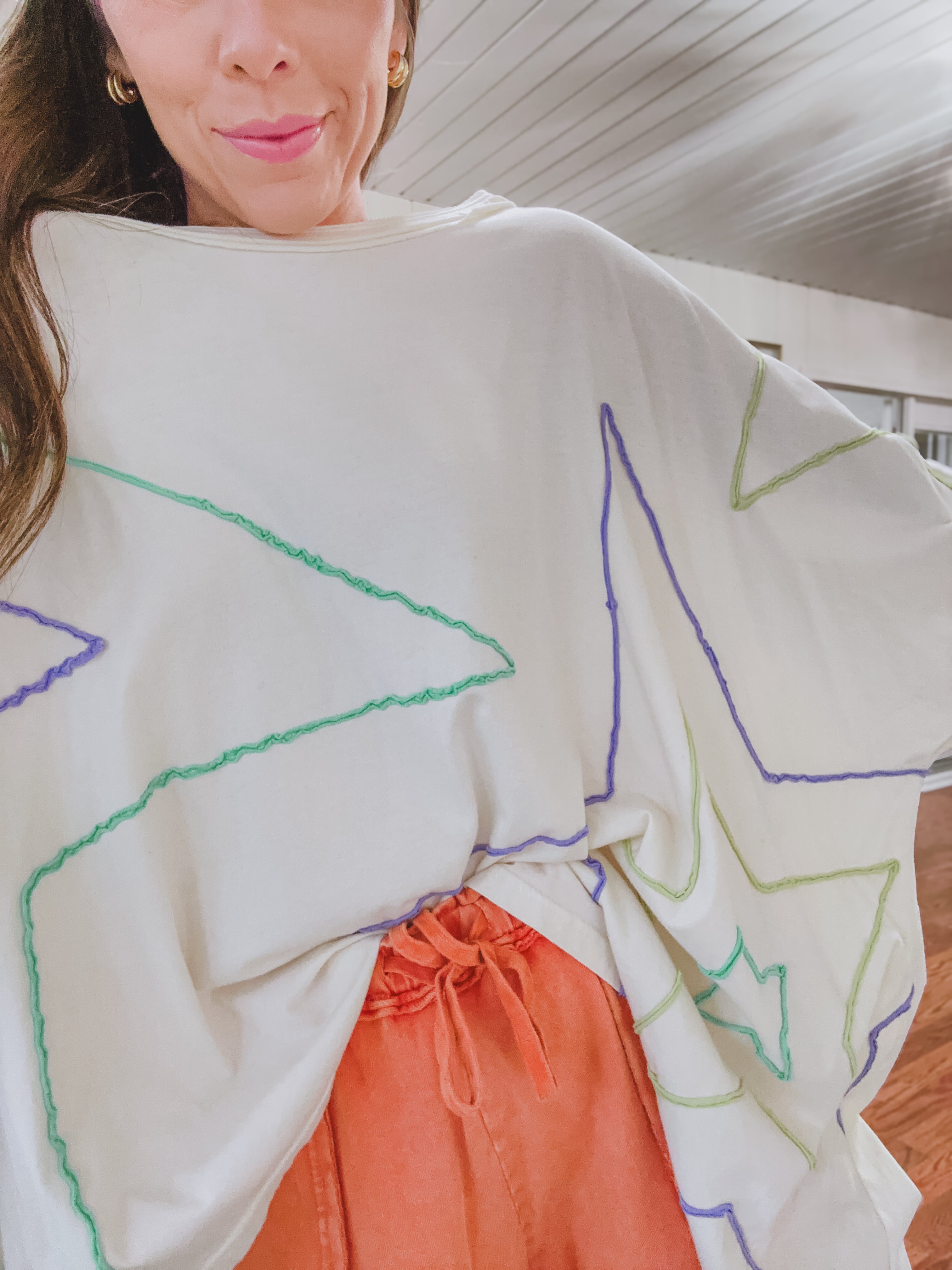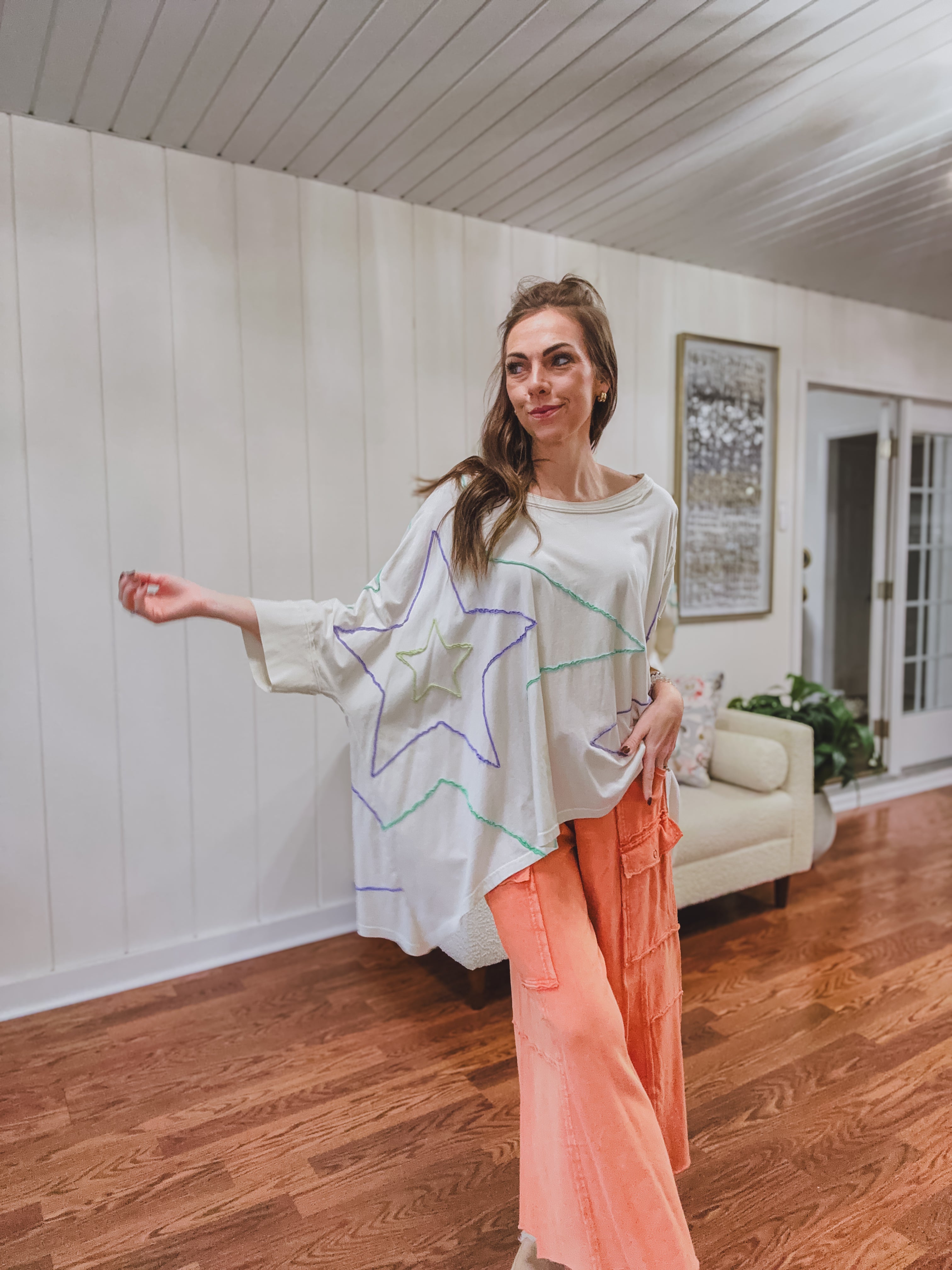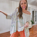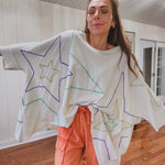 Embrace your inner celestial dreamer in this oversized dolman that celebrates bold self-expression. Crafted in a soft cream hue, this piece layers effortlessly over your favorite basics while the relaxed silhouette keeps you moving freely through your day. Perfect for those who refuse to dim their light—pair it with vibrant accessories and let your personality shine. Boho-inspired comfort meets modern functionality in a top that's as fun as you are.