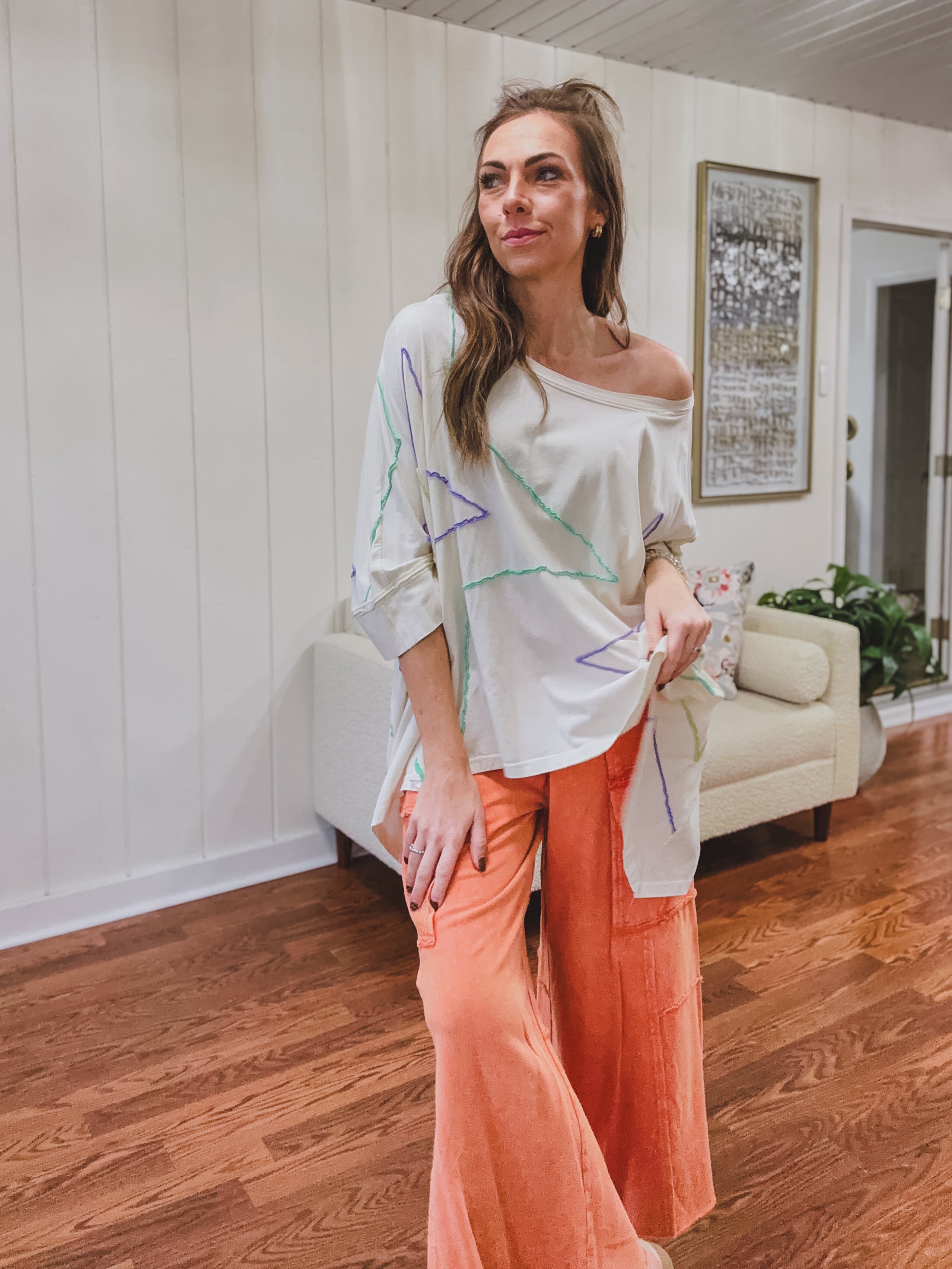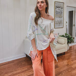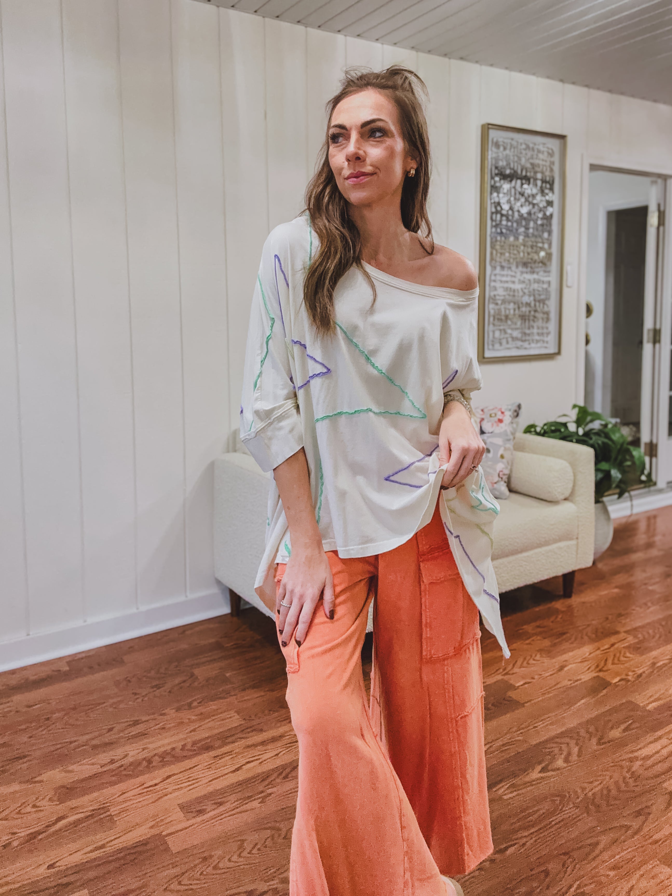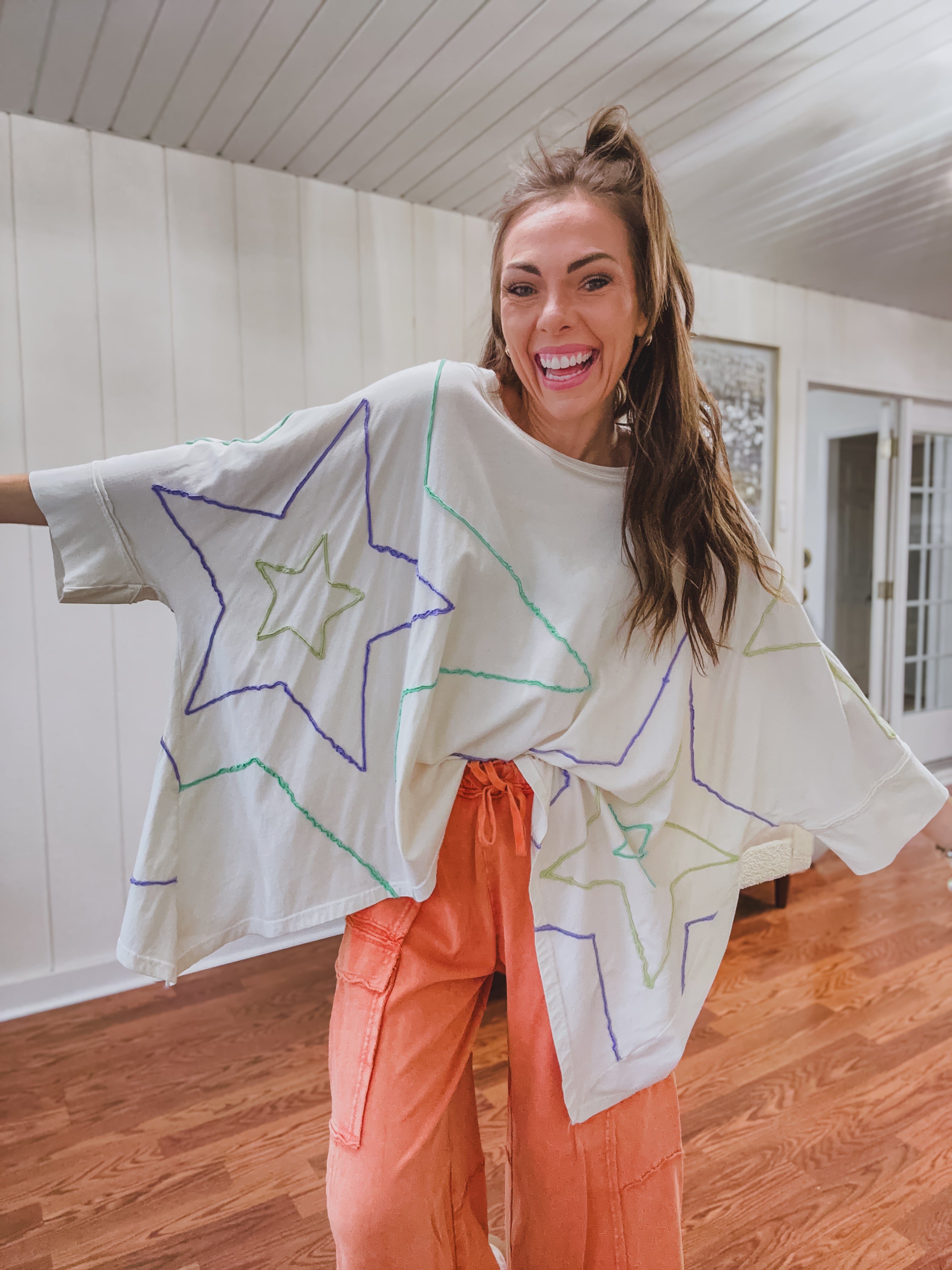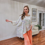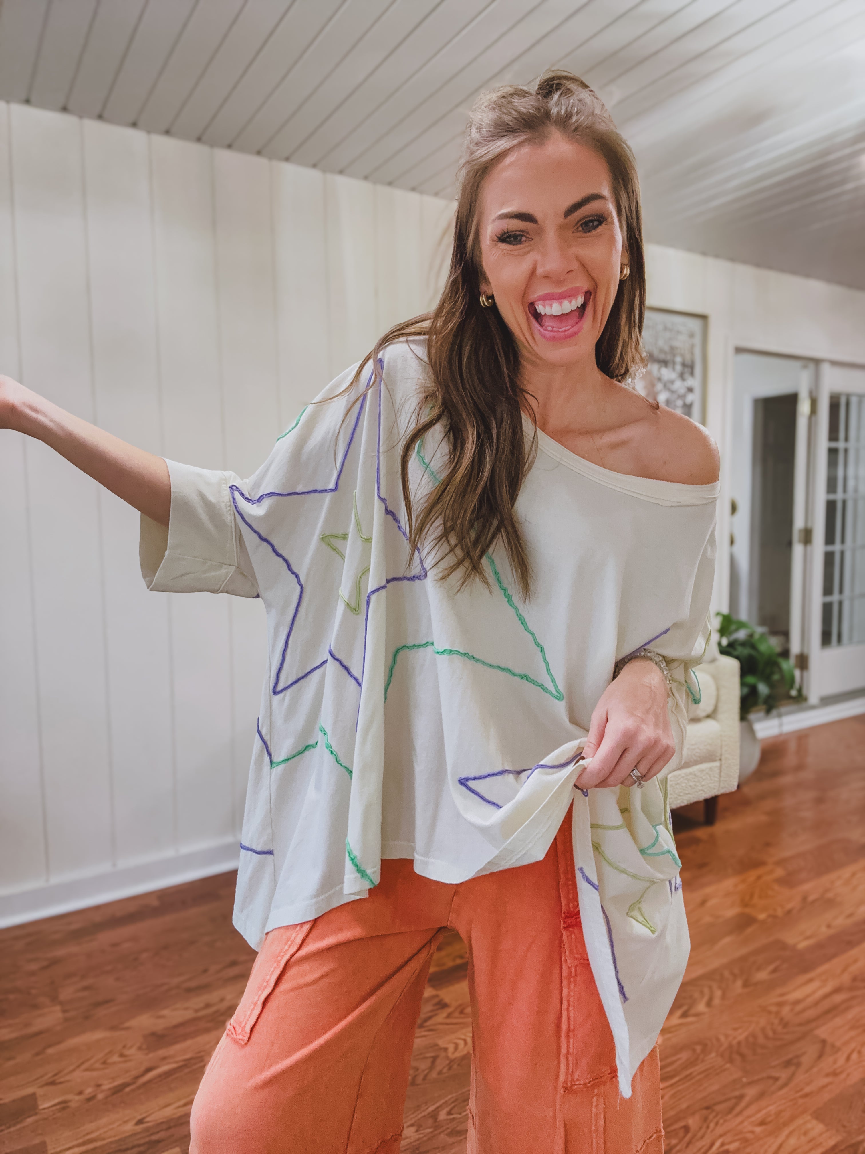 Embrace your inner celestial dreamer in this oversized dolman that celebrates bold self-expression. Crafted in a soft cream hue, this piece layers effortlessly over your favorite basics while the relaxed silhouette keeps you moving freely through your day. Perfect for those who refuse to dim their light—pair it with vibrant accessories and let your personality shine. Boho-inspired comfort meets modern functionality in a top that's as fun as you are.