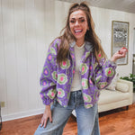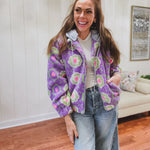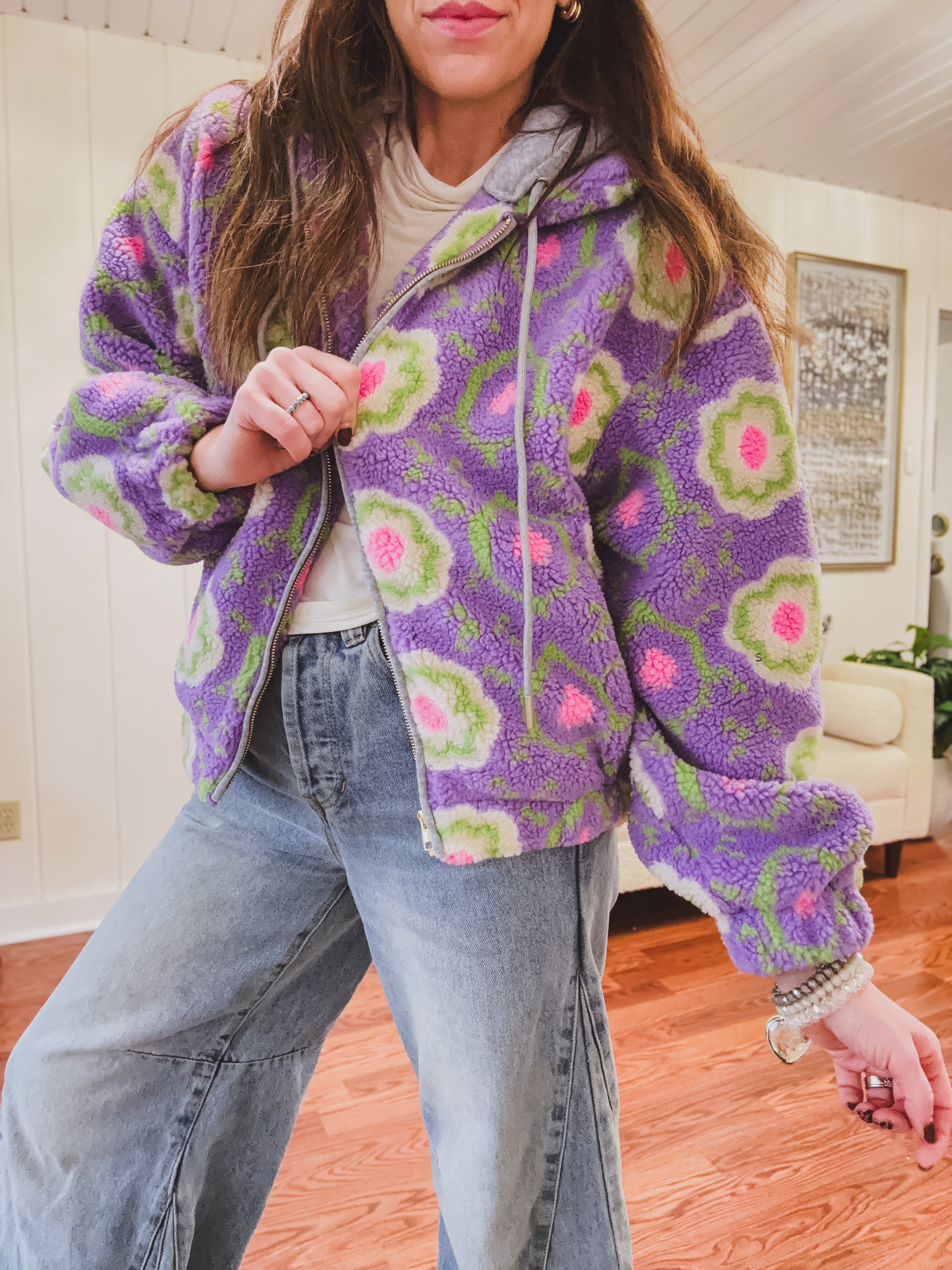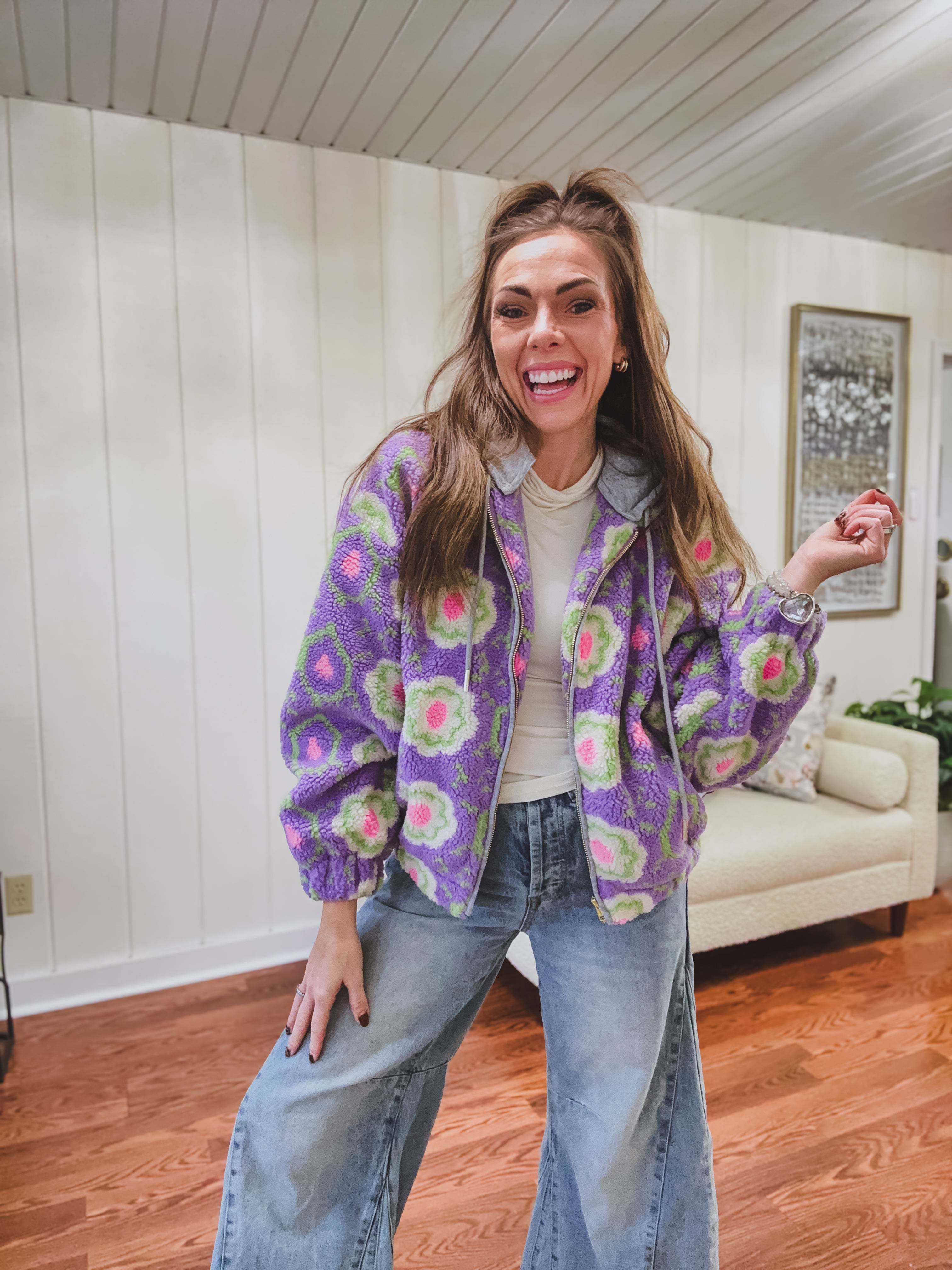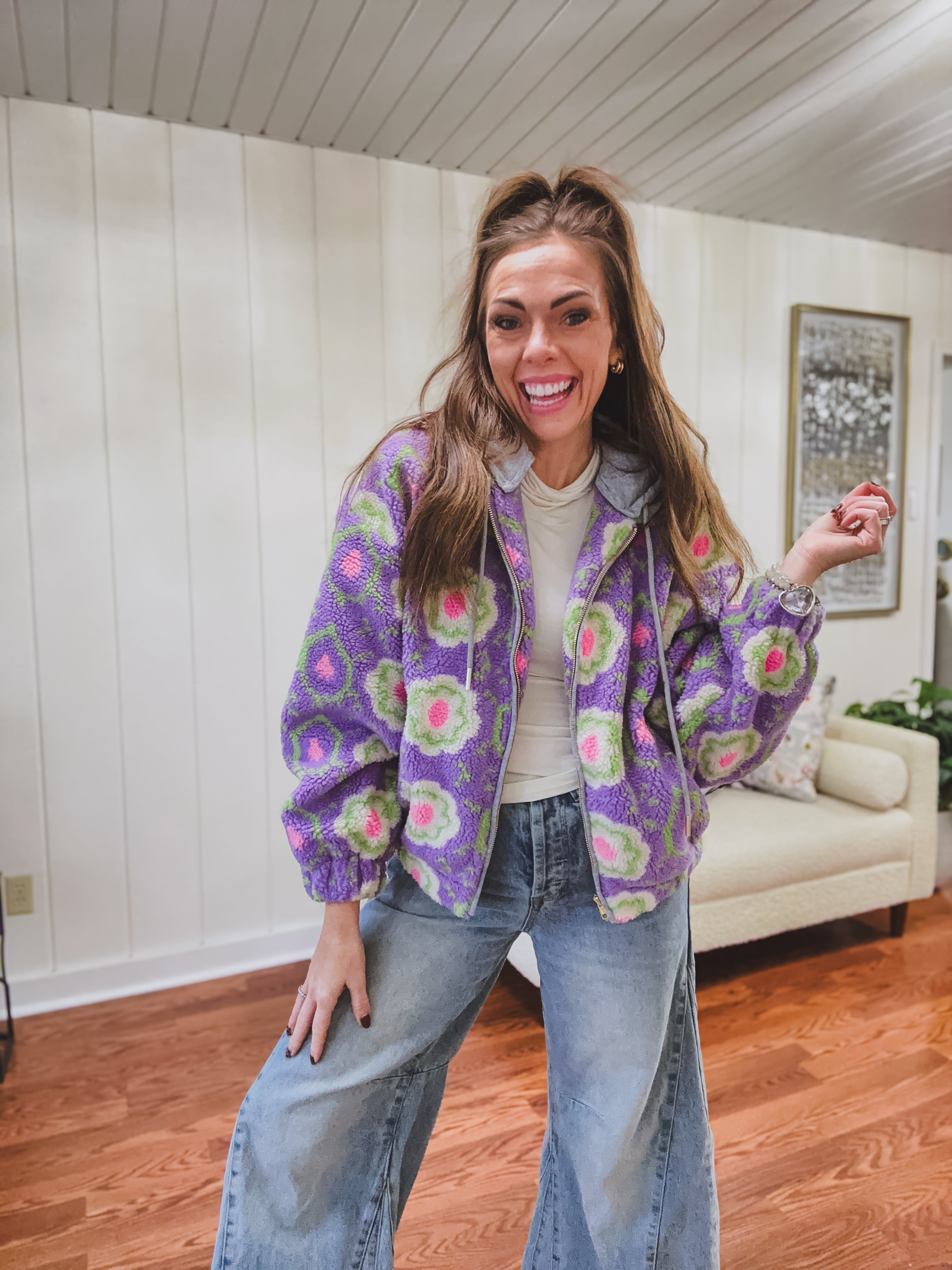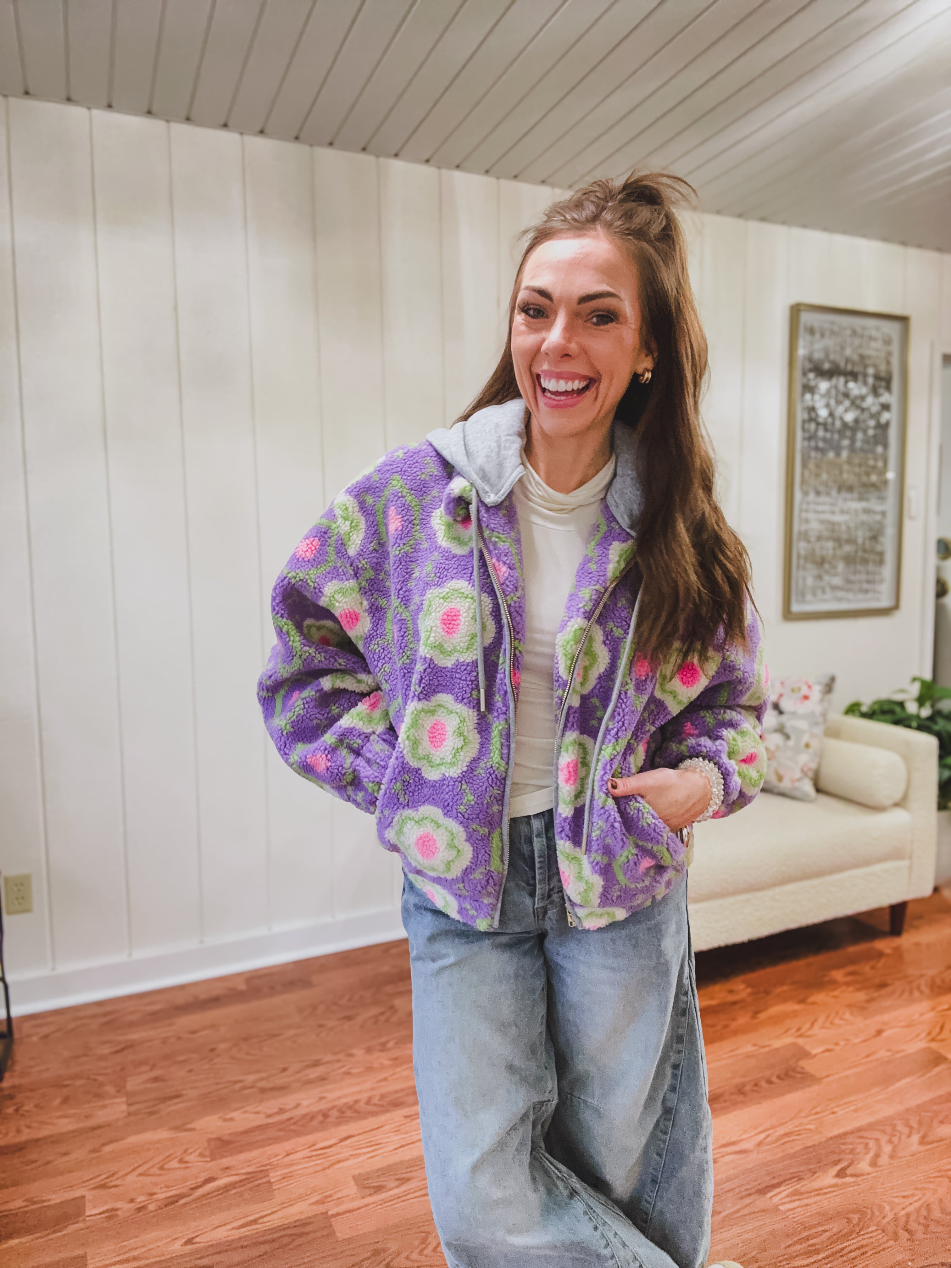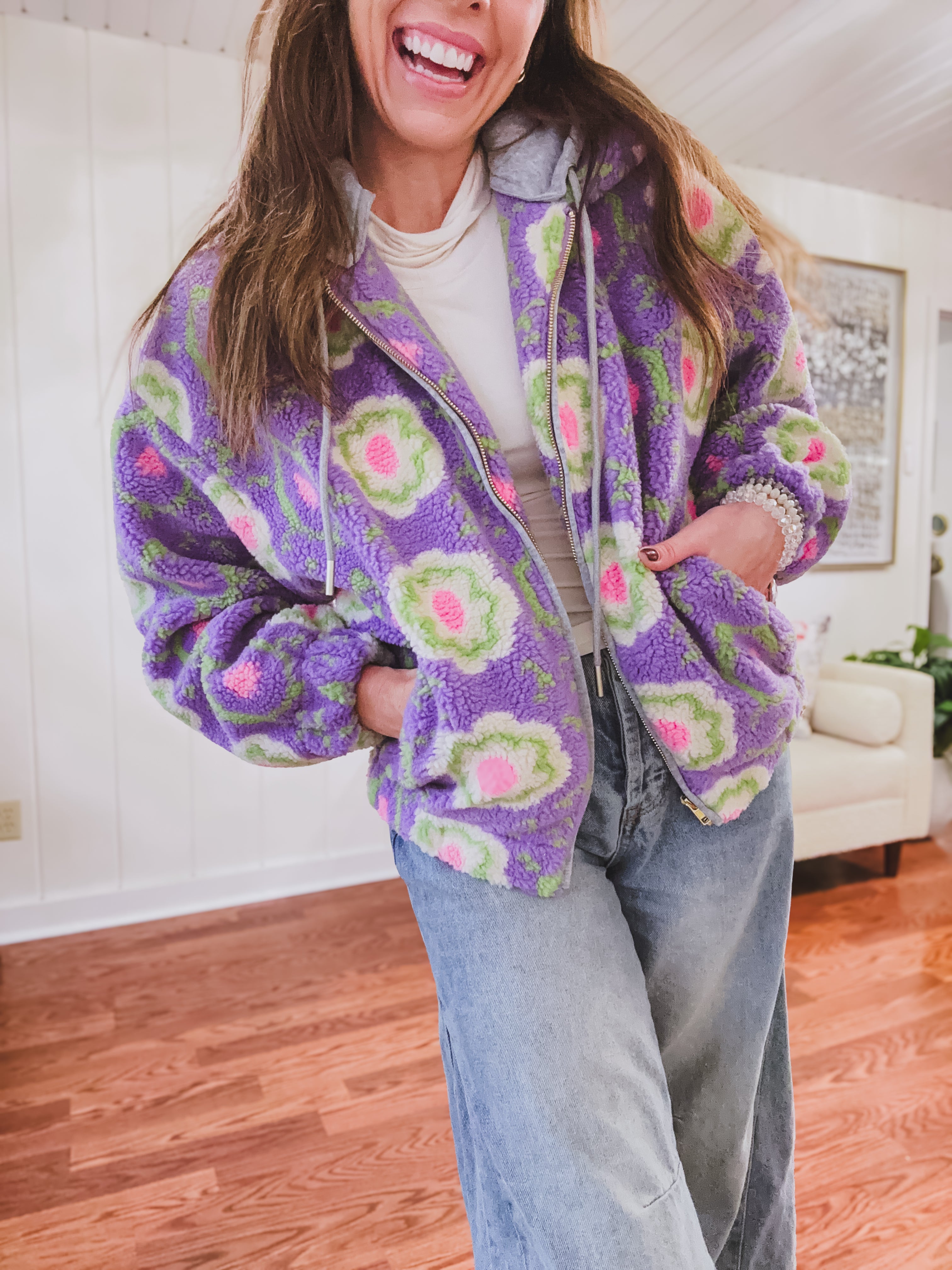 Wrap yourself in comfort with this playful sherpa jacket that brings the garden indoors. Featuring a vibrant lavender base adorned with green, pink, and ivory florals, it's the perfect blend of bold and cozy. The detachable grey hoodie with drawstring adds versatility, while the gold zipper, functional pockets, and elastic waistband and cuffs keep things casual and put-together. Layer it, wear it solo—this jacket adapts to your mood.
